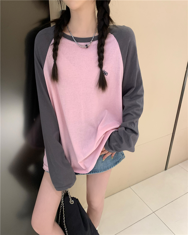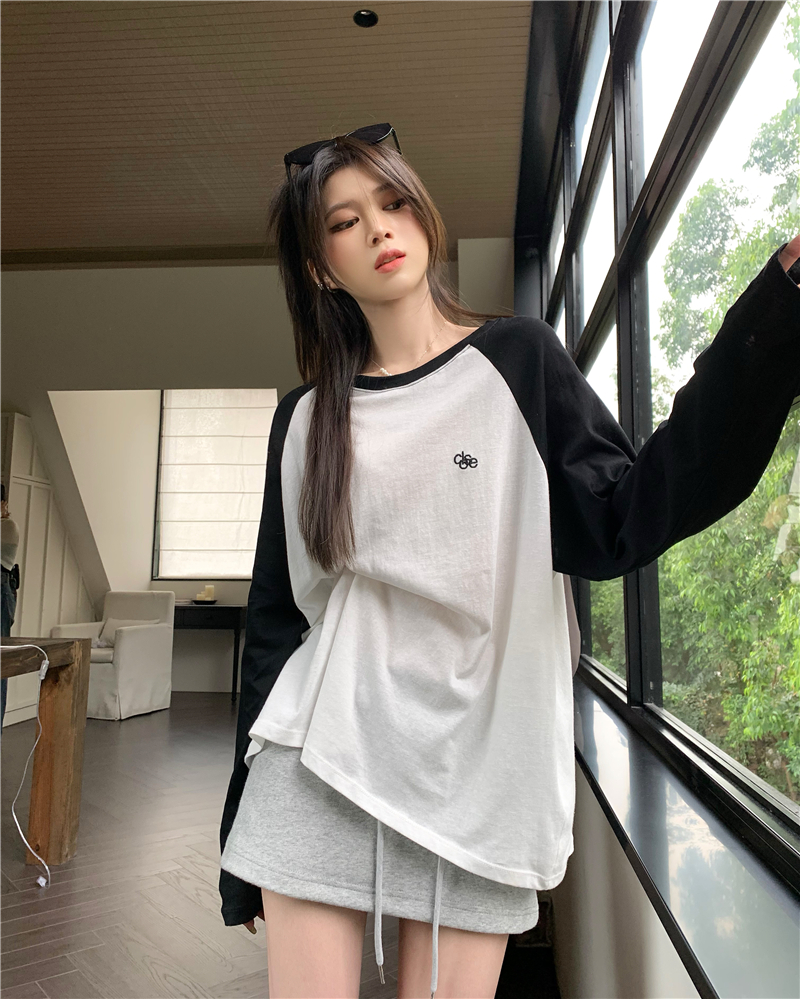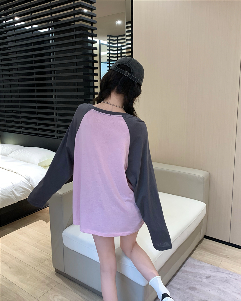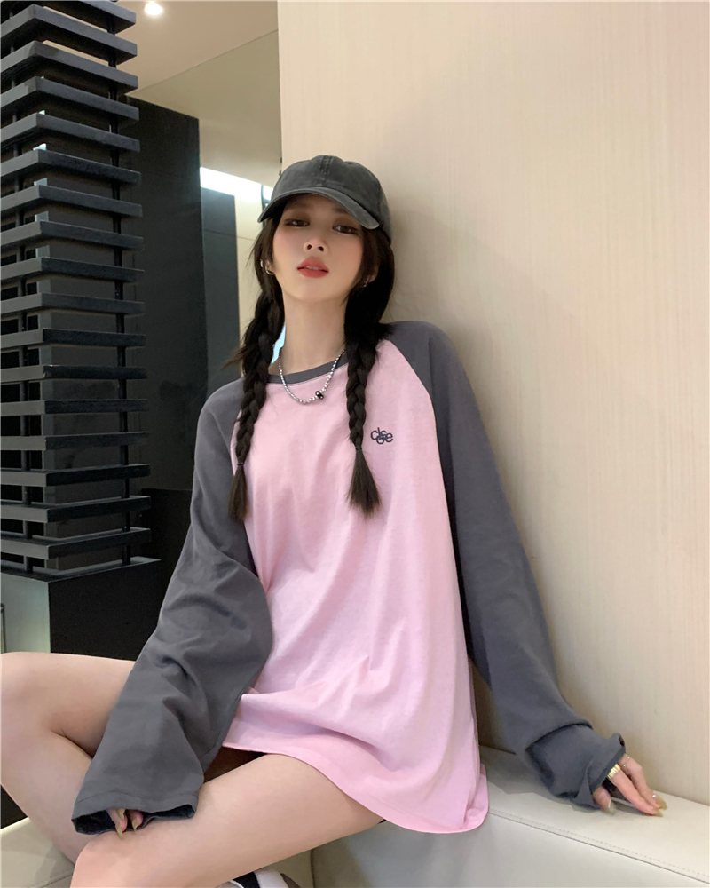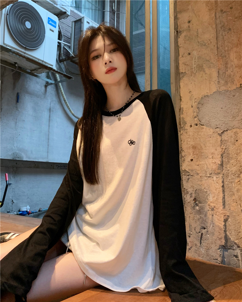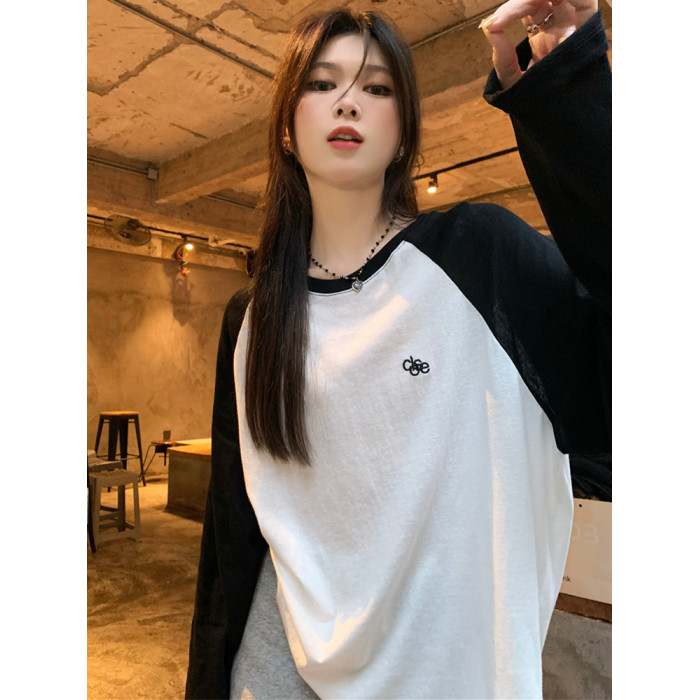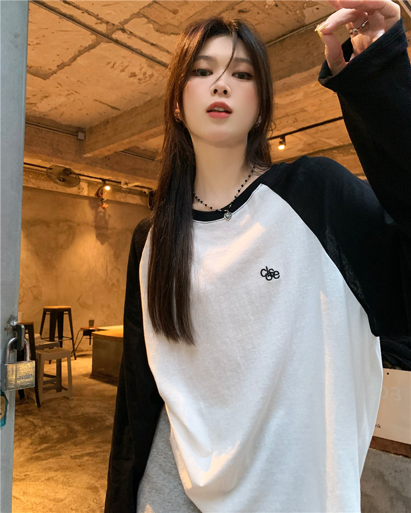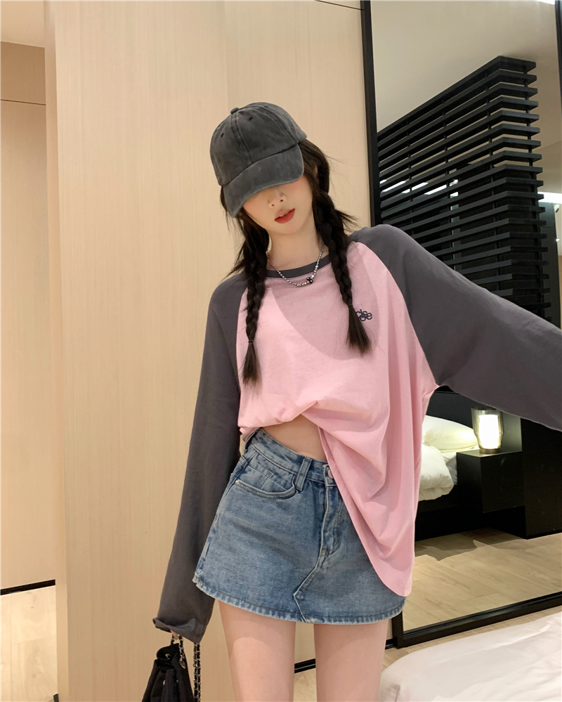 韓版時尚薄款插肩袖字母T恤防曬衣女夏季拼接寬松撞色長袖上衣ins