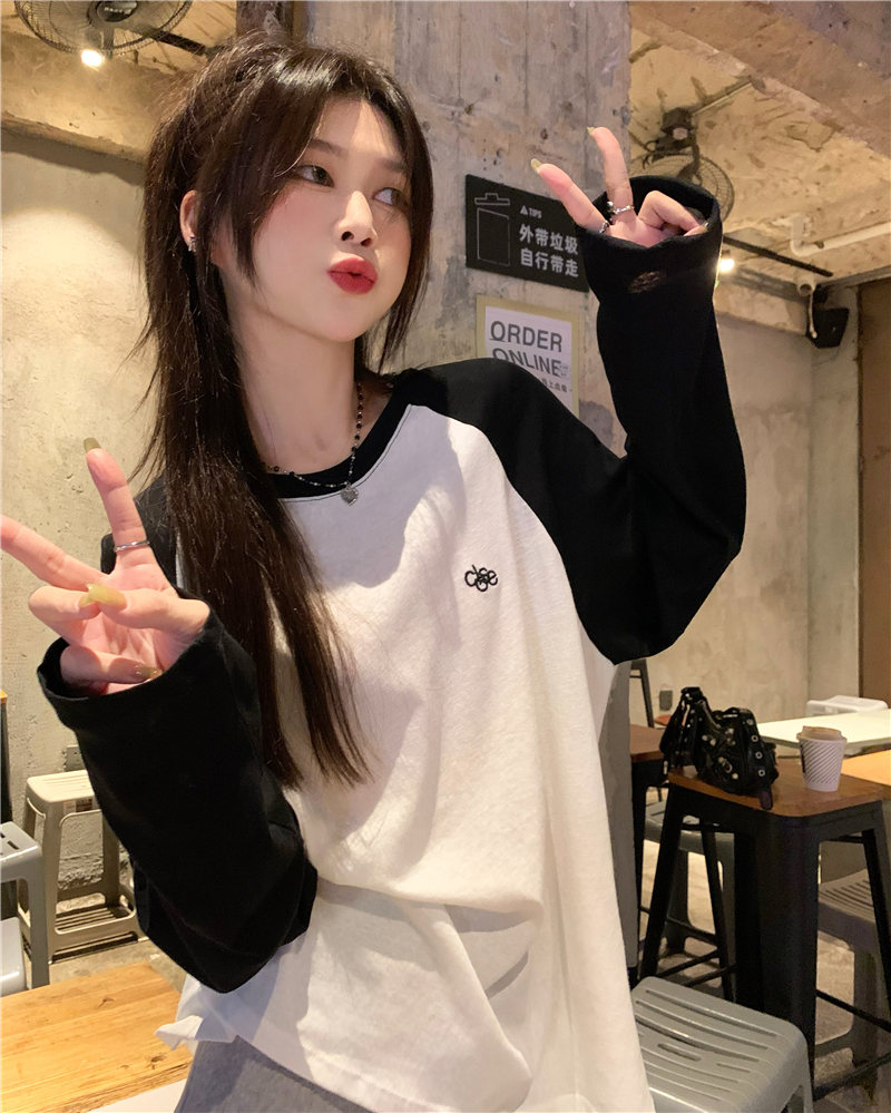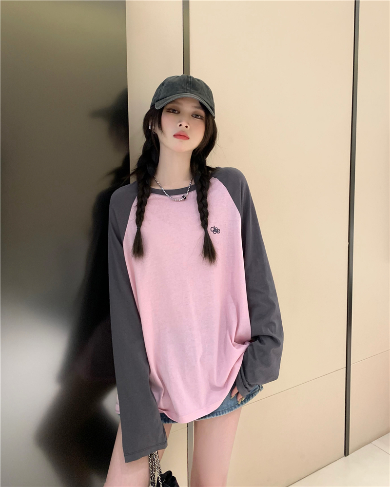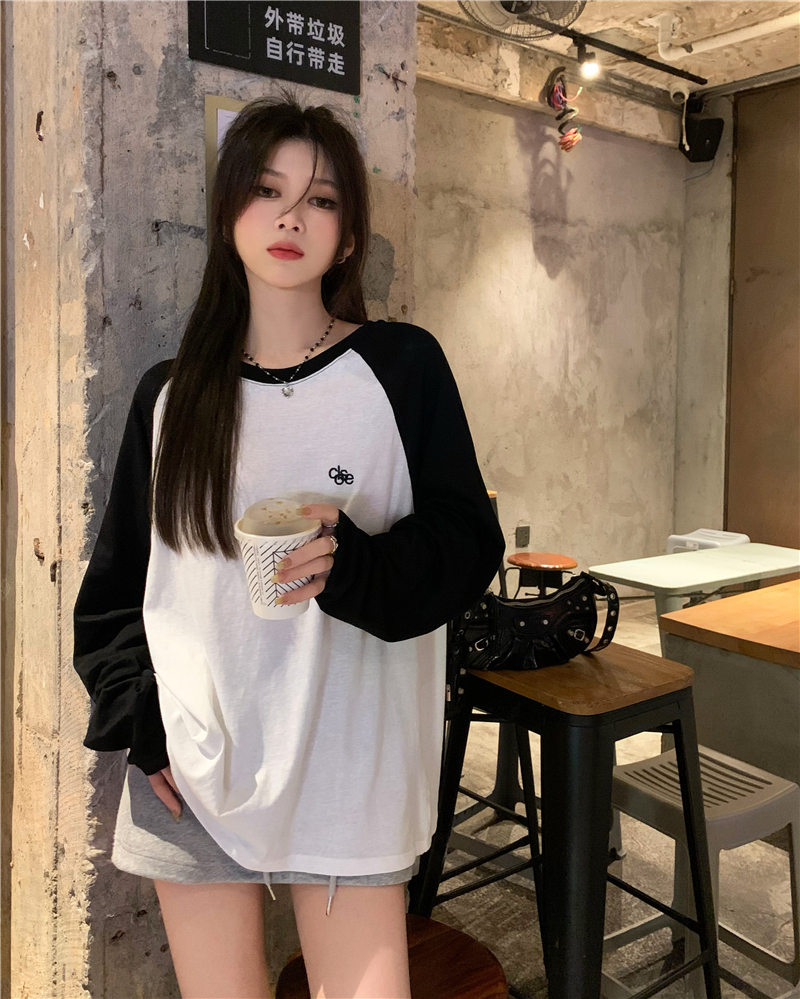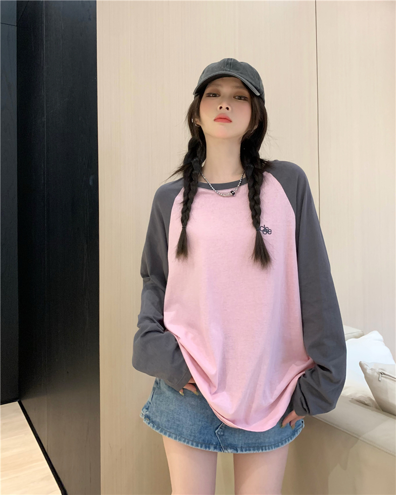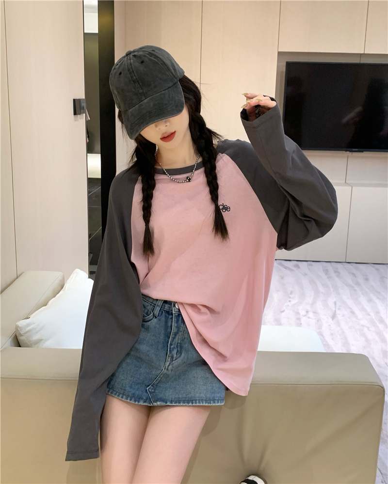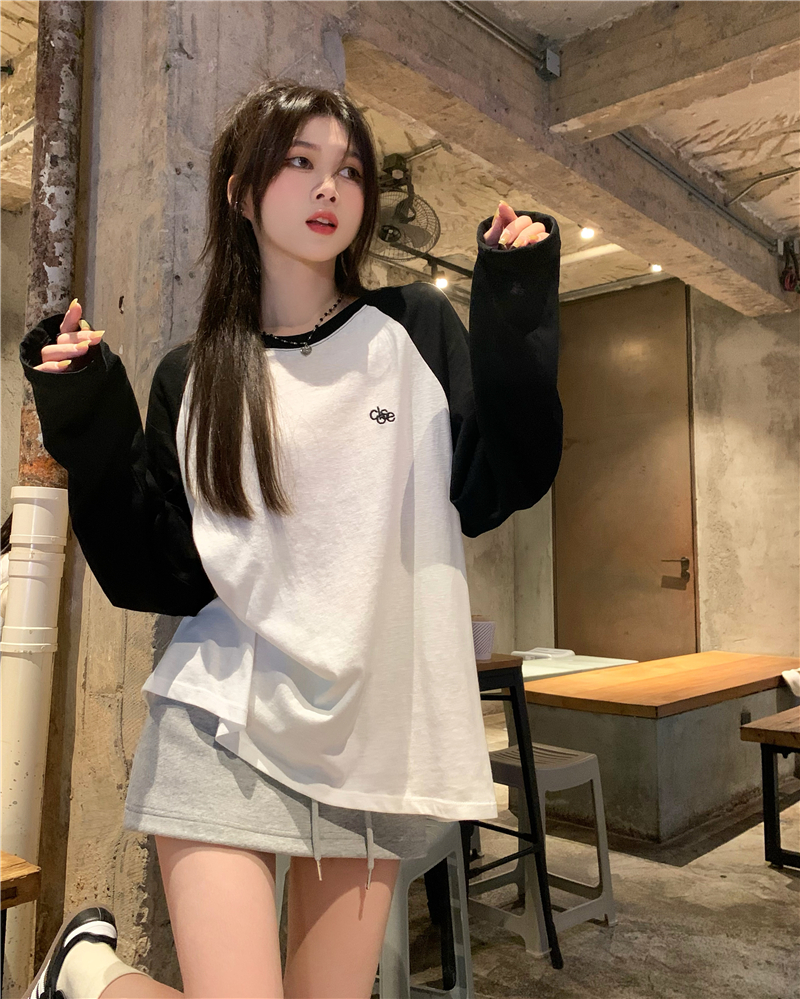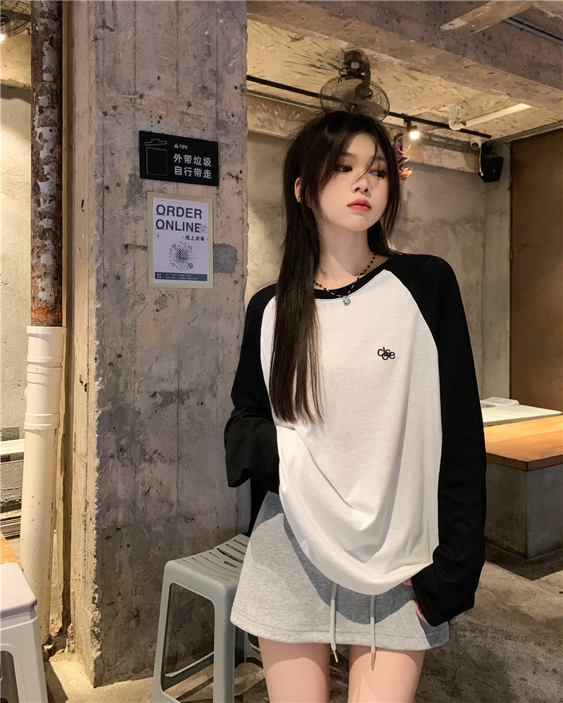 韓版時尚薄款插肩袖字母T恤防曬衣女夏季拼接寬松撞色長袖上衣ins