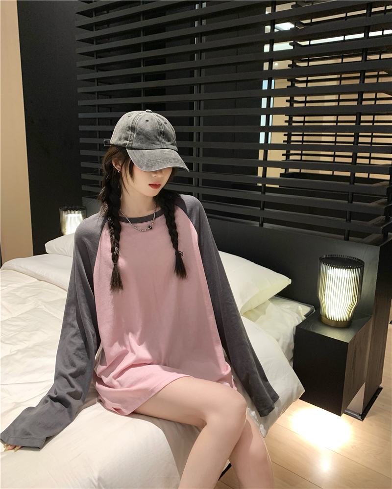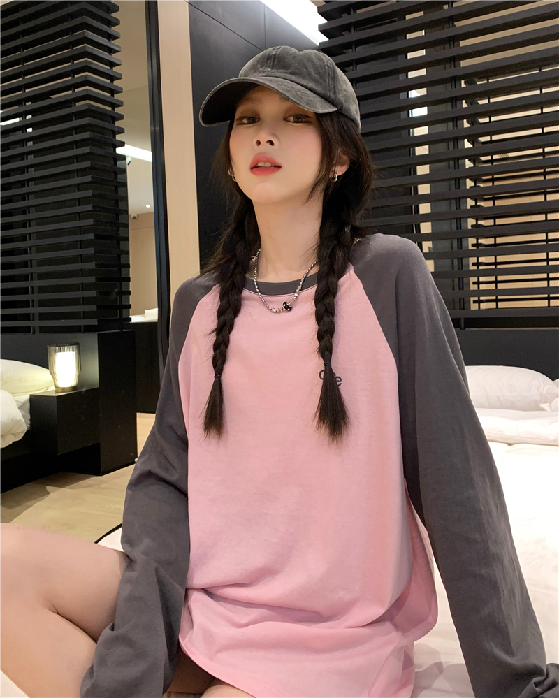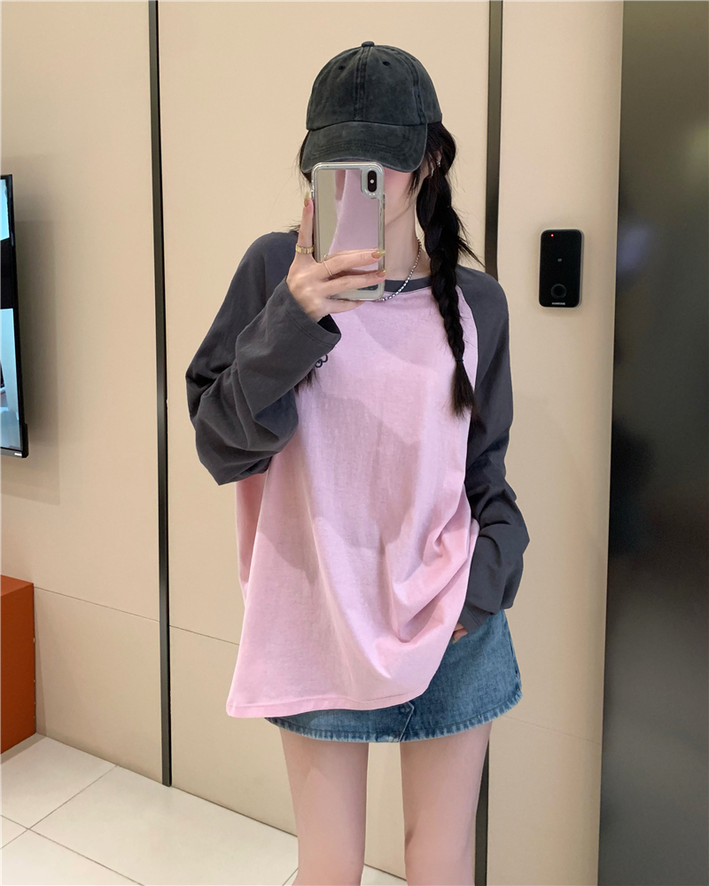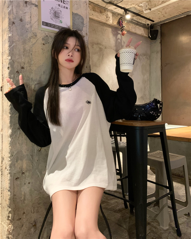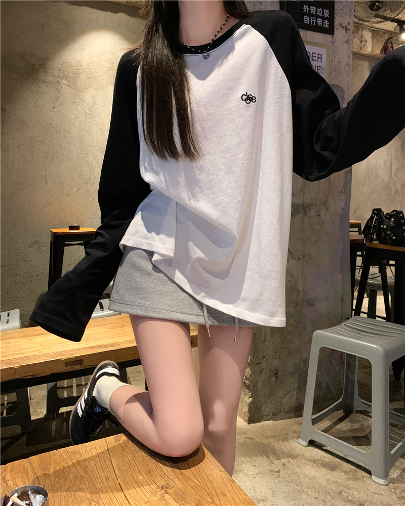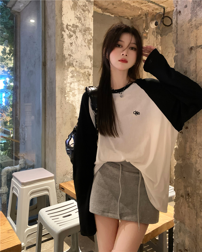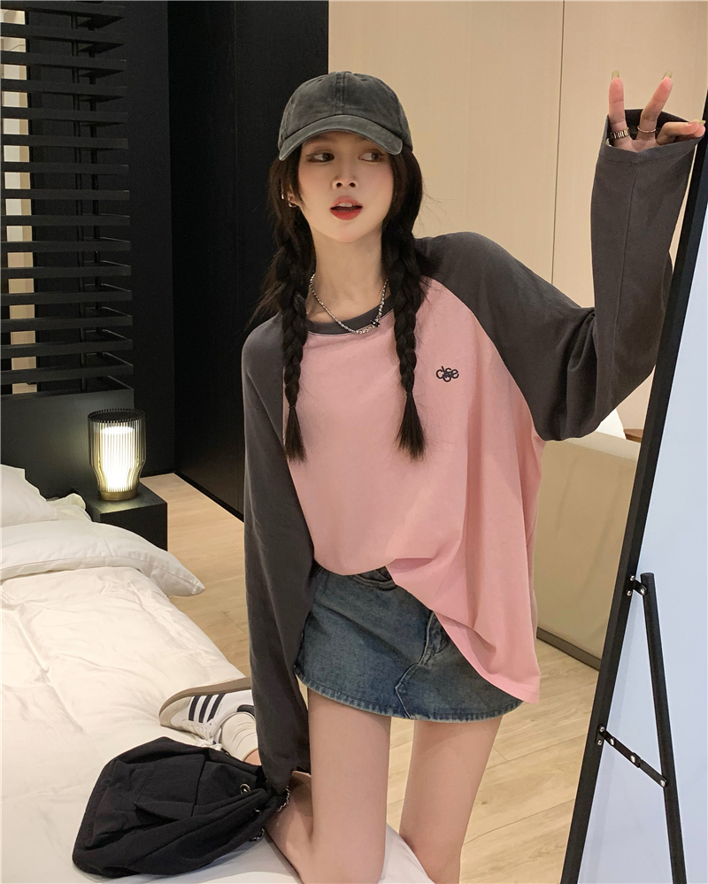 韓版時尚薄款插肩袖字母T恤防曬衣女夏季拼接寬松撞色長袖上衣ins