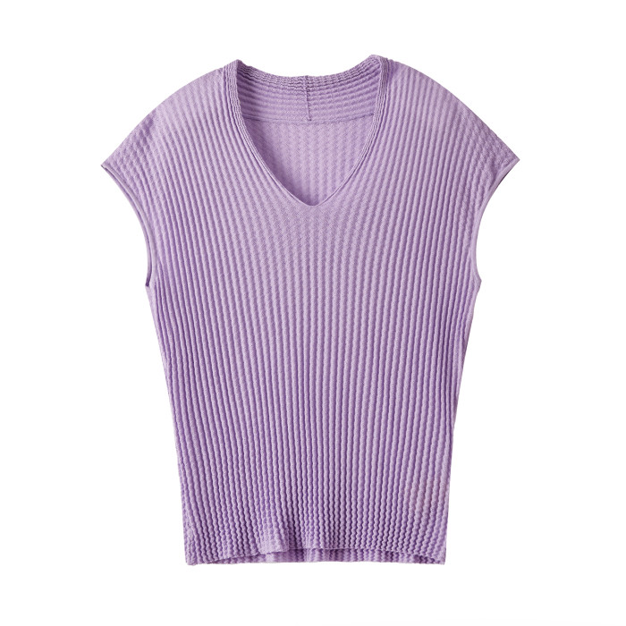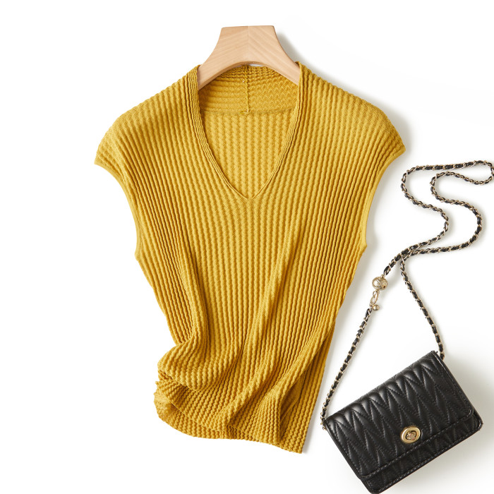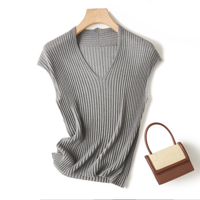 褶皺抗皺肌理 遮肉彈力顯瘦一分袖V領天絲棉針織衫女T恤上衣夏季