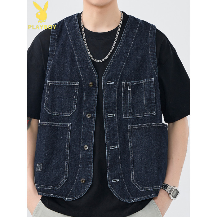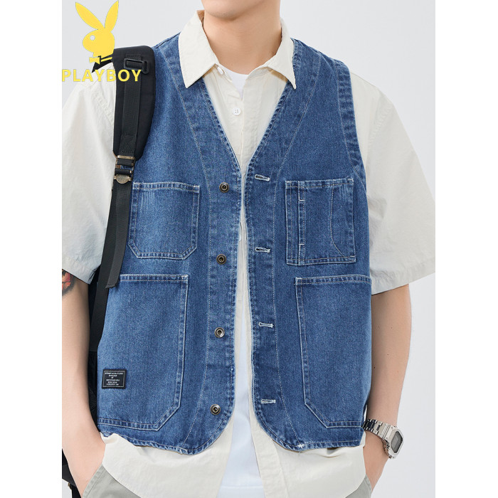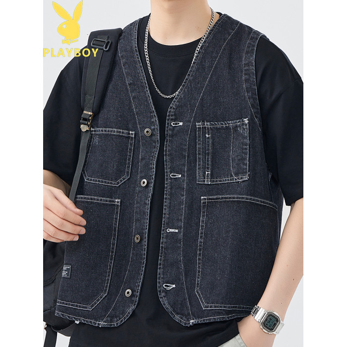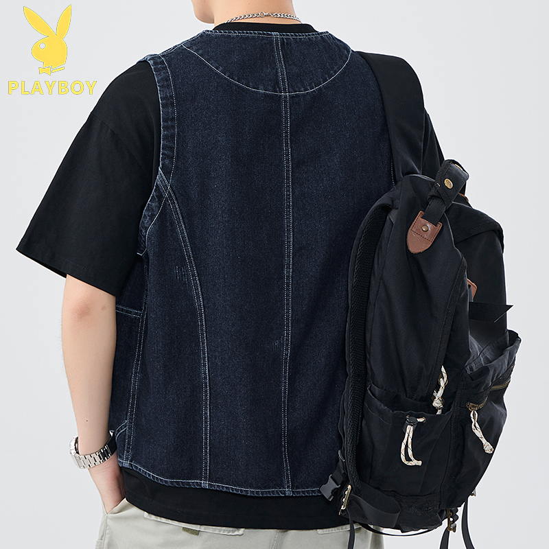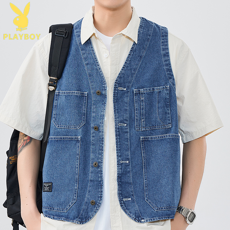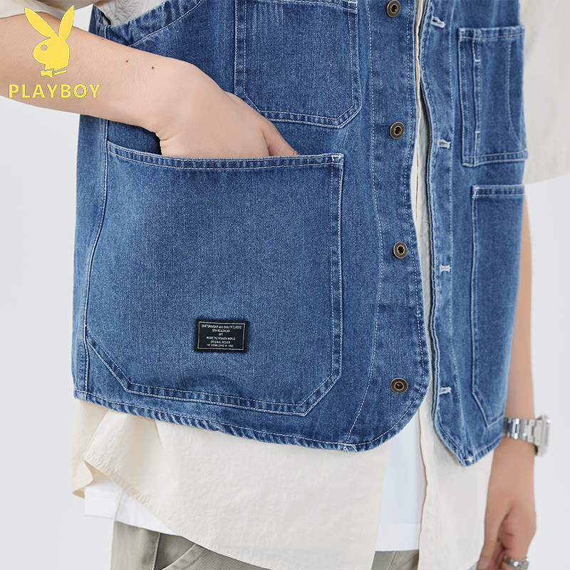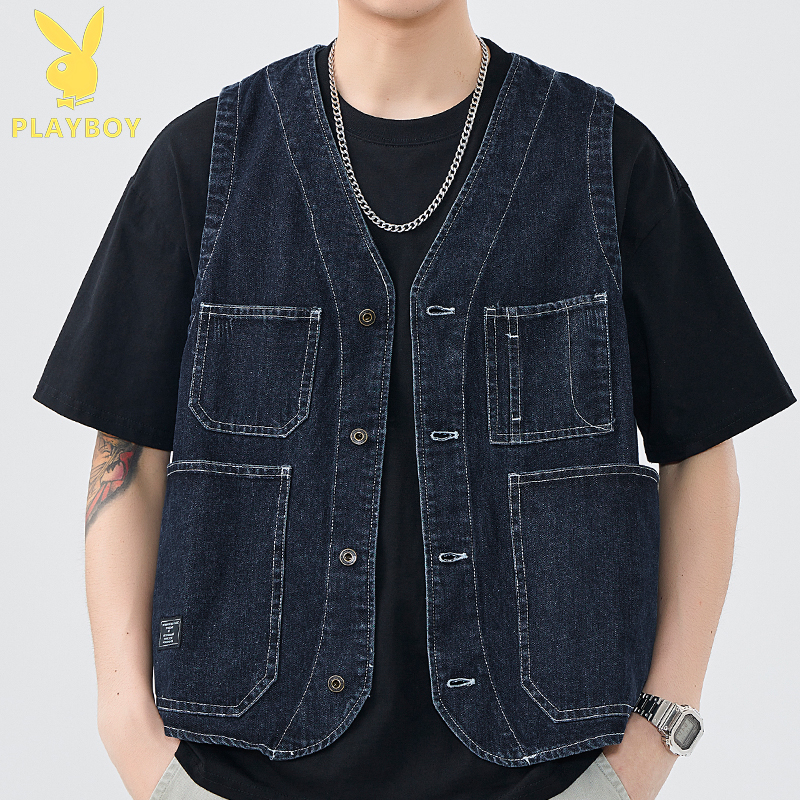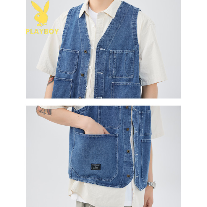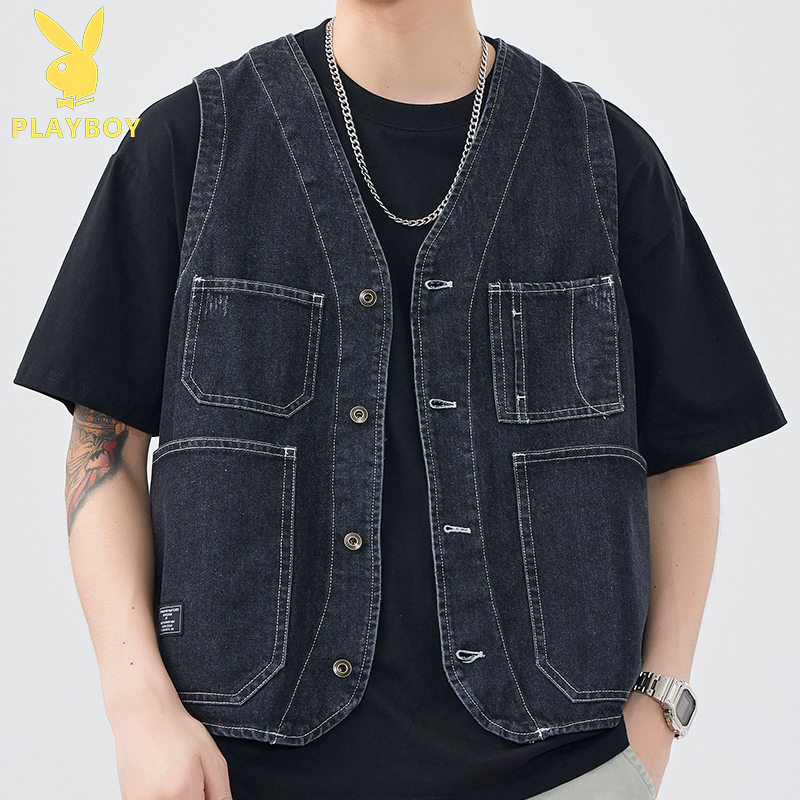 花花公子品牌夏季純棉工裝牛仔馬甲大口袋v領休閒無袖坎肩馬夾男