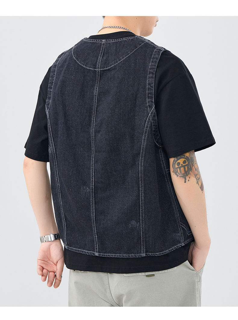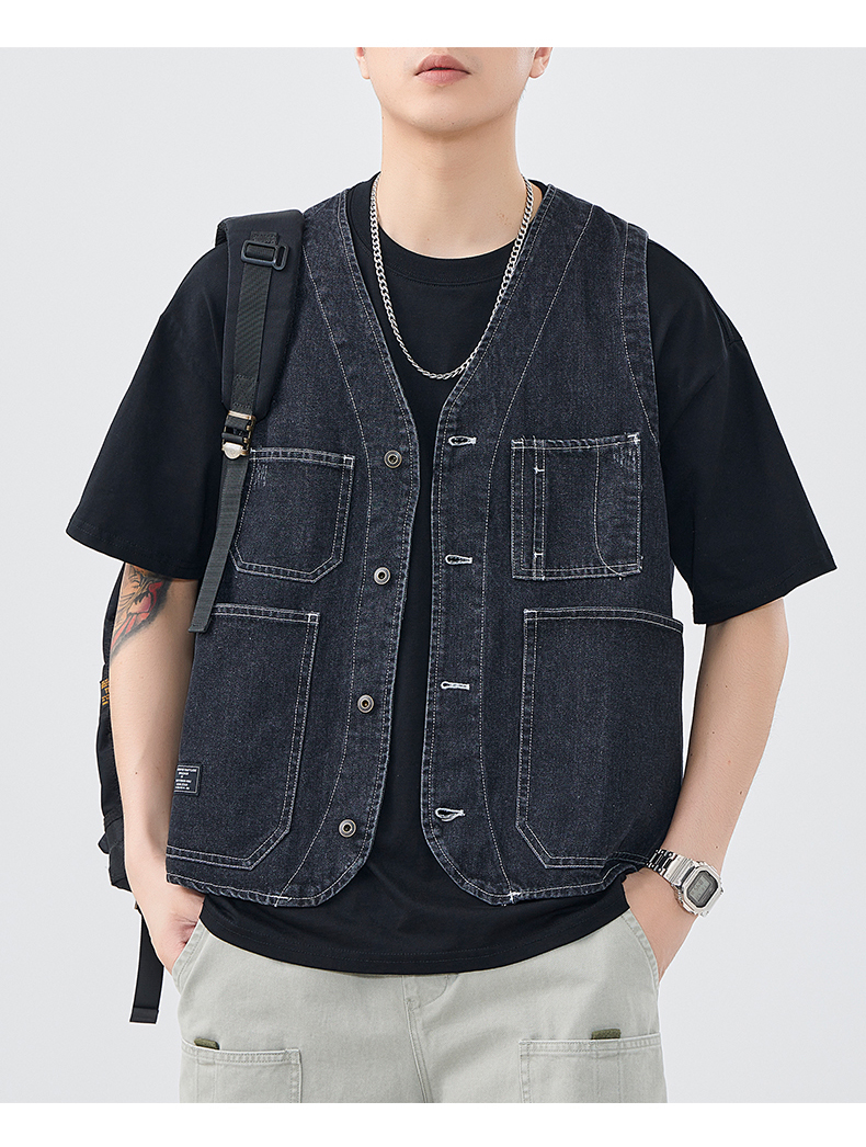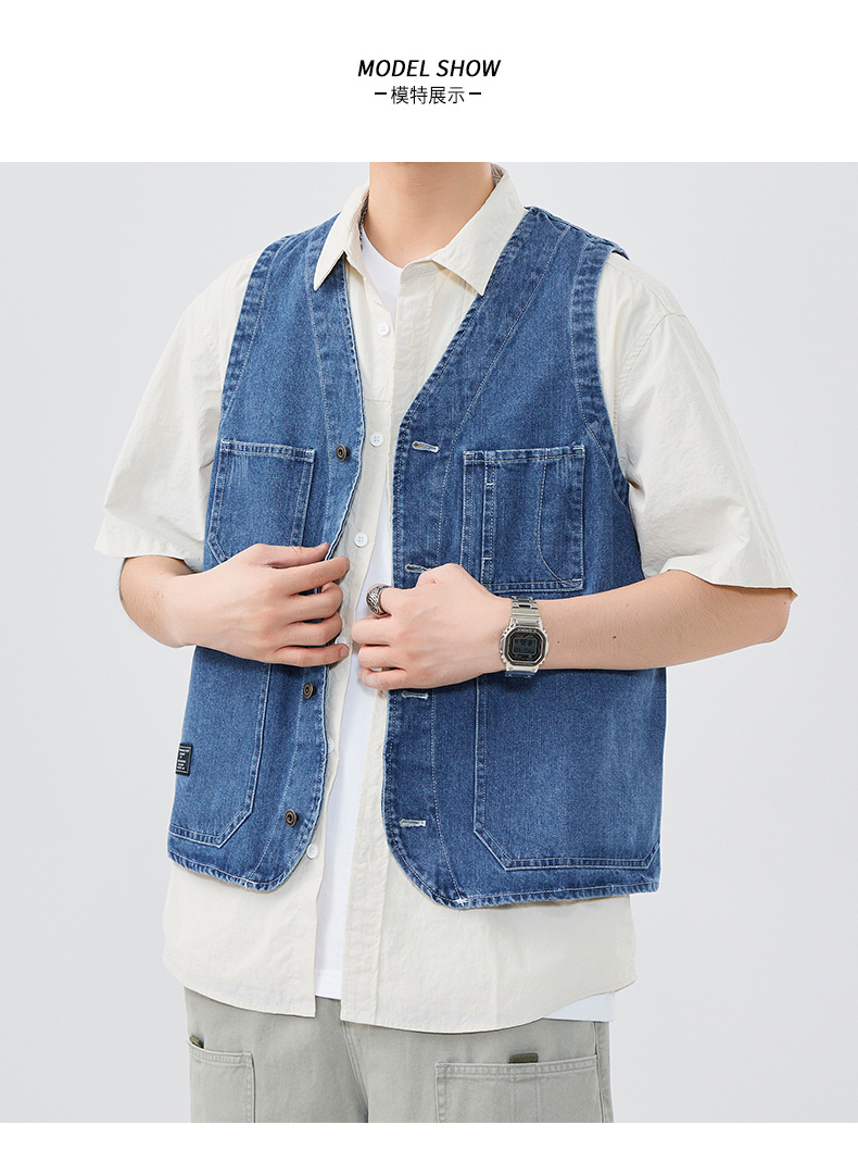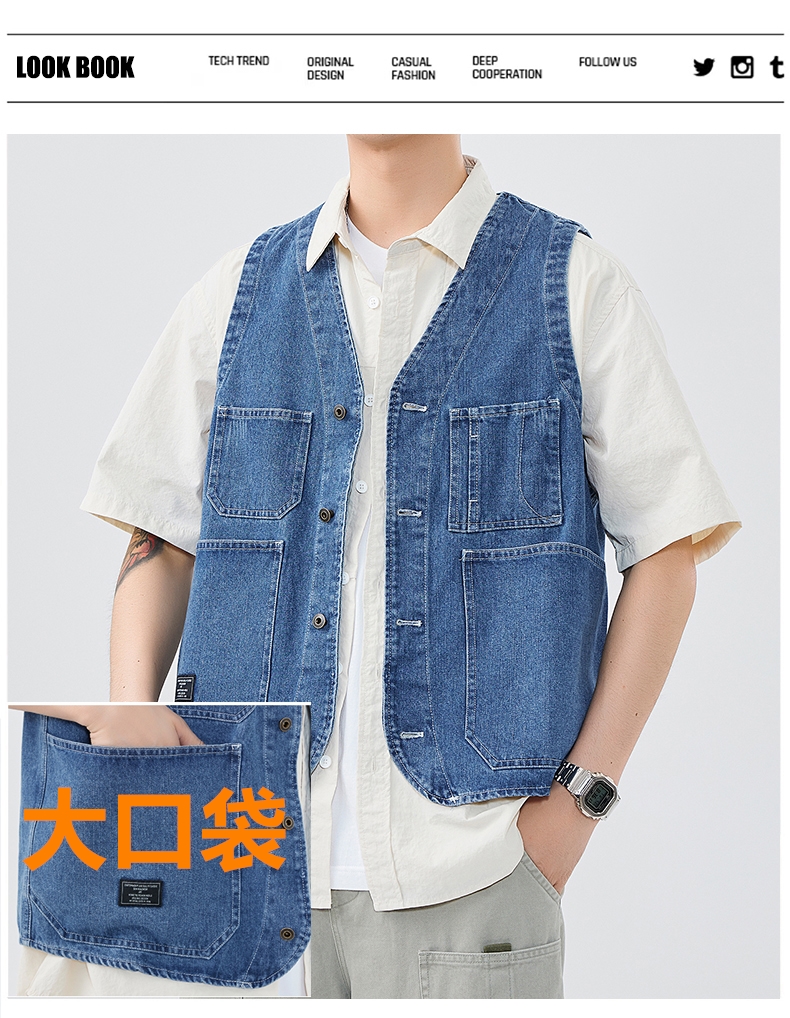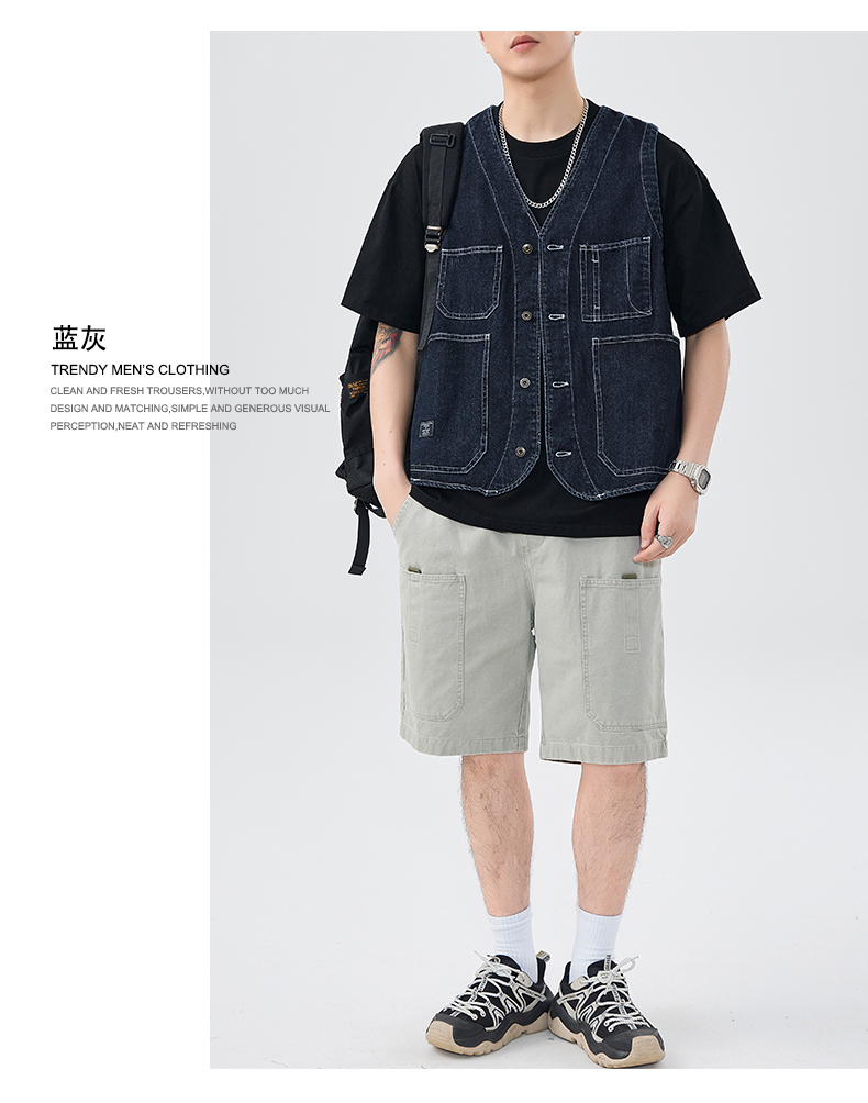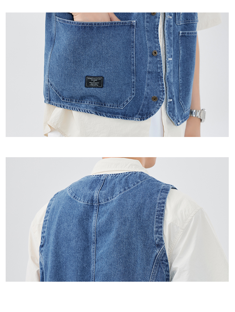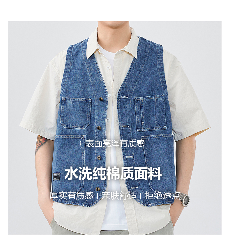 花花公子品牌夏季純棉工裝牛仔馬甲大口袋v領休閒無袖坎肩馬夾男