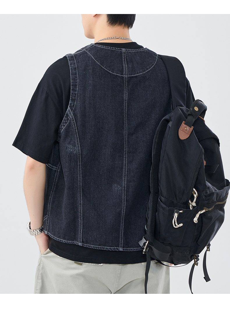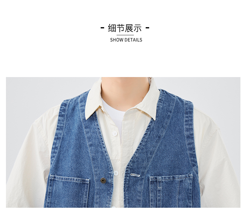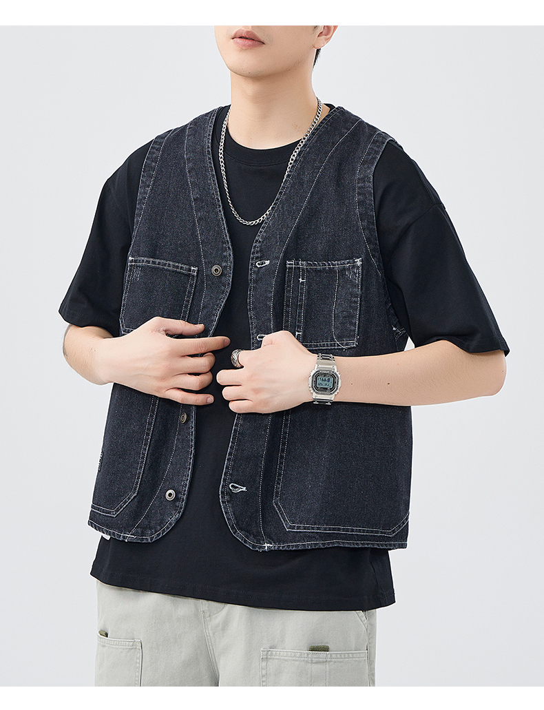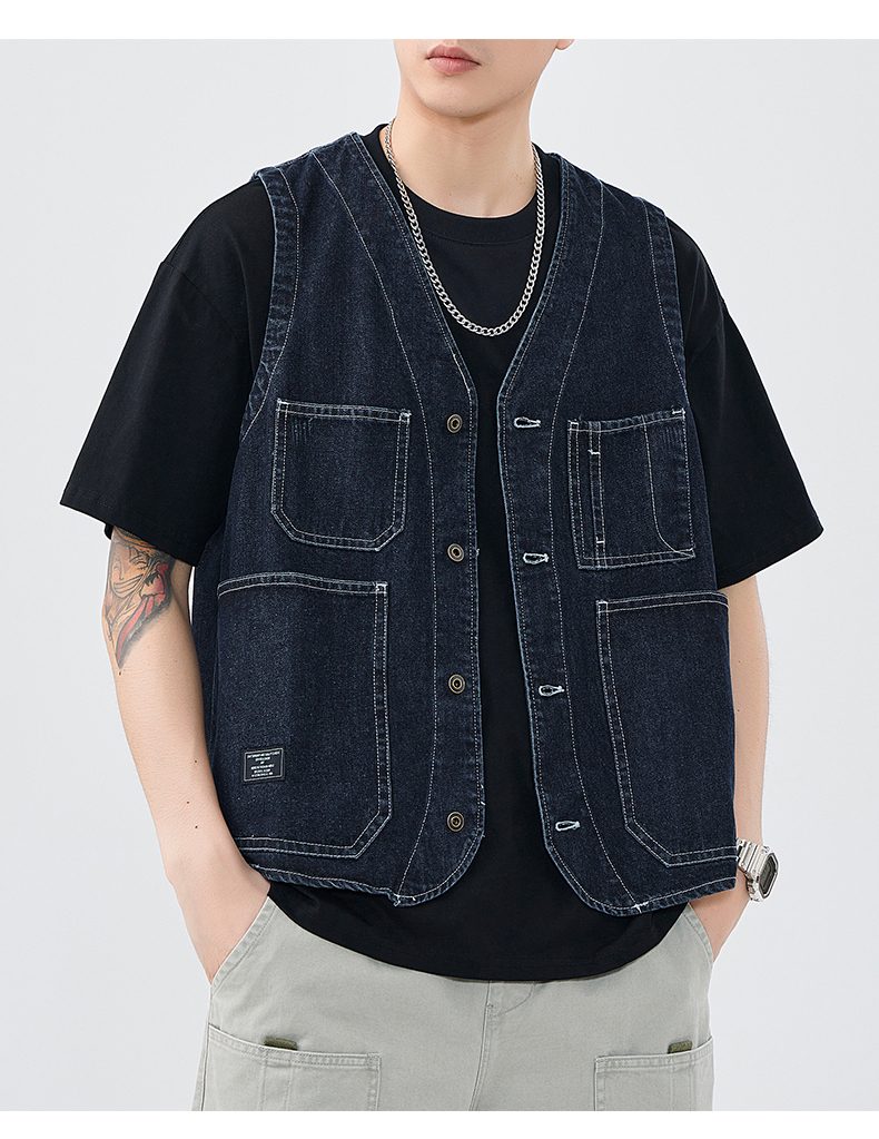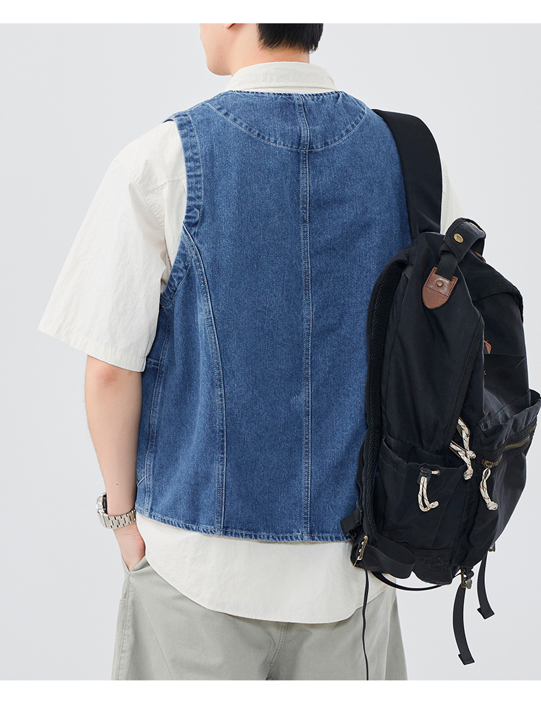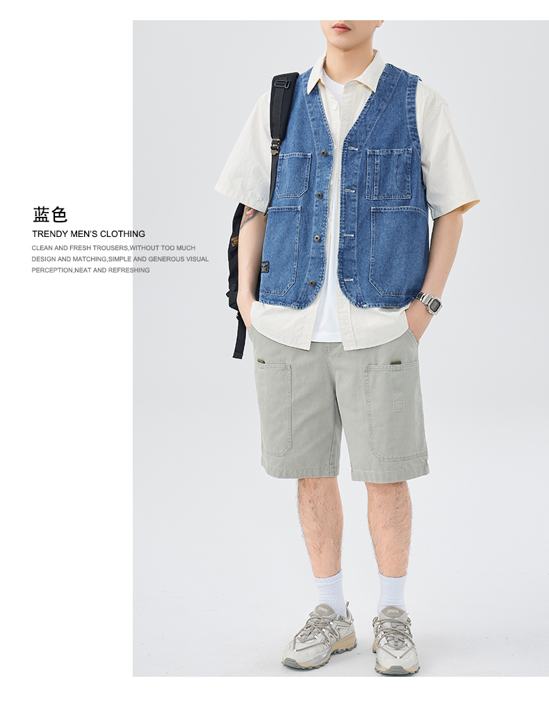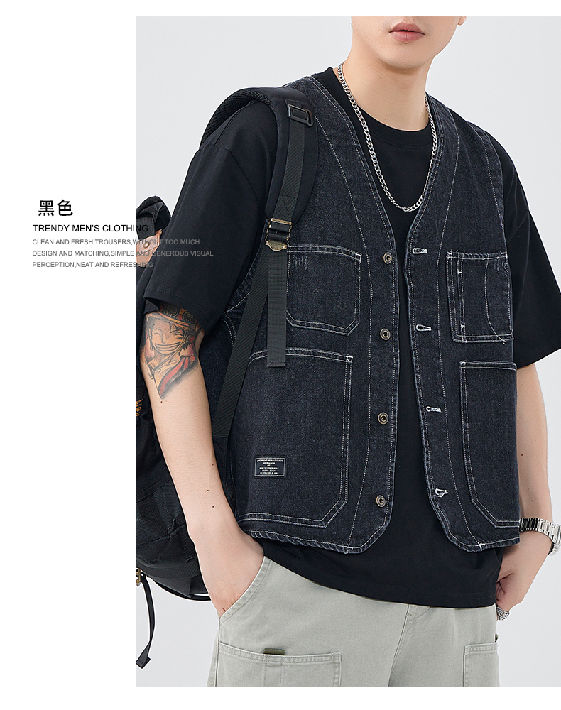 花花公子品牌夏季純棉工裝牛仔馬甲大口袋v領休閒無袖坎肩馬夾男