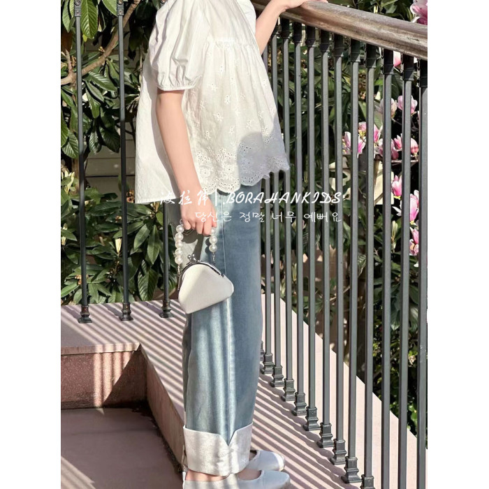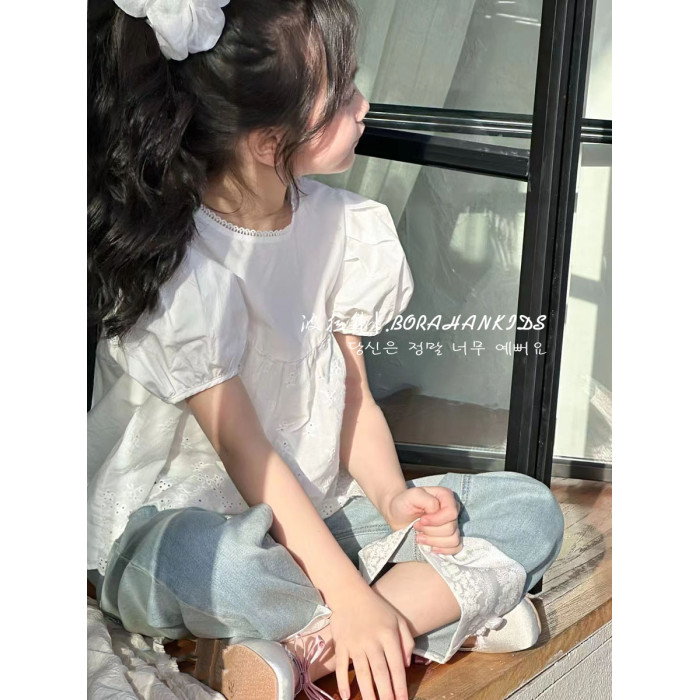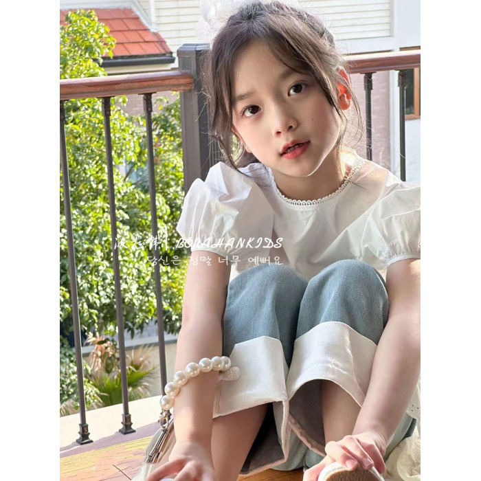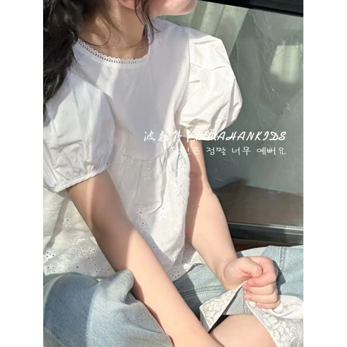 女童洋氣娃娃衫2025夏季童裝兒童泡泡襯衫短袖中大童法式圓領上衣
