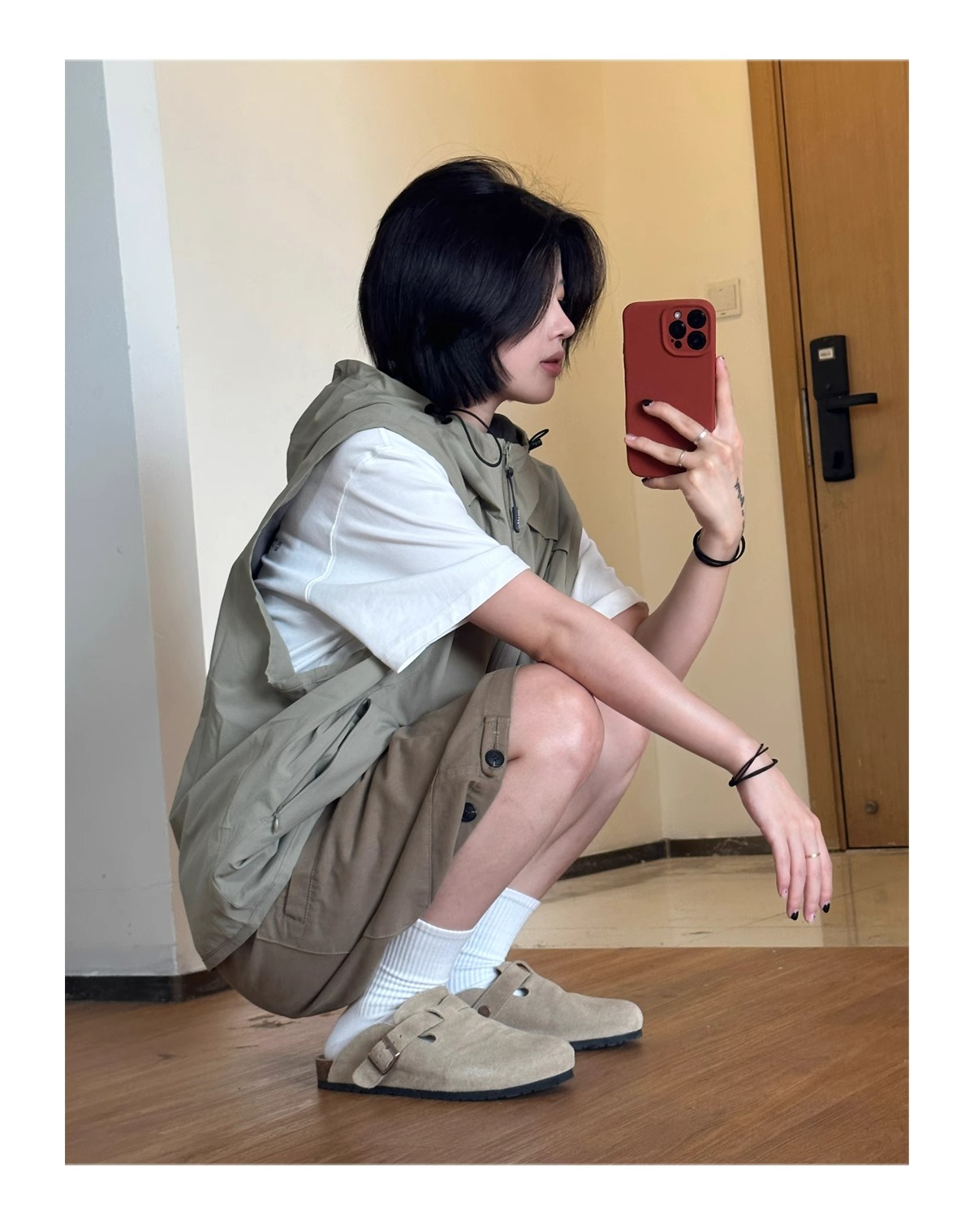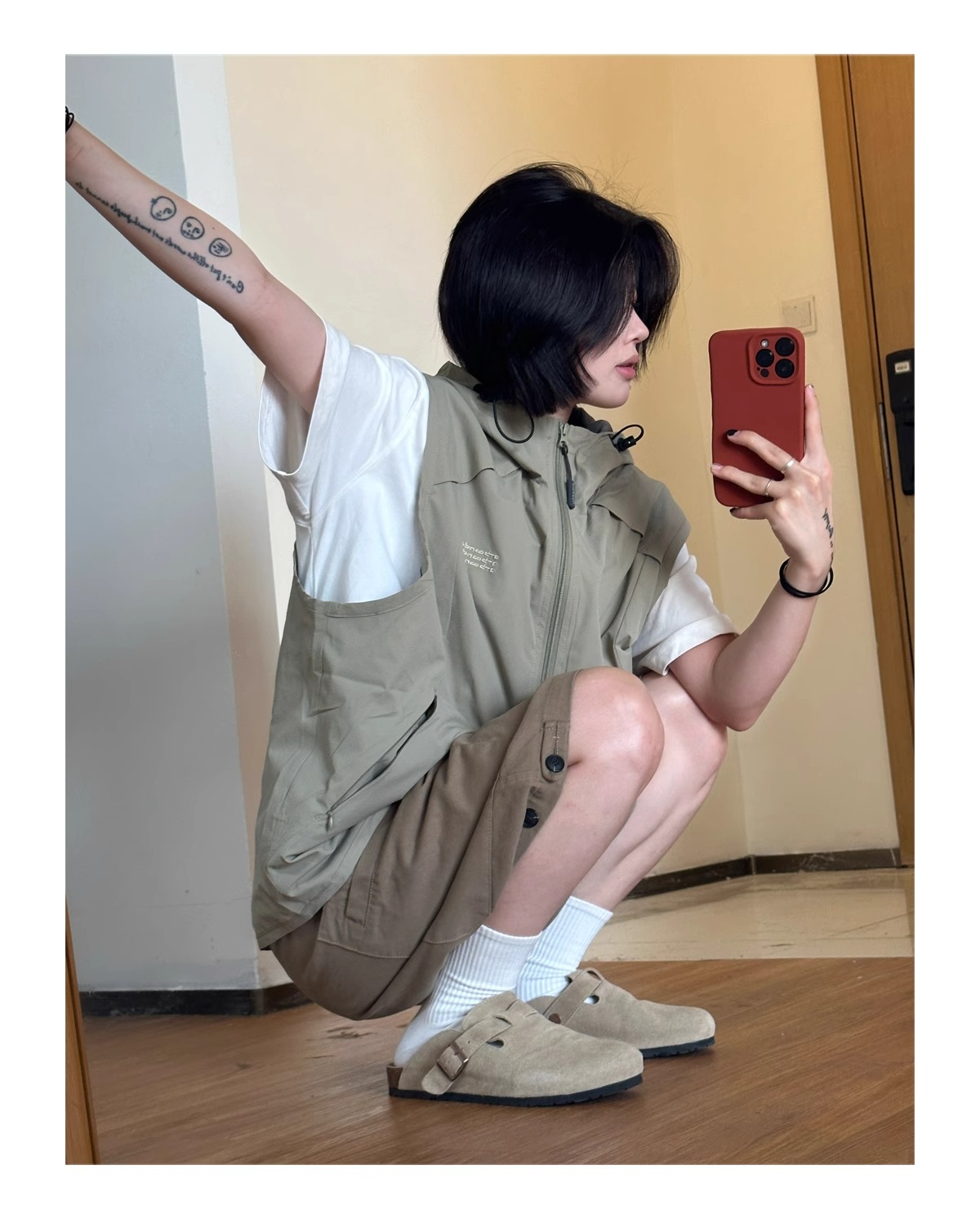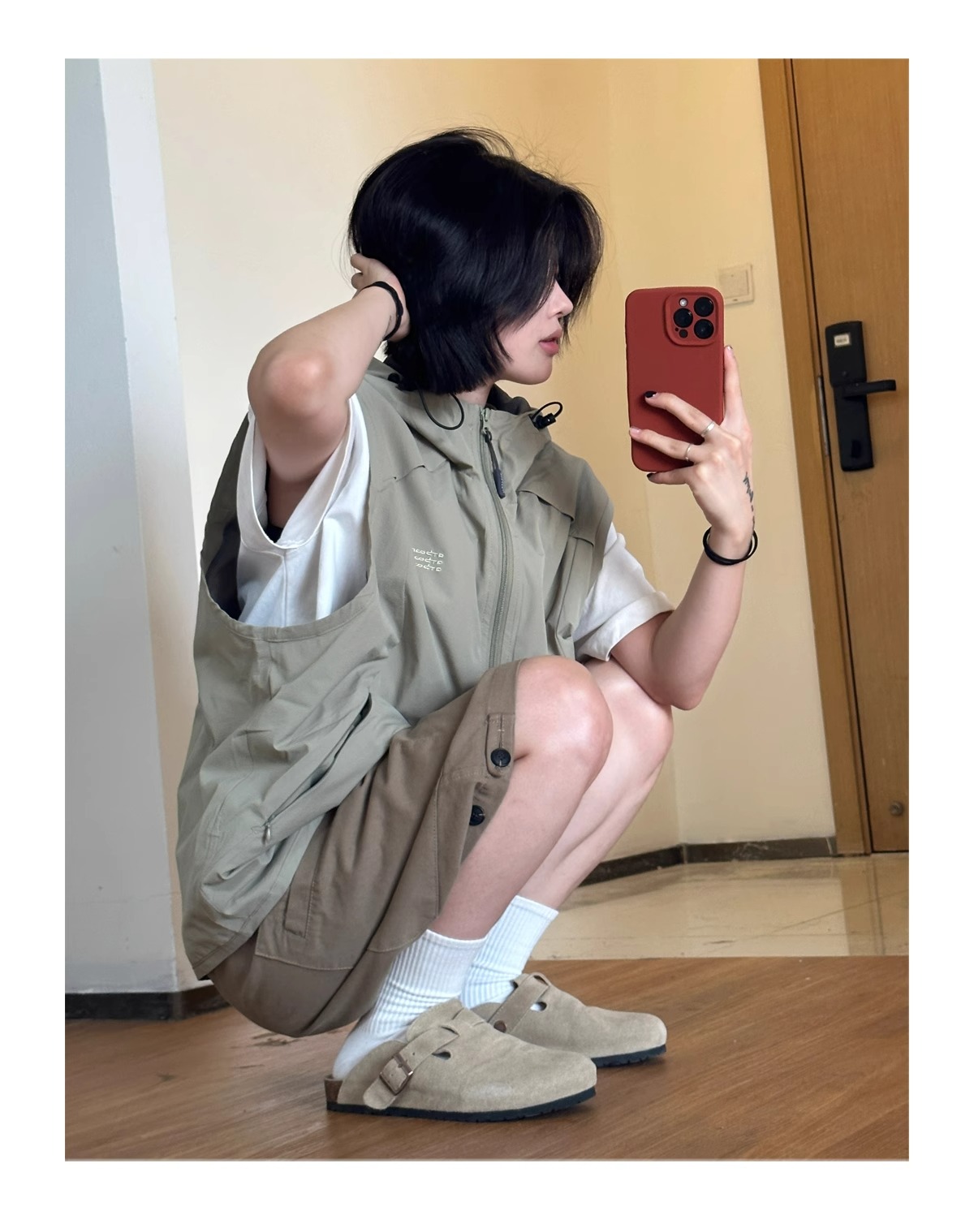 兩件裝/單件夏山系戶外連帽馬甲男女肌理感坎肩口袋拉鍊機能外套