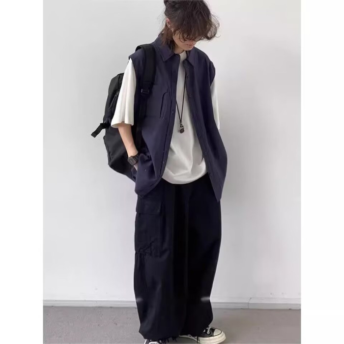 日系復古假兩件工裝短袖襯衫男女夏季休閒寬松情侶襯衣馬甲外套潮