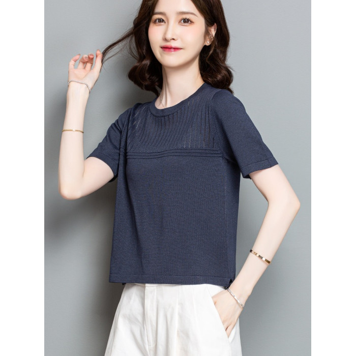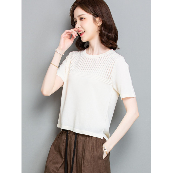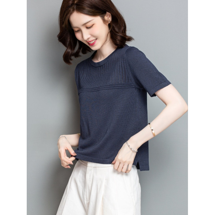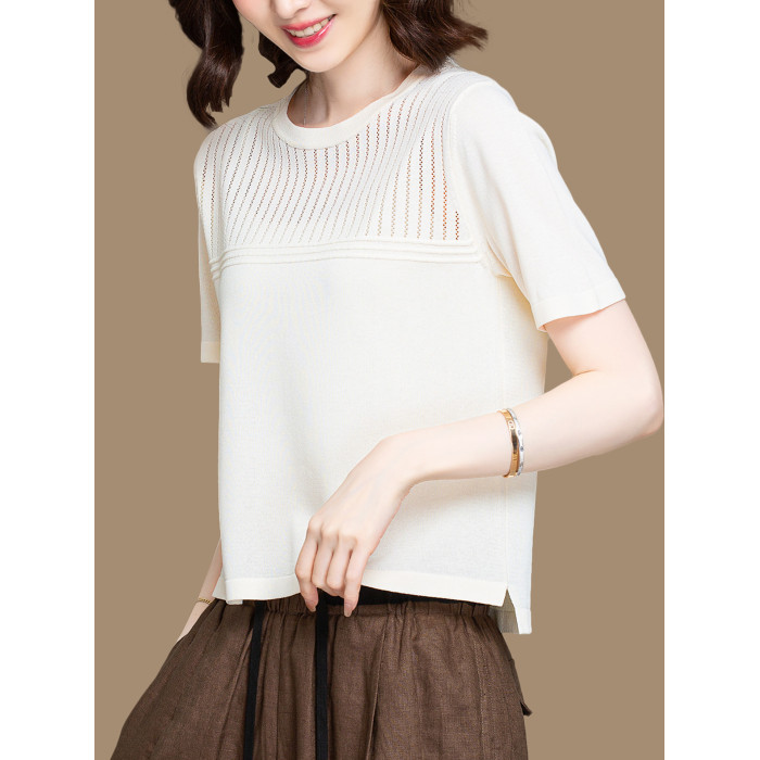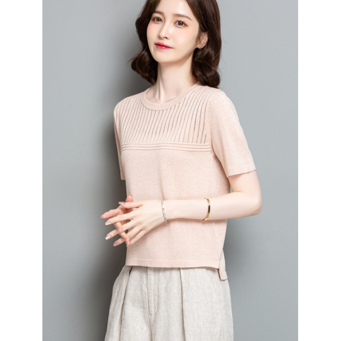 桑蠶絲短款針織衫短袖女t恤新款夏季薄款圓領時尚氣質冰絲小上衣