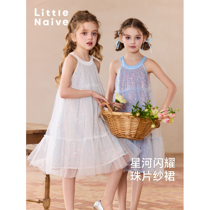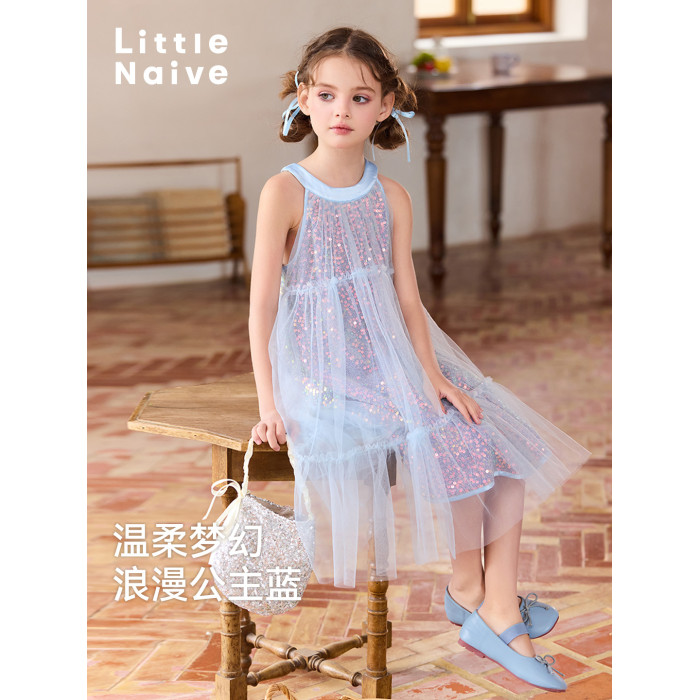 Little Naive女童網紗連衣裙夏季新款掛脖珠片紗裙兒童公主禮服裙