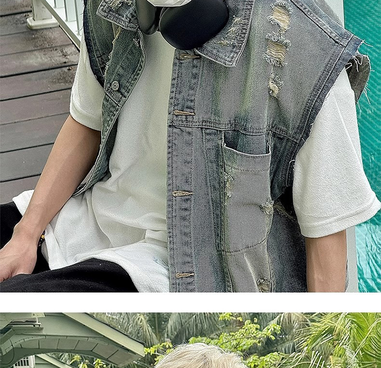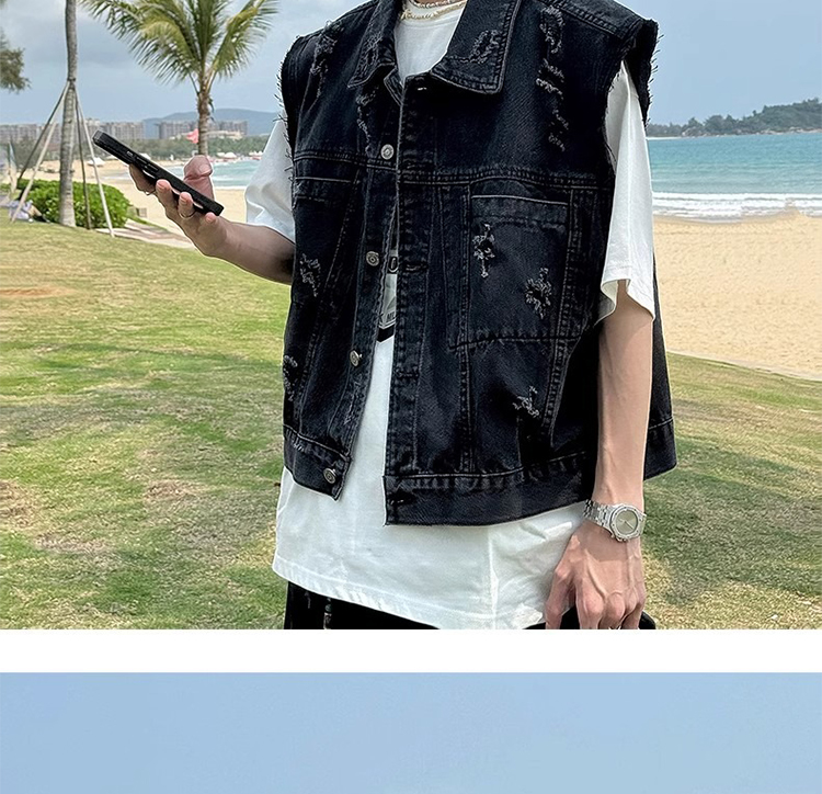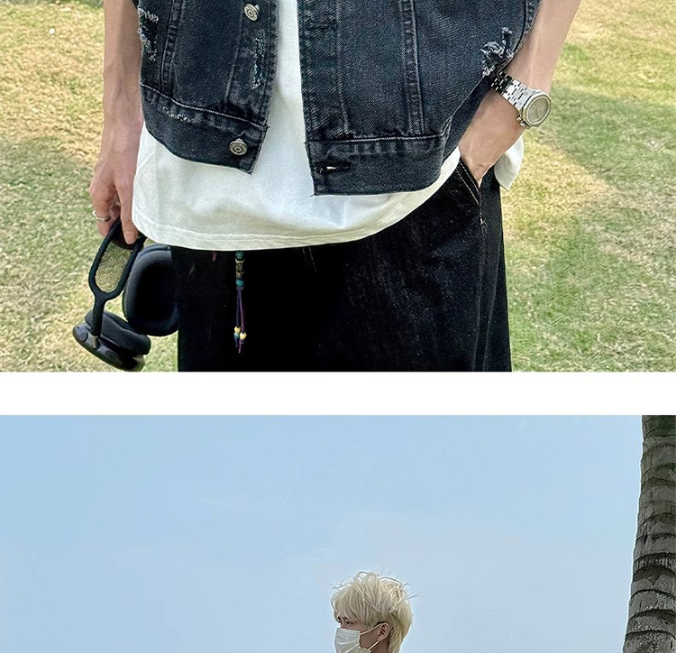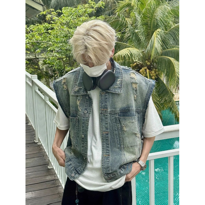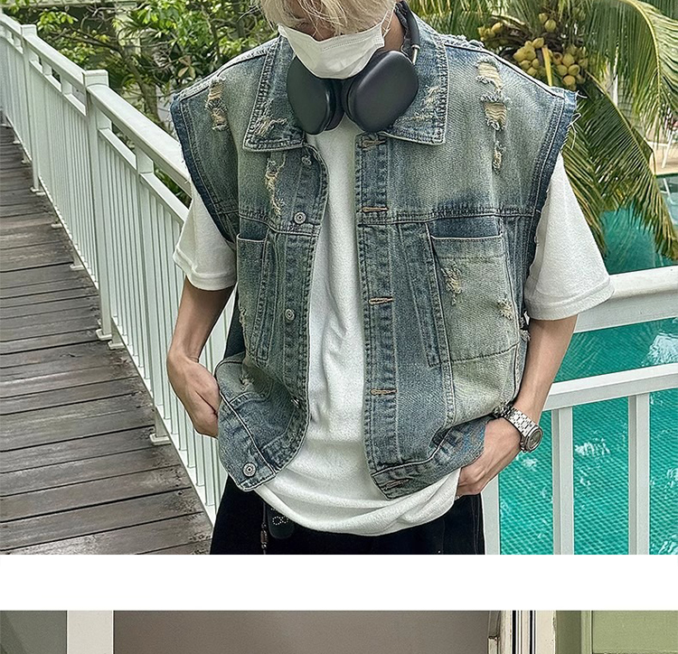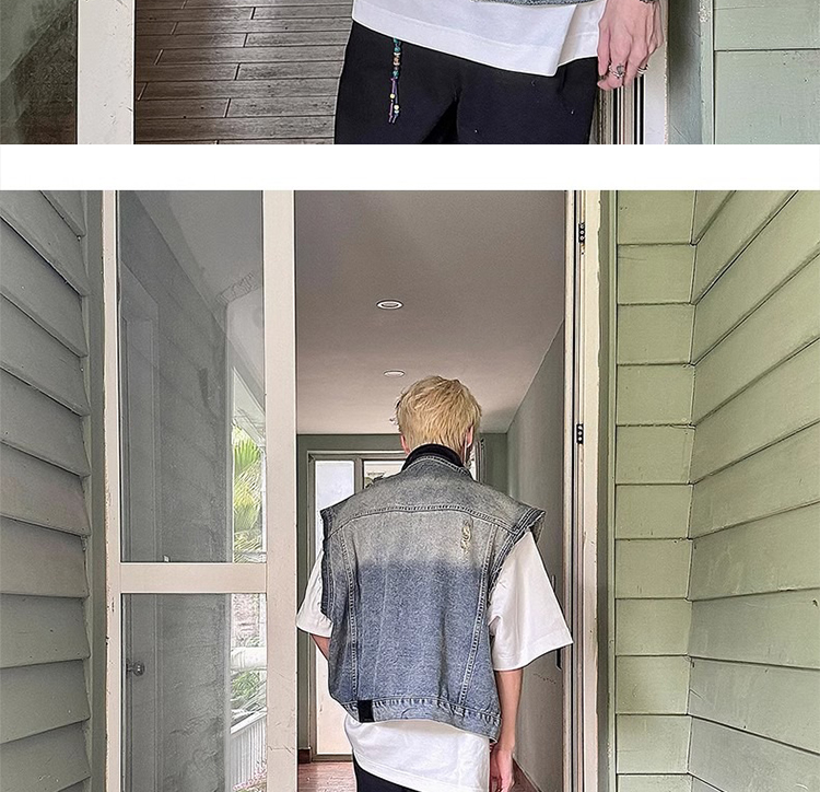 美式復古水洗磨毛邊短款牛仔馬甲男夏季潮牌ins水洗做舊坎肩外套