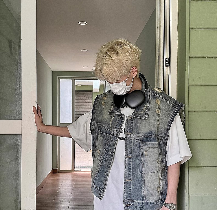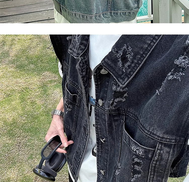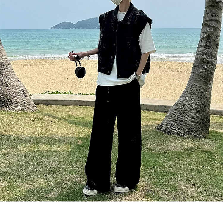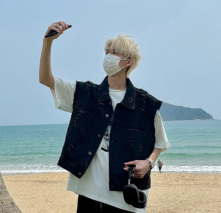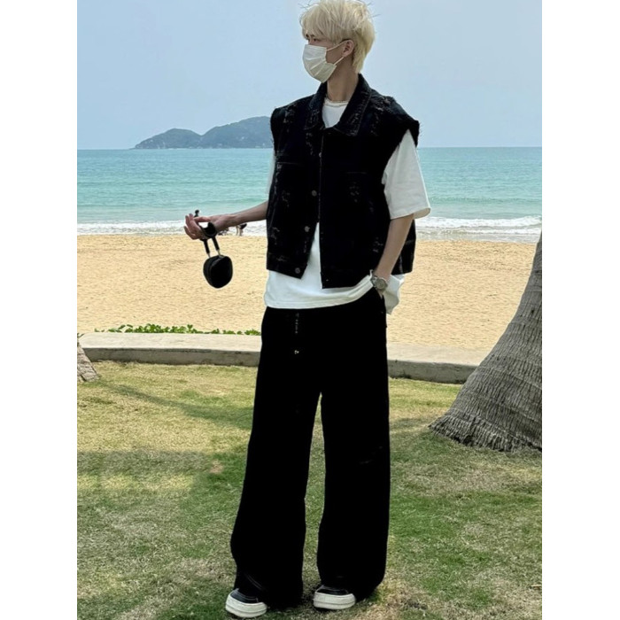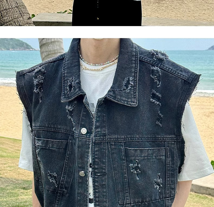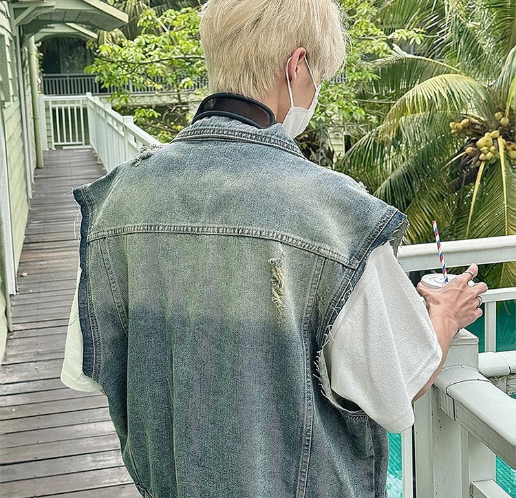 美式復古水洗磨毛邊短款牛仔馬甲男夏季潮牌ins水洗做舊坎肩外套