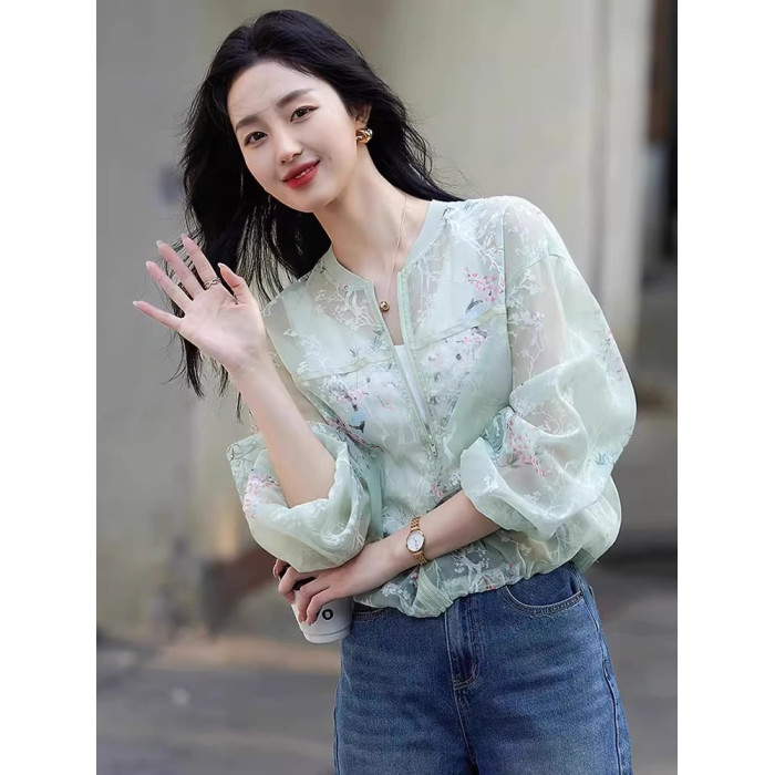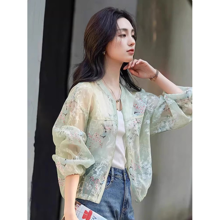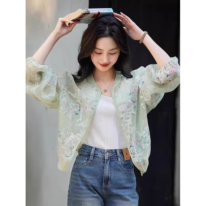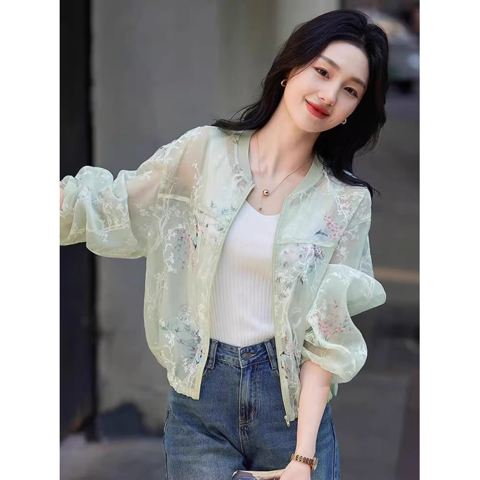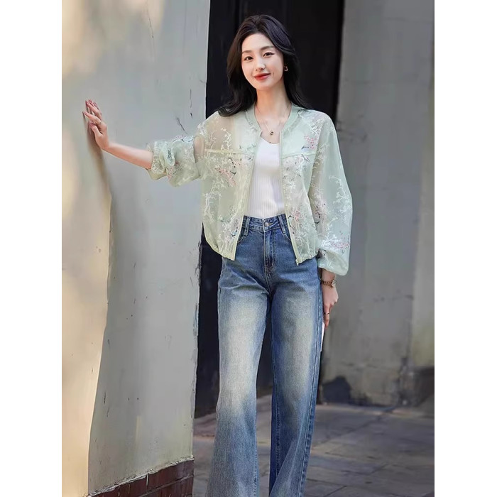 立領刺綉印花歐根紗防曬薄款短外套女2025夏季新款長袖防曬衣上衣