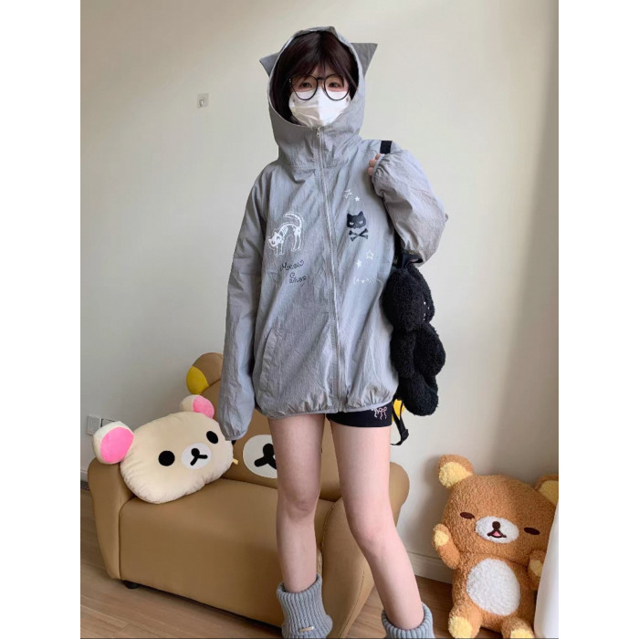 日系二次元可愛貓耳朵連帽防曬衣女夏季新款寬松軟妹防紫外線外套