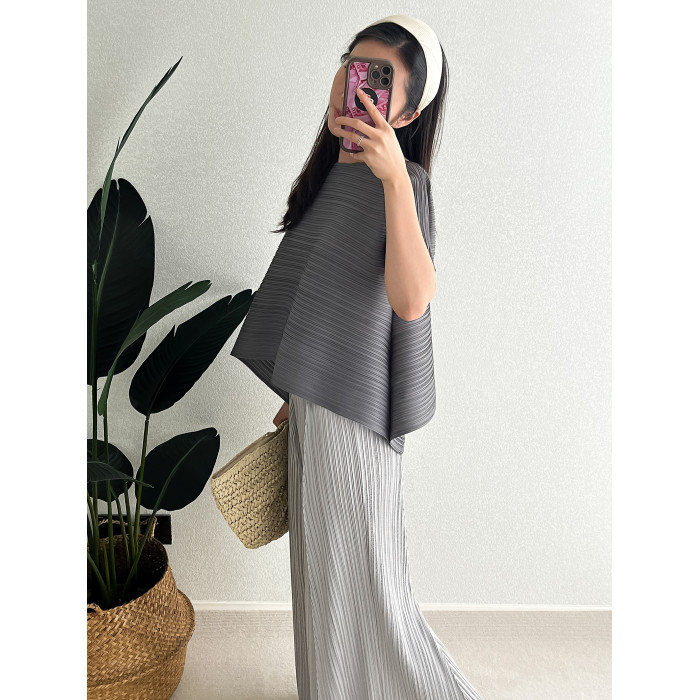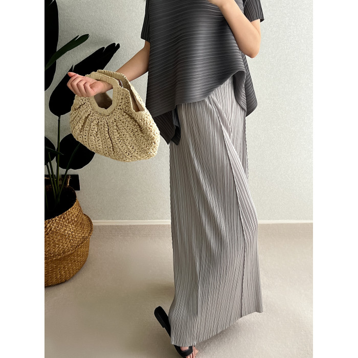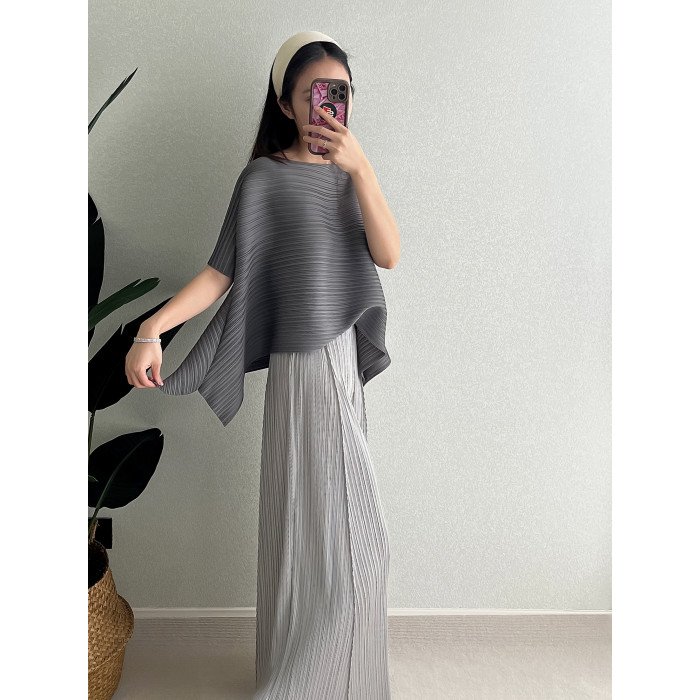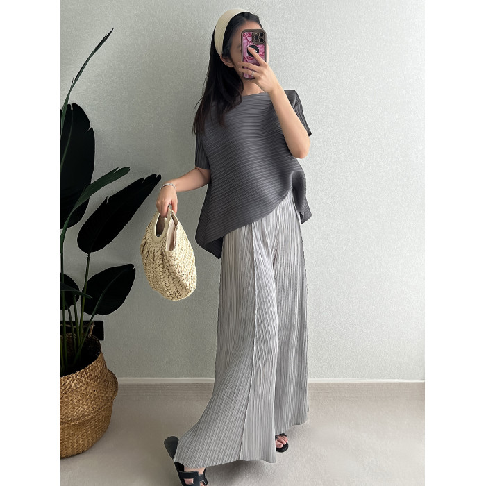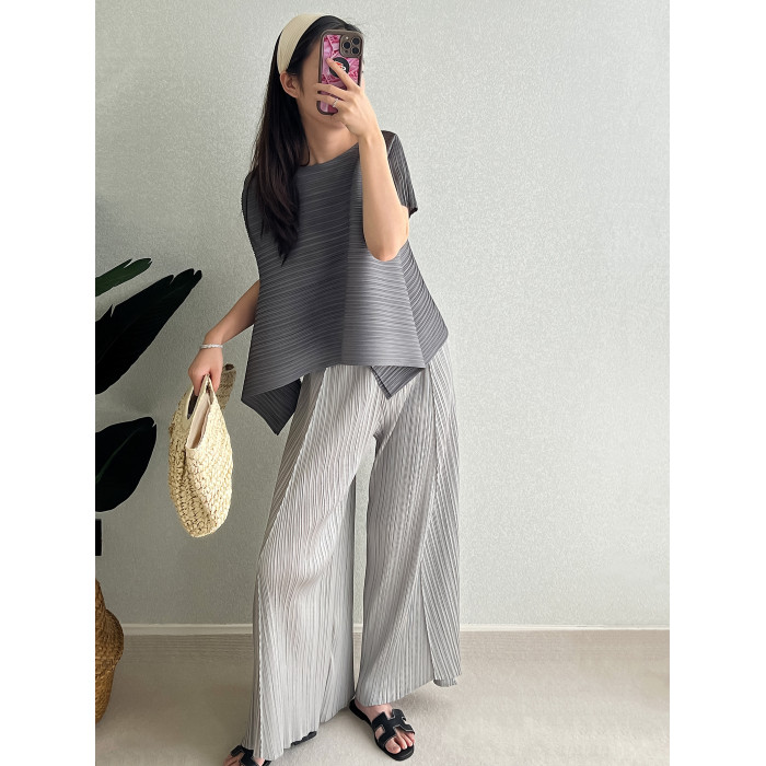 2025夏季三宅立體褶皺不規則氣質灰調上衣+銀河感清冷顯瘦濶腿褲