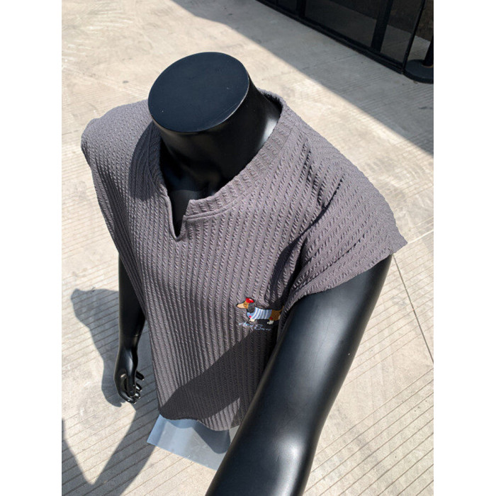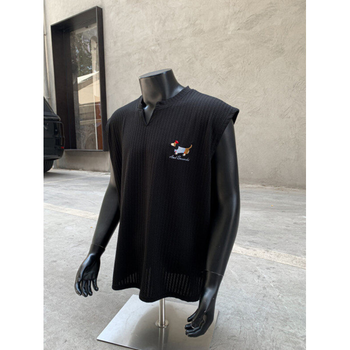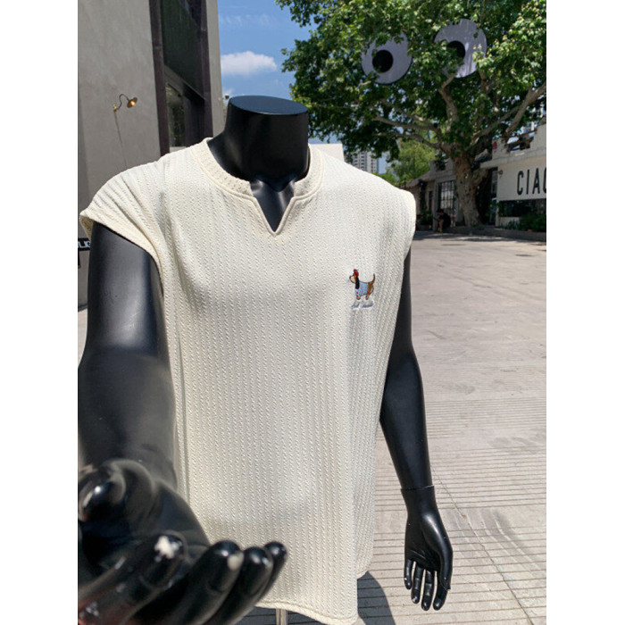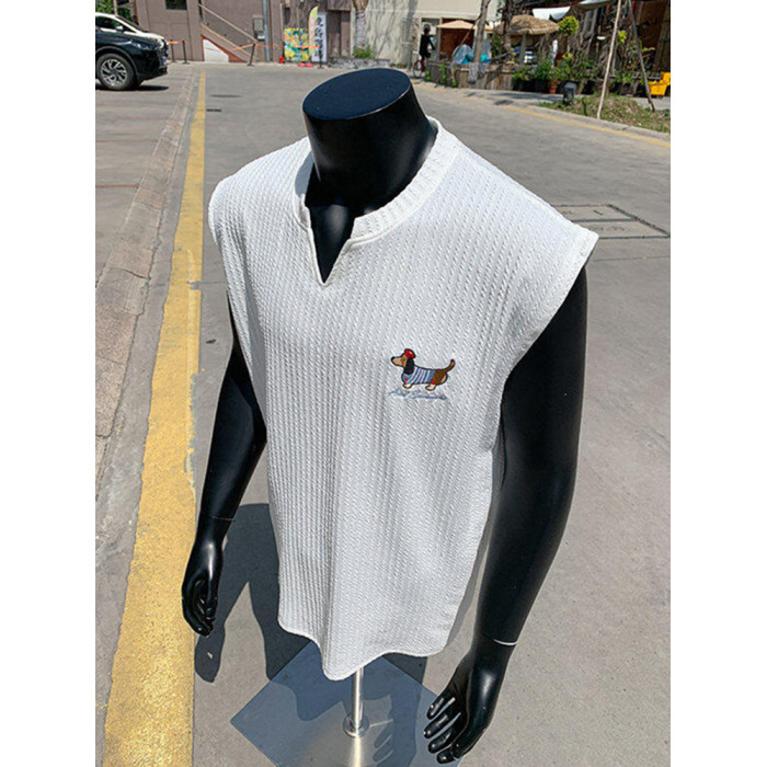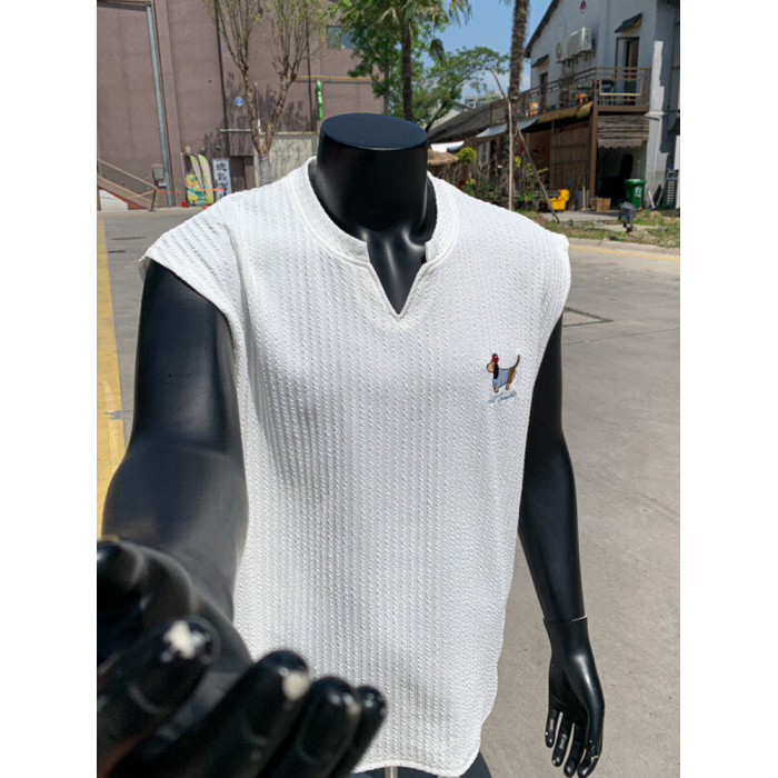 肌理感臘腸狗刺綉白色v領背心男夏季冰絲速乾坎肩無袖t恤運動汗衫
