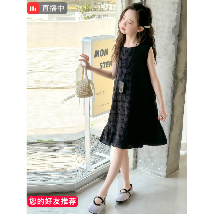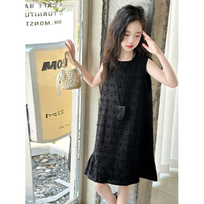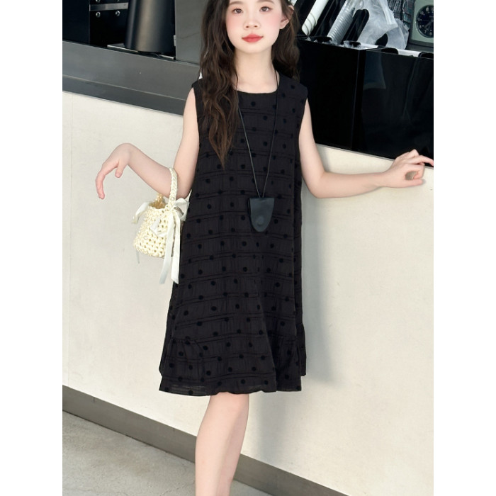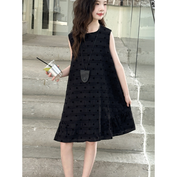 女童黑色無袖波點連衣裙夏裝2025新款兒童夏日高級感背心裙子大童