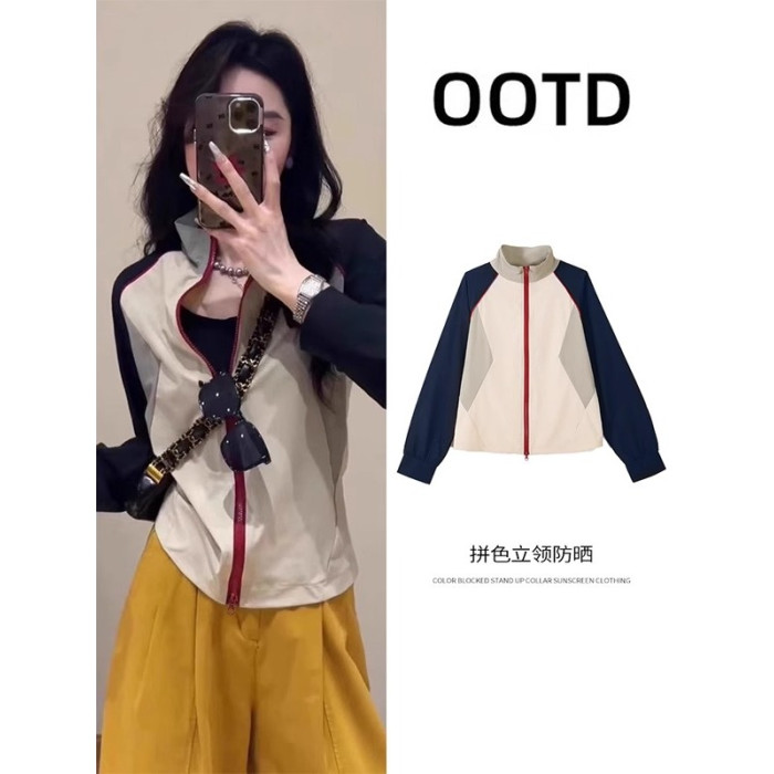 立領撞色冰絲涼感防曬衣女款夏季薄款戶外防紫外線小個子速乾外套