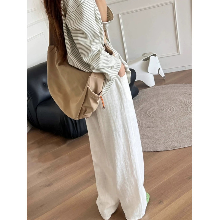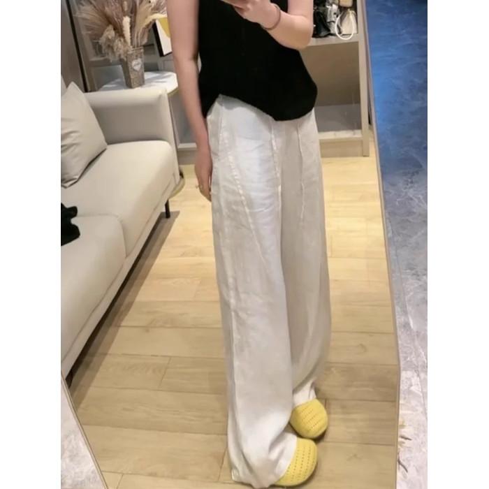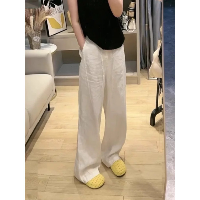 大碼白色苧麻直筒休閒褲女夏季薄胖mm寬松顯瘦高腰窄版亞麻濶腿褲