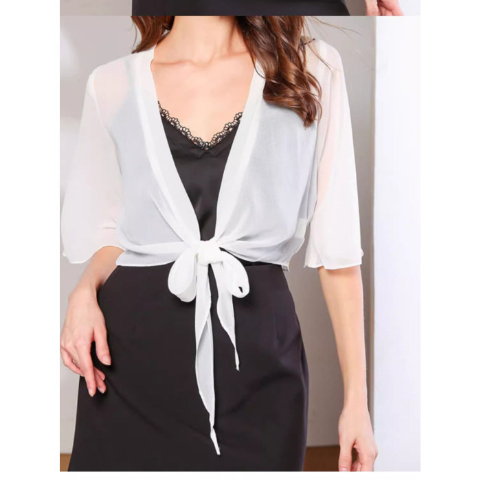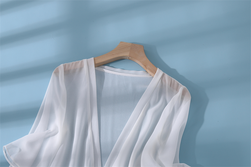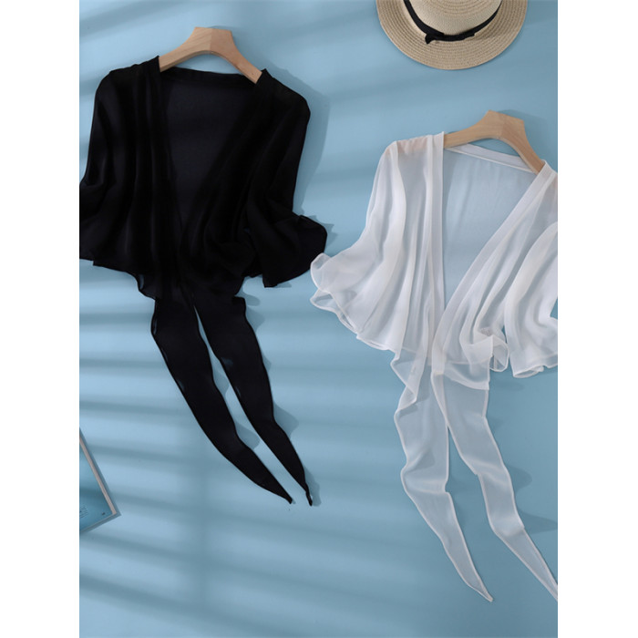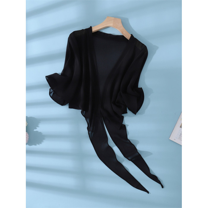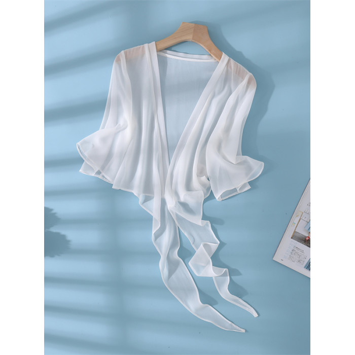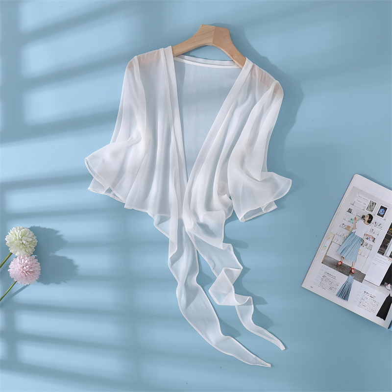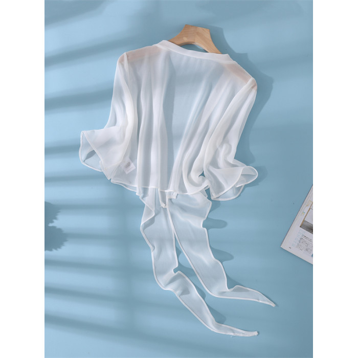 新款真絲小披肩薄外套系帶蕾絲衫短款坎肩桑蠶絲女開衫上衣防曬衣