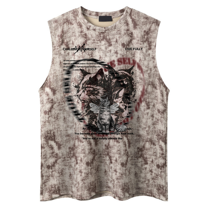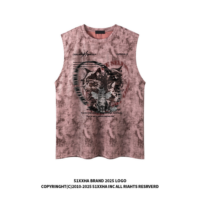 51嘻哈美式街頭貓咪印花紥染無袖T恤男夏季潮牌寬松休閒坎肩背心
