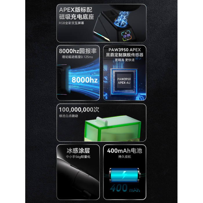 【左右手對稱型】AJ159 APEX - 隕石黑(8K接收器+彩屏磁吸充電底座)