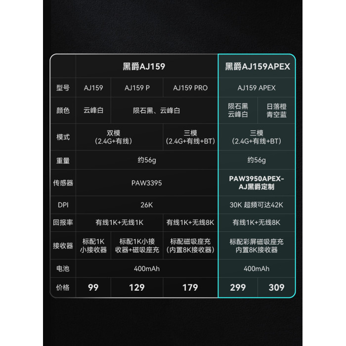黑爵aj159apex電競遊戯滑鼠PAW3950無線8K輕量化三模中小手帶座充