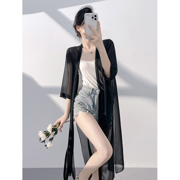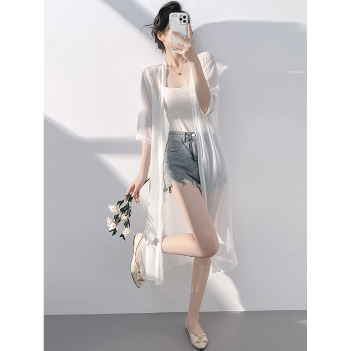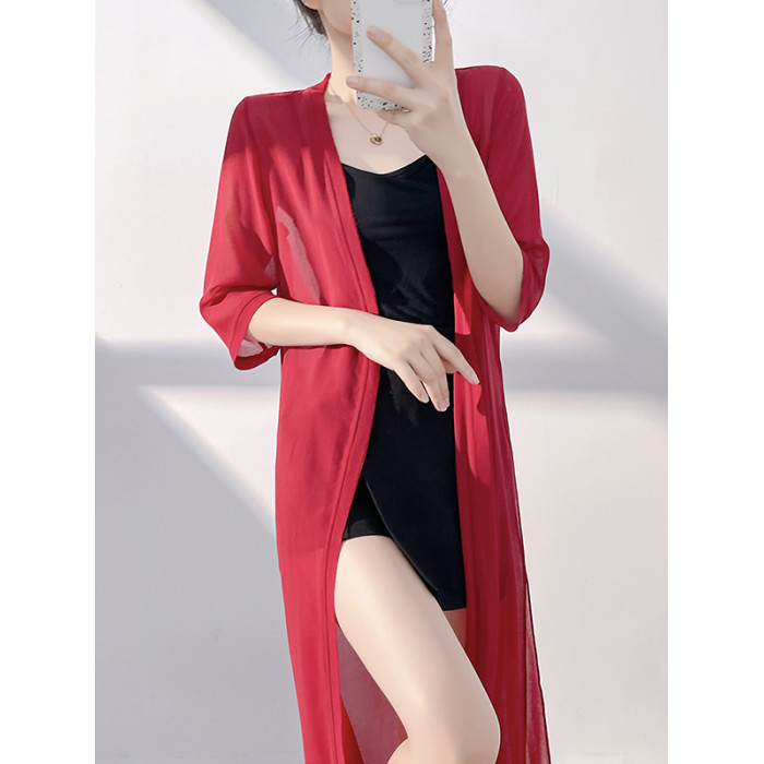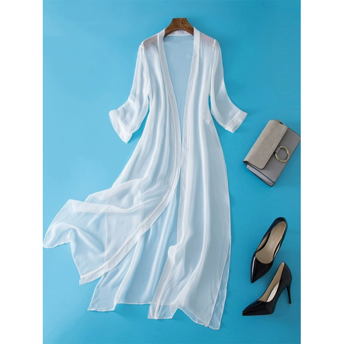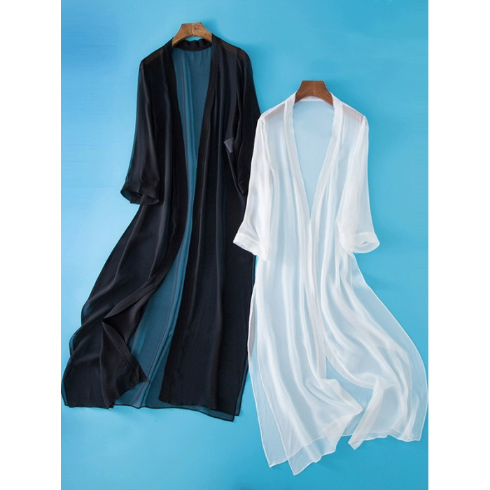 真絲披肩防曬衣女中長款桑蠶絲外套夏季遮陽配裙子側開叉純色外搭