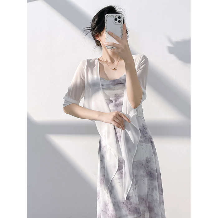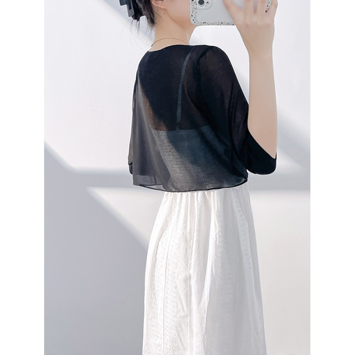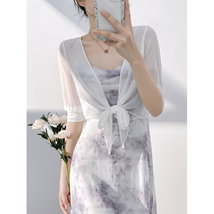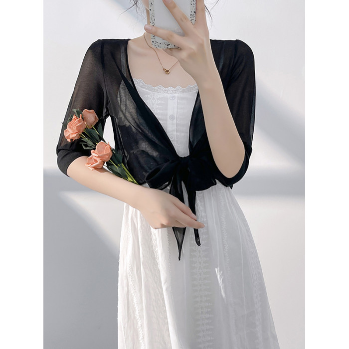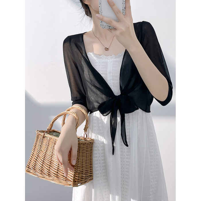真絲雪紡小披肩女短款薄外套垂感系帶裙子外搭防曬衣蠶絲坎肩開衫