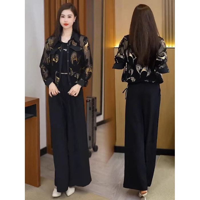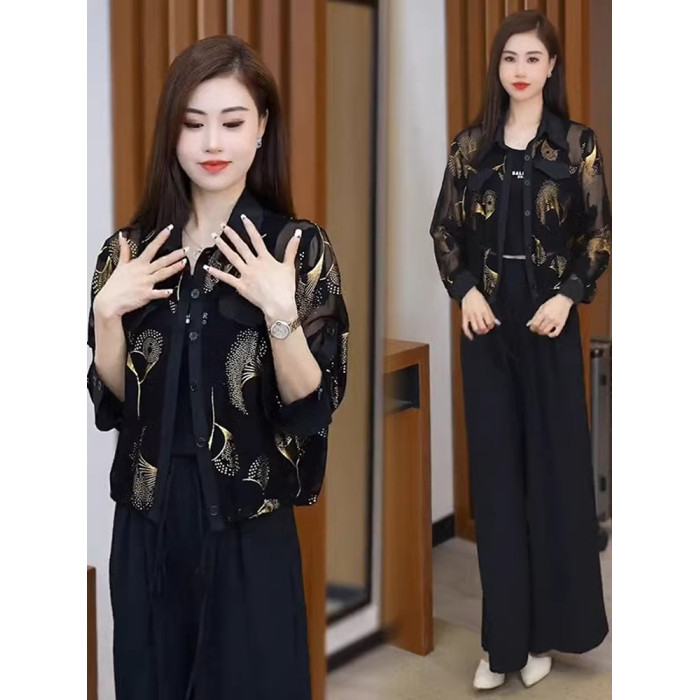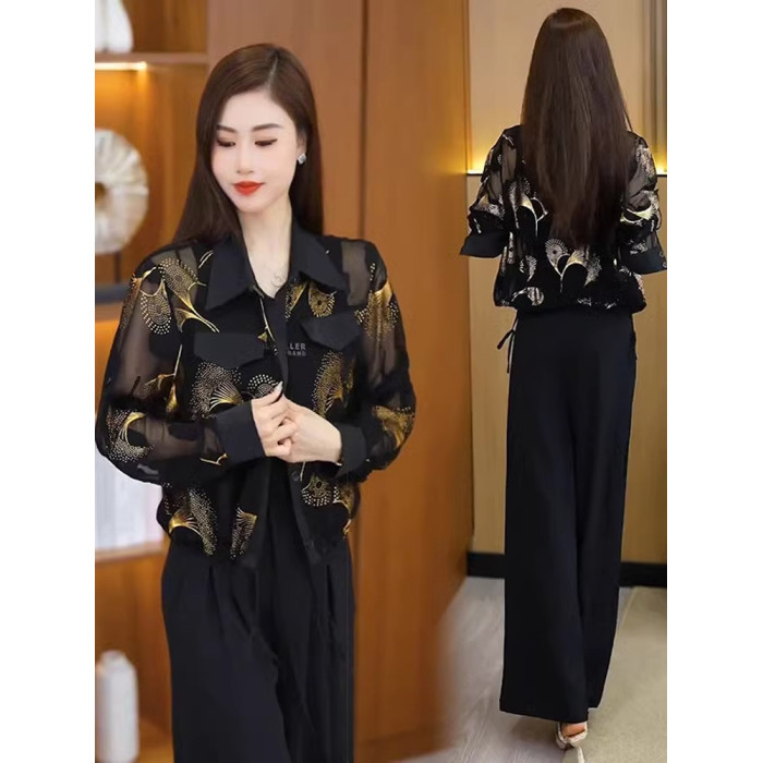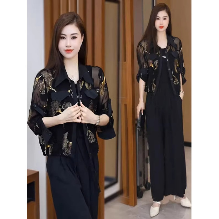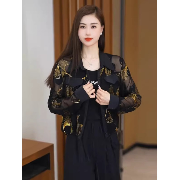雪紡襯衫印花防曬衣女外搭夏減齡洋氣薄款長袖披肩時尚翻領短外套