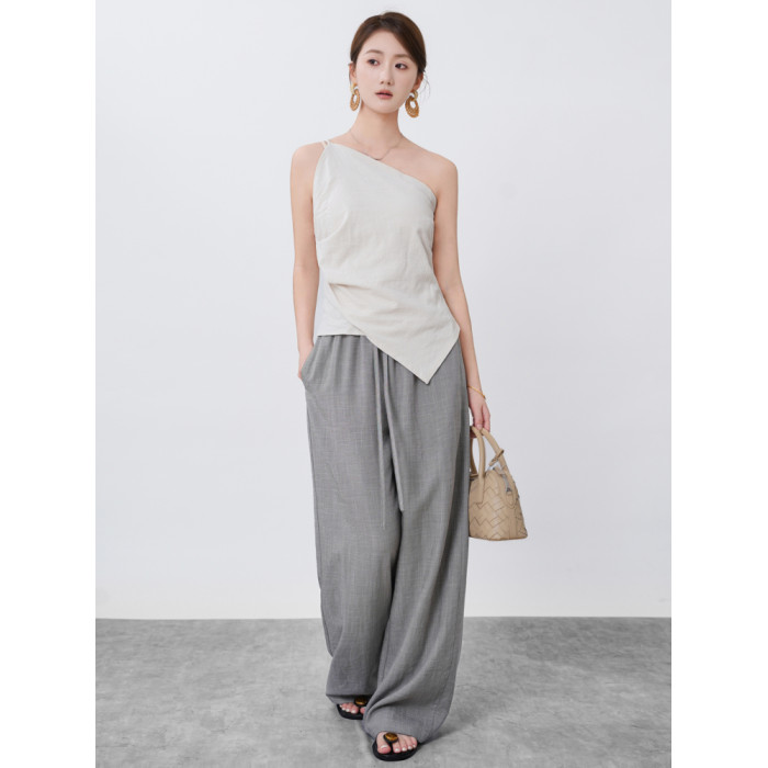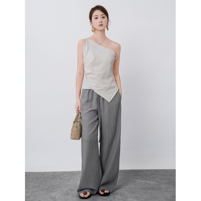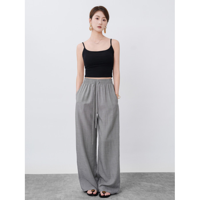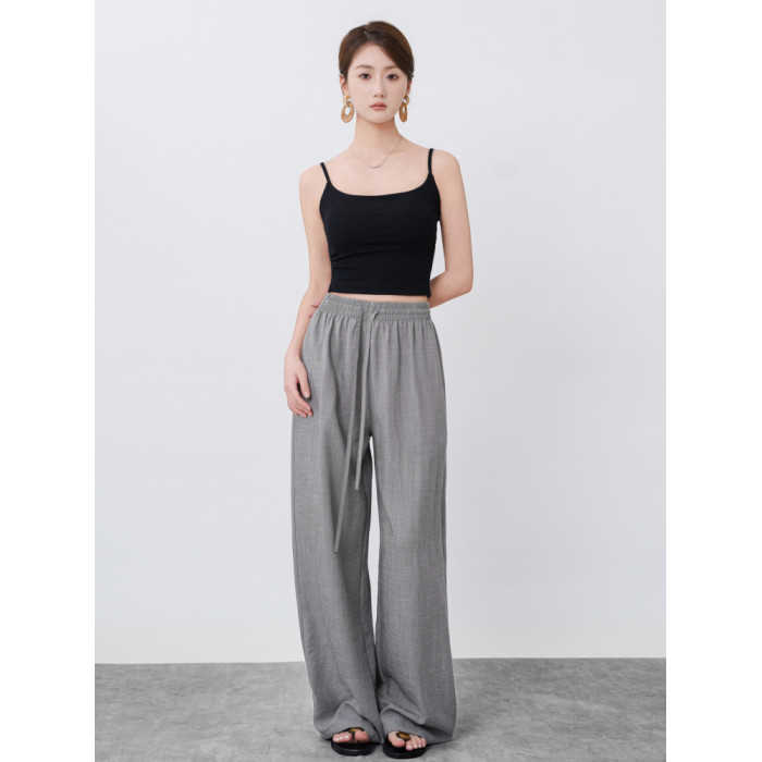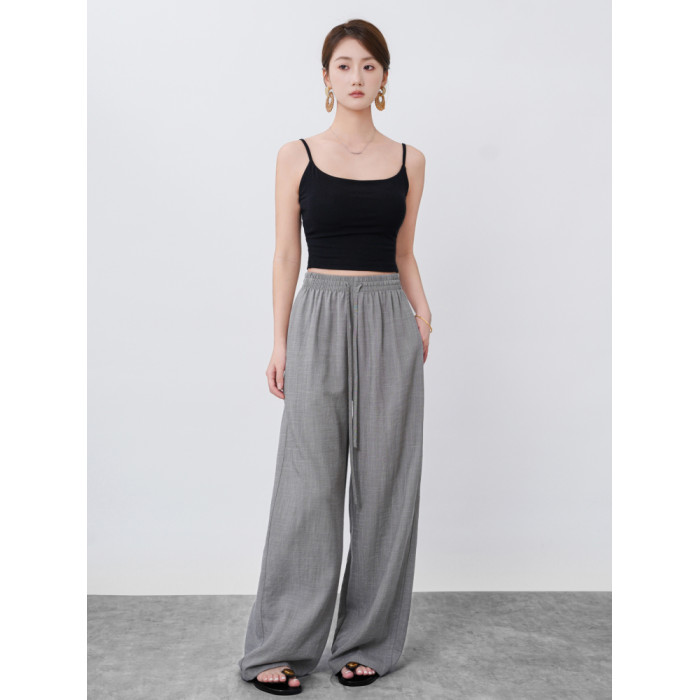 2025新款夏季灰色濶腿褲女高腰垂感寬松顯瘦百搭直筒褲亞麻拖地褲