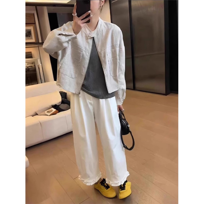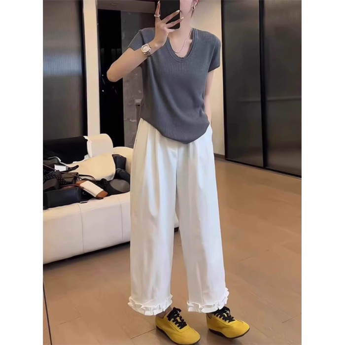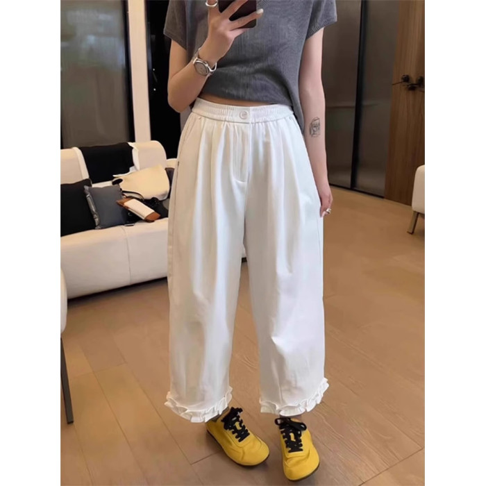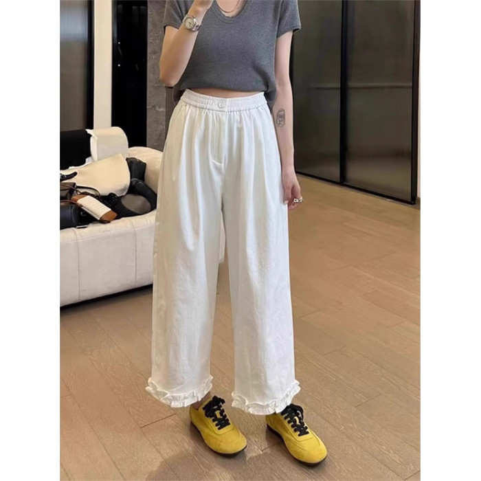 2025夏韓版甜美木耳邊拼接白色濶腿褲休閒高腰薄款寬松直筒九分褲
