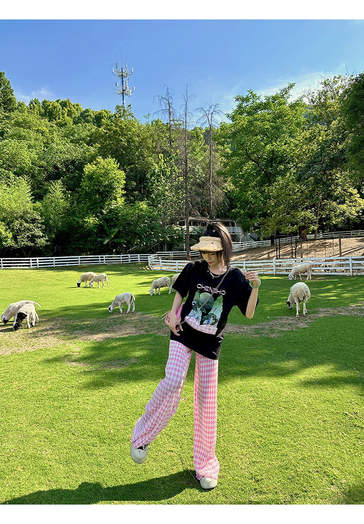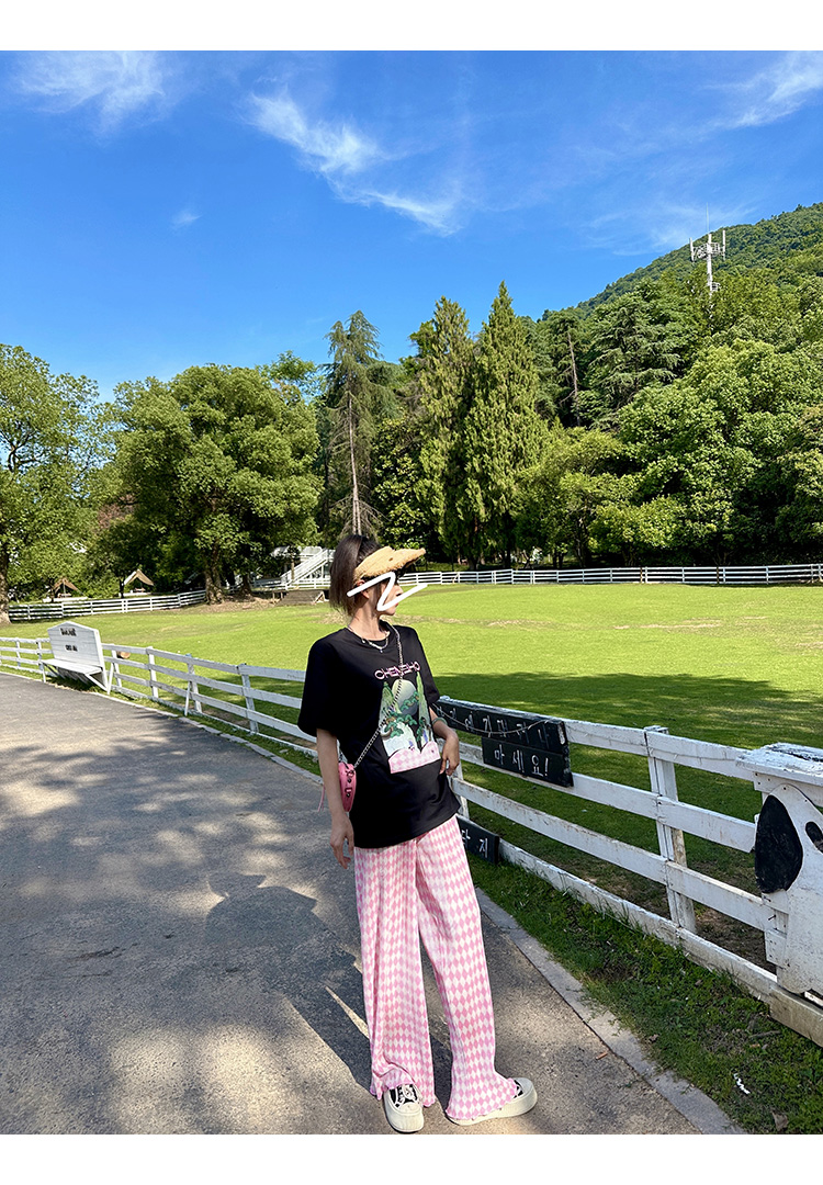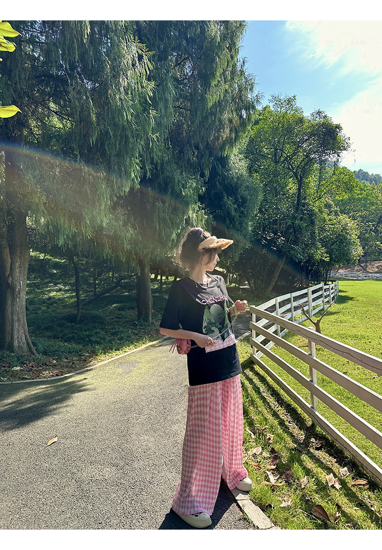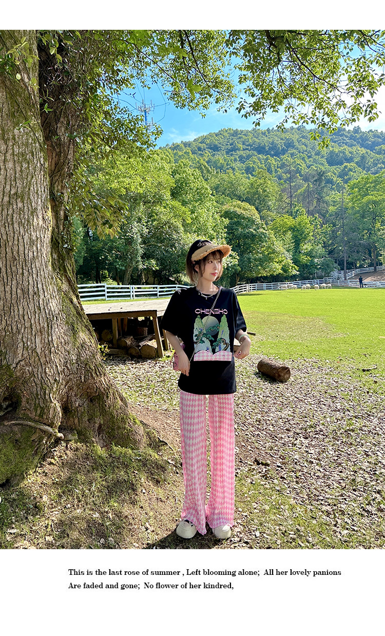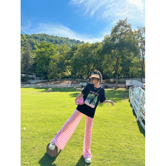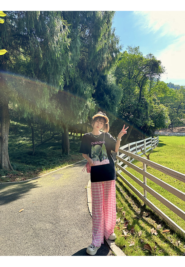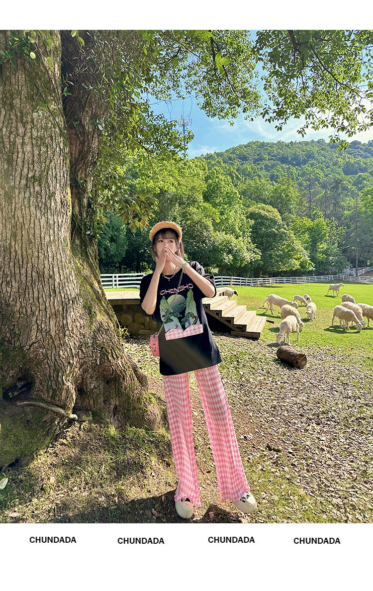 隅見丨菱形格休閒褲女2025新款夏季薄款松弛感濶腿褲高腰粉色長褲