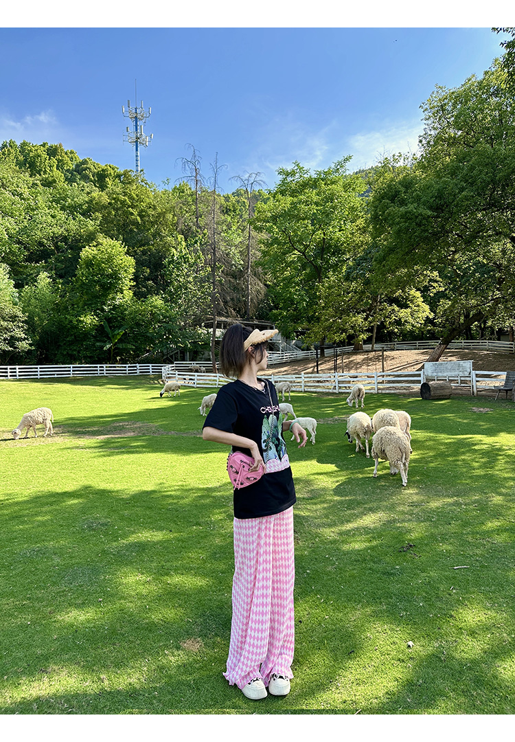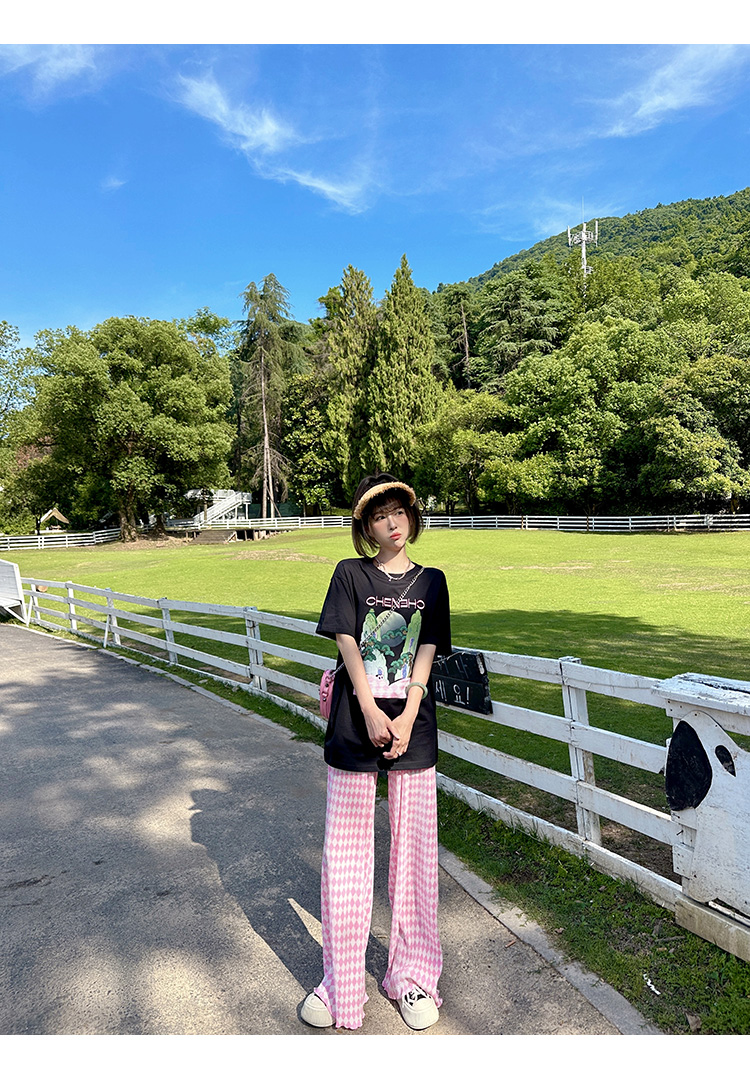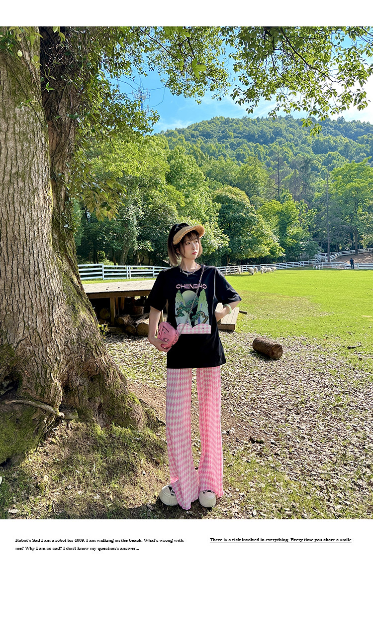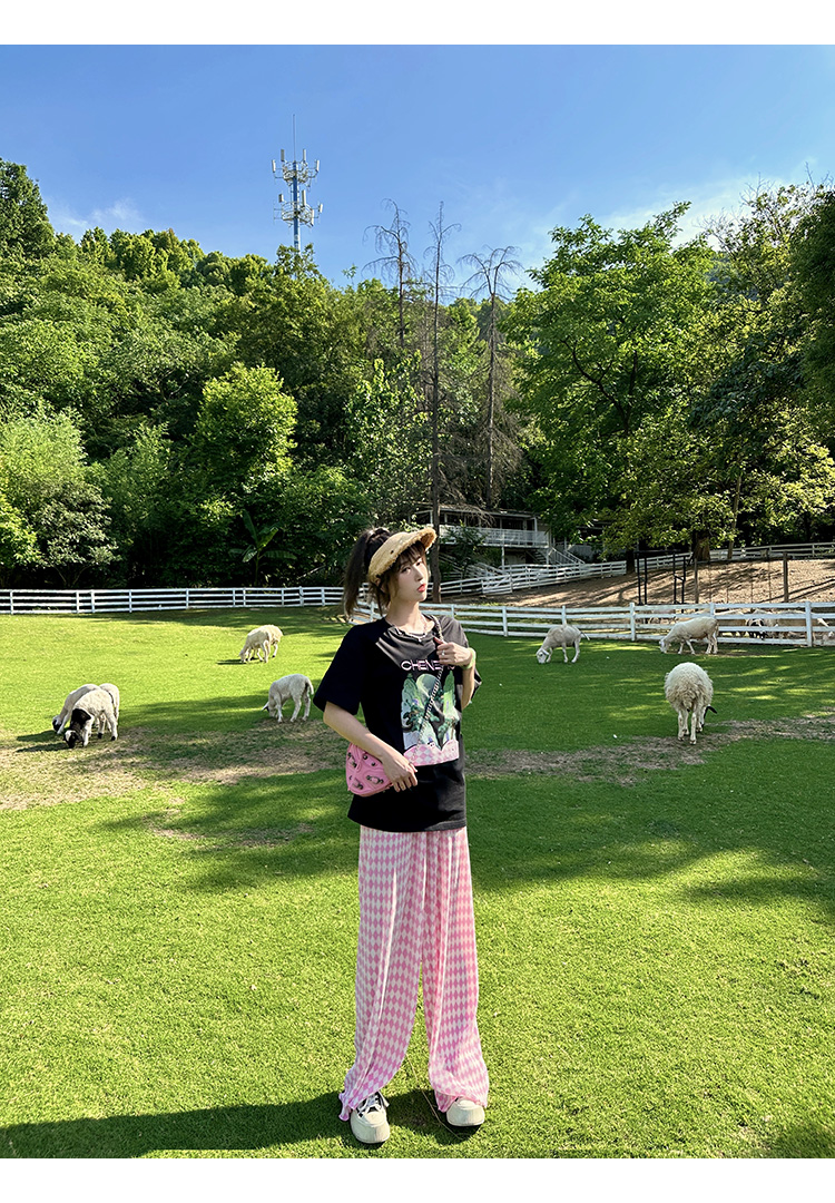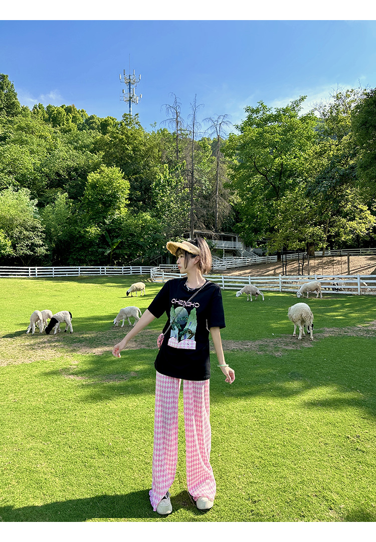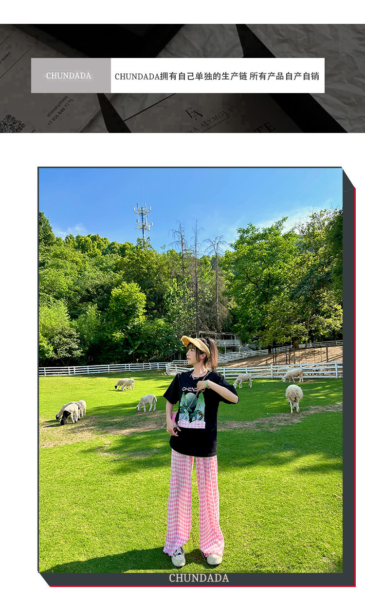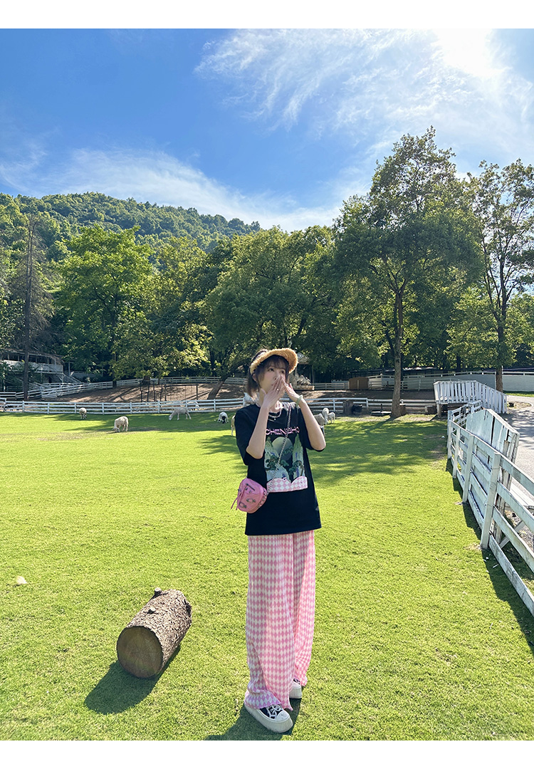 隅見丨菱形格休閒褲女2025新款夏季薄款松弛感濶腿褲高腰粉色長褲