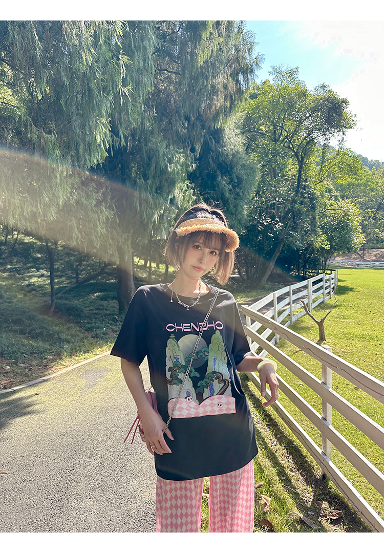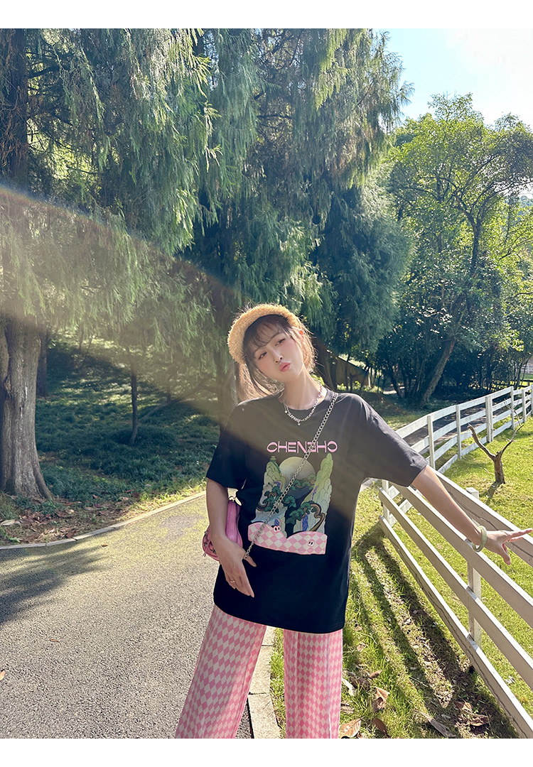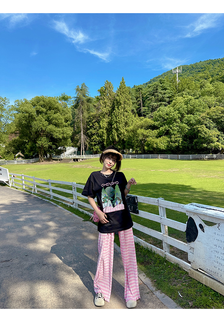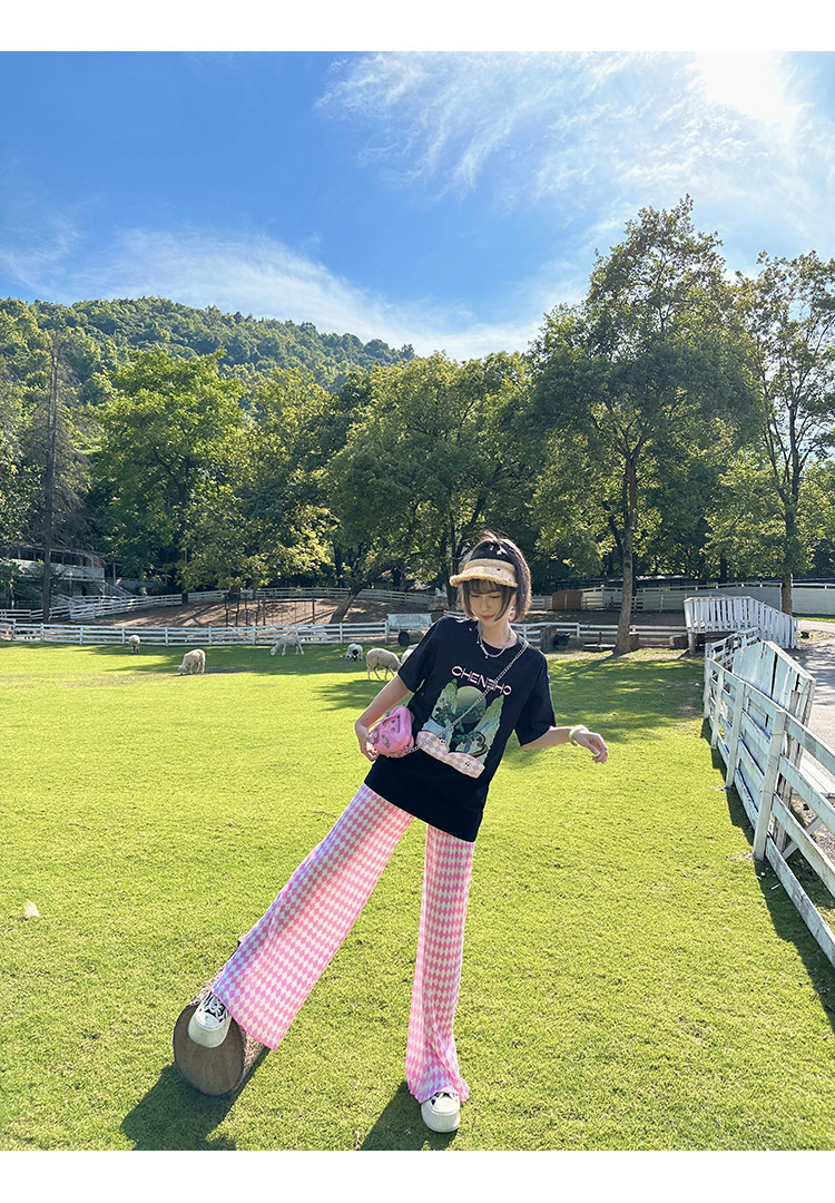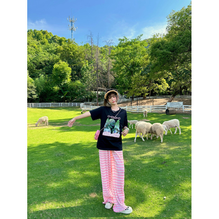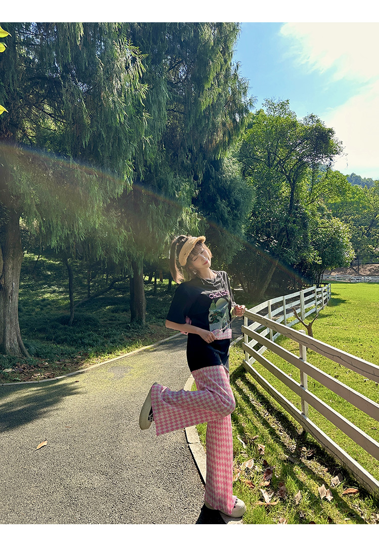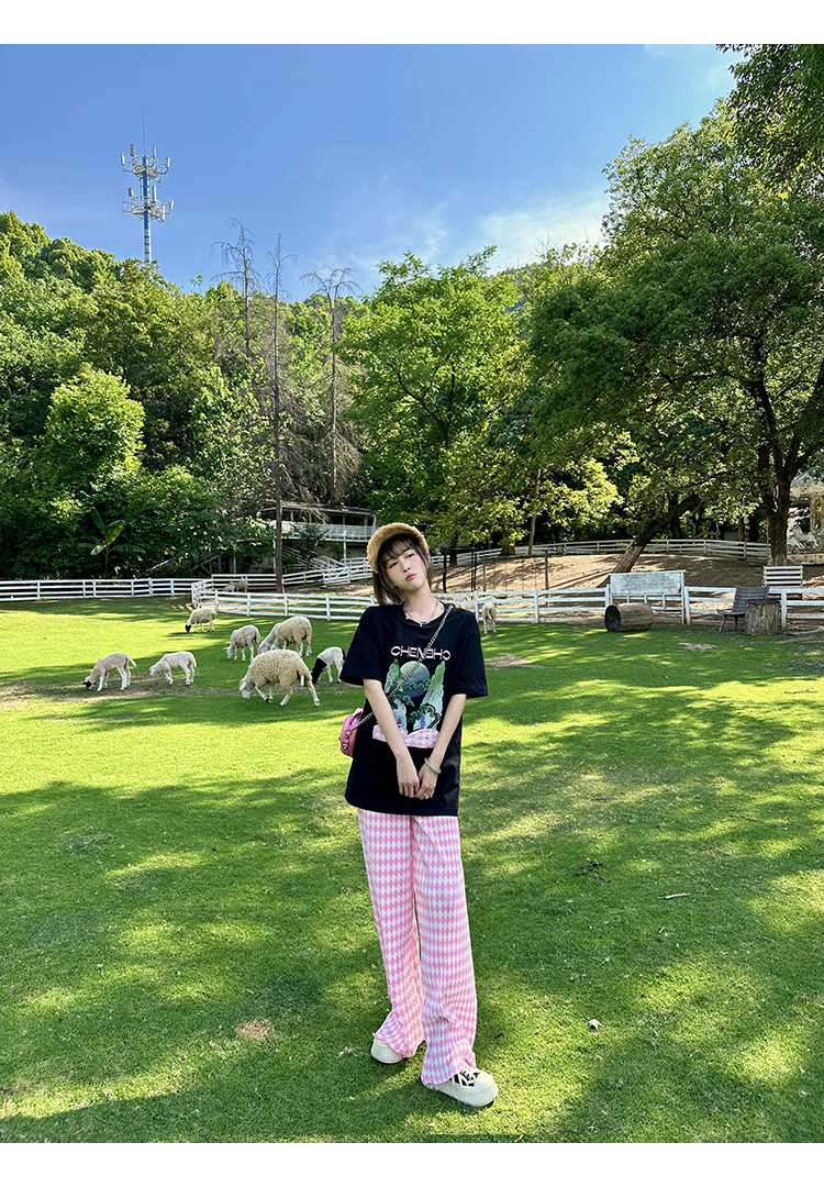 隅見丨菱形格休閒褲女2025新款夏季薄款松弛感濶腿褲高腰粉色長褲