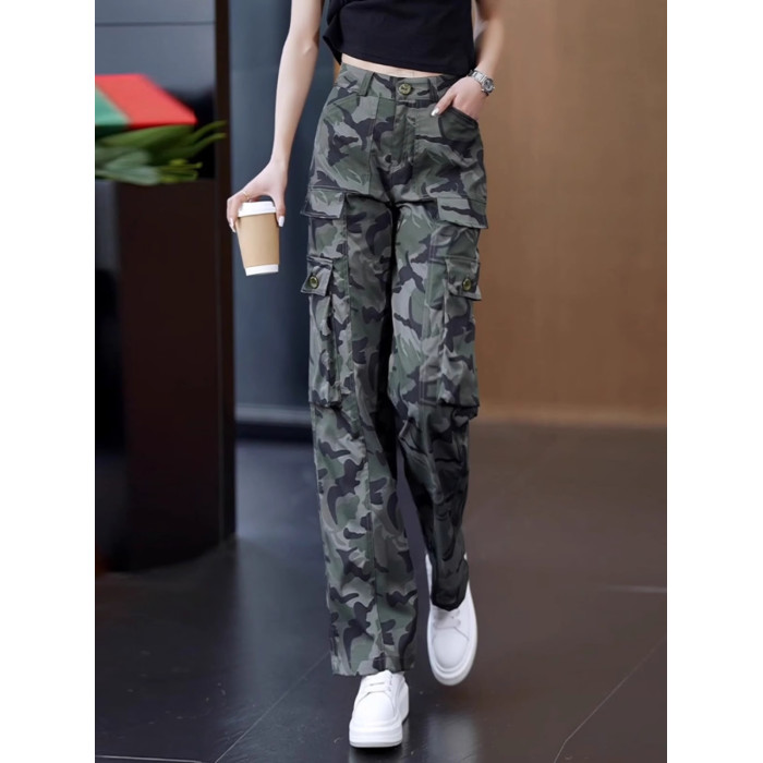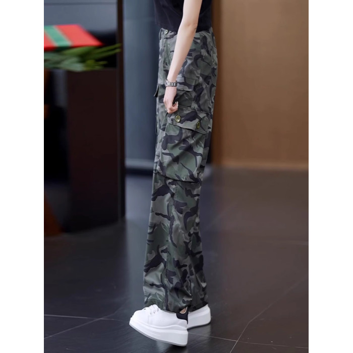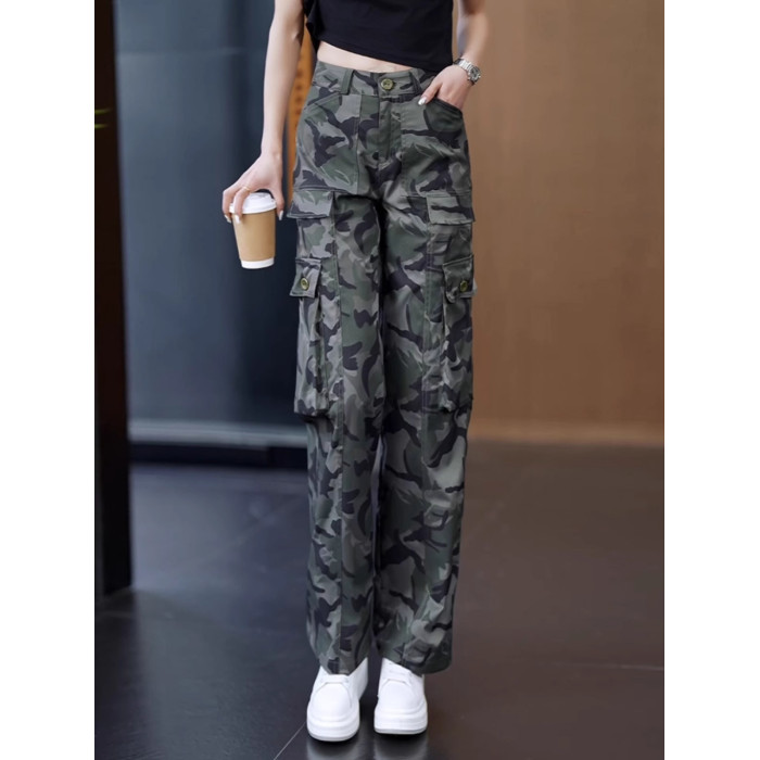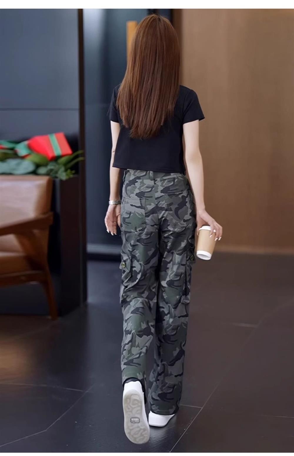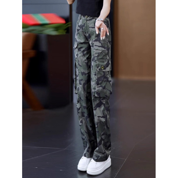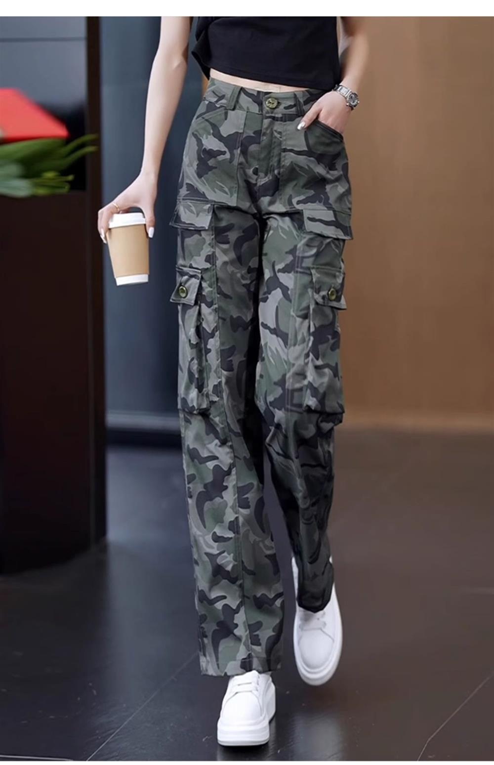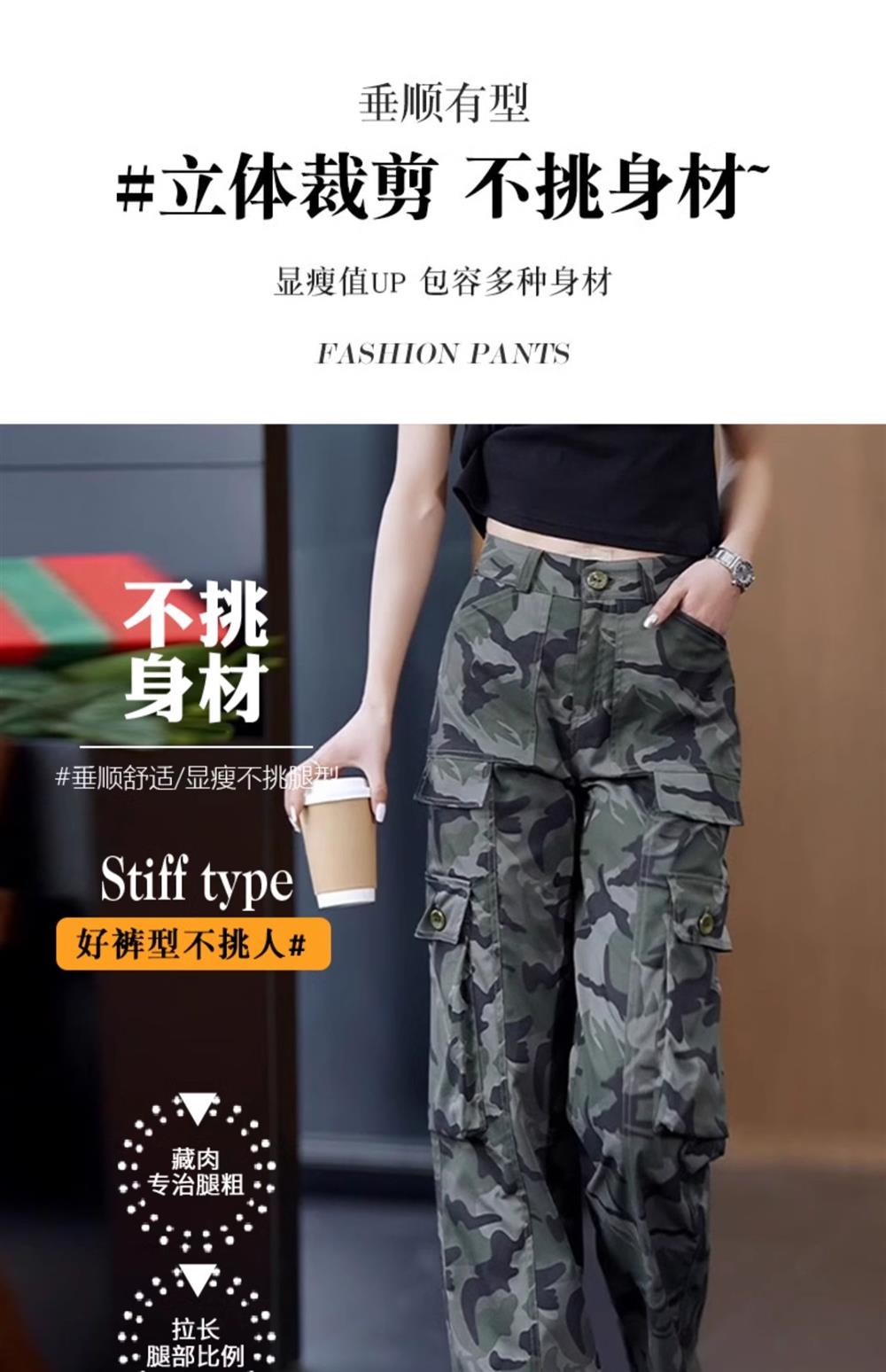 高級迷彩工裝褲女夏涼感高腰寬松垂感顯瘦休閒百搭運動直筒濶腿褲