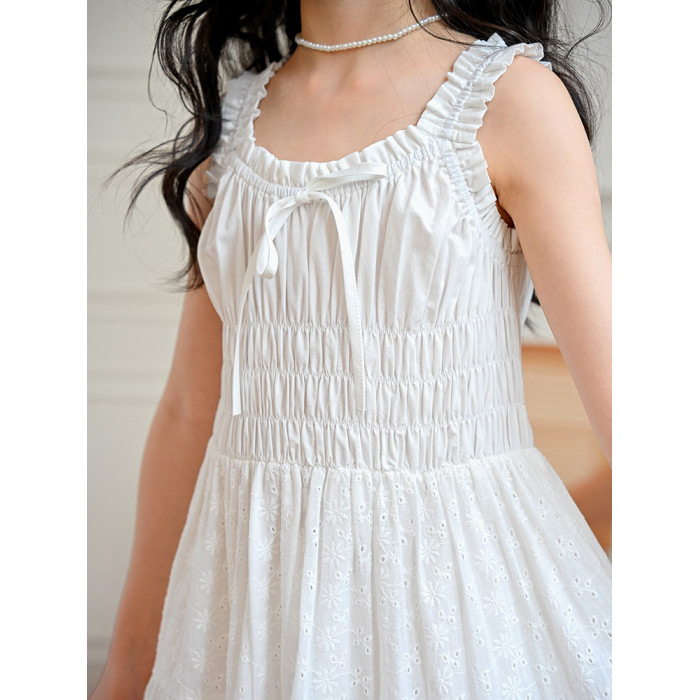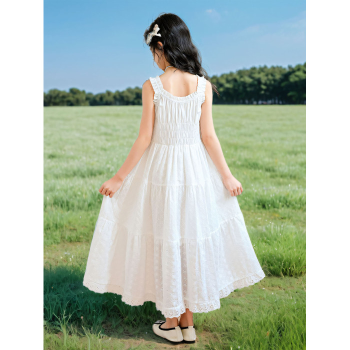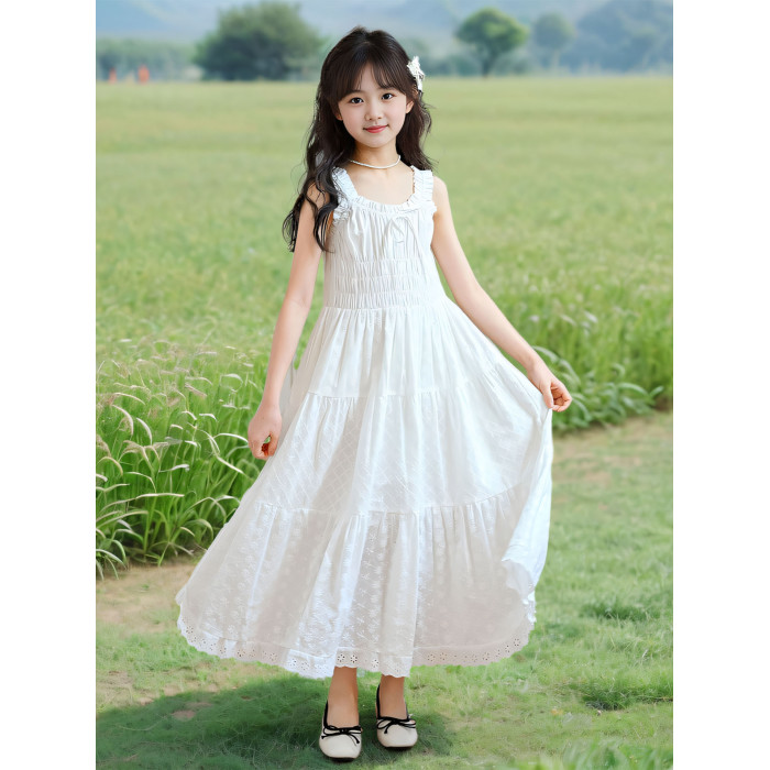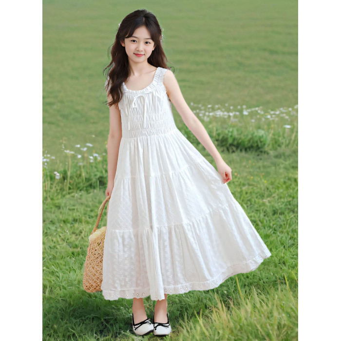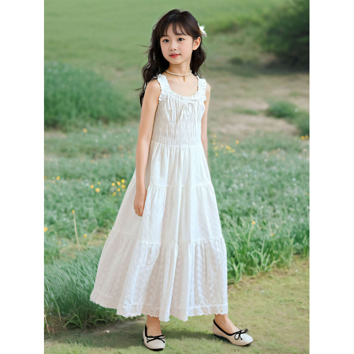 女童白色吊帶連衣裙夏裝新款女孩甜美高級感公主裙中大童超仙長裙