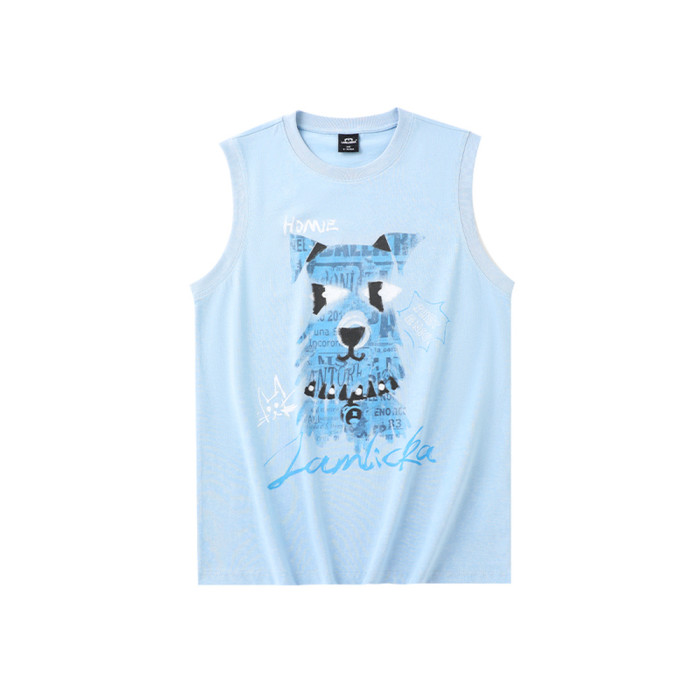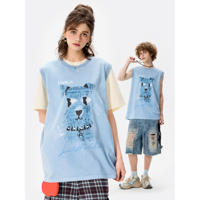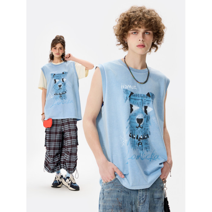LAMLICKA幾何小狗復古背心男款潮流痞帥無袖t恤藍色運動坎肩外穿