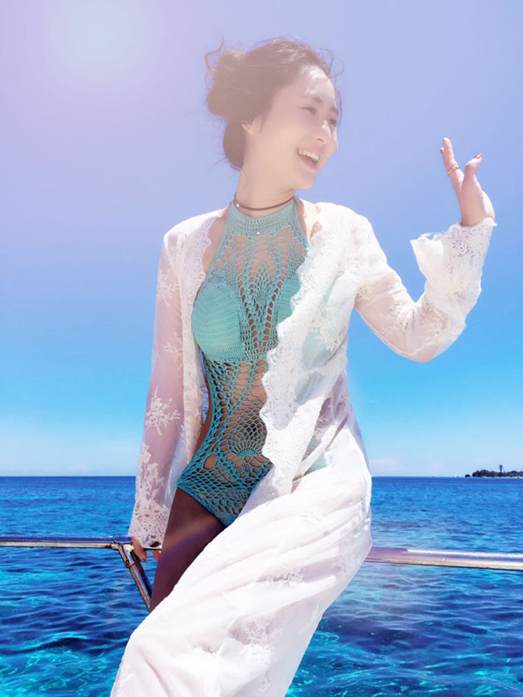 氣質網紗蕾絲長袖薄開衫仙氣防曬衣海邊度假性感中長款連衣裙夏女