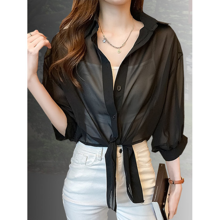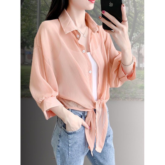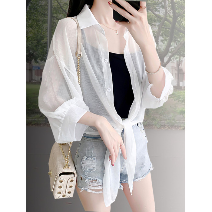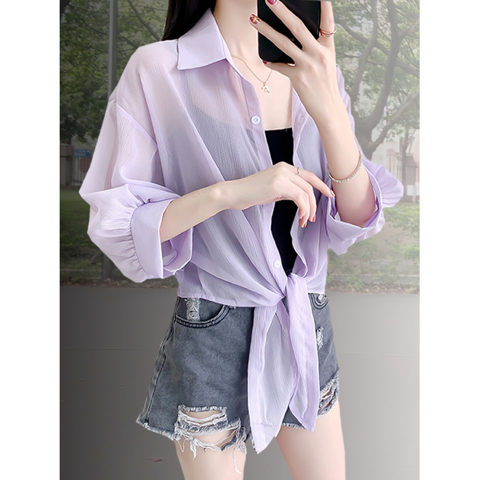 夏季配吊帶裙的雪紡小披肩防曬衣女帶領子外搭開衫寬松女短款紗衣