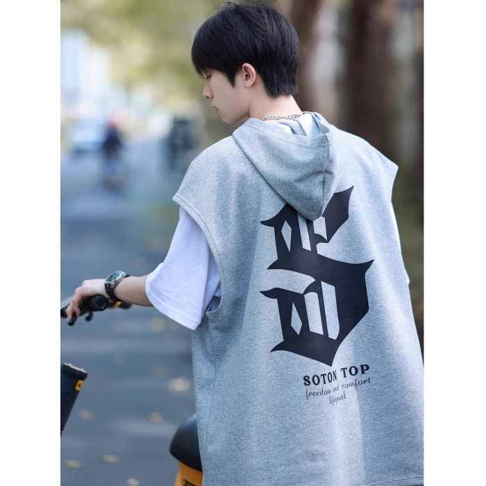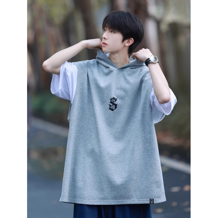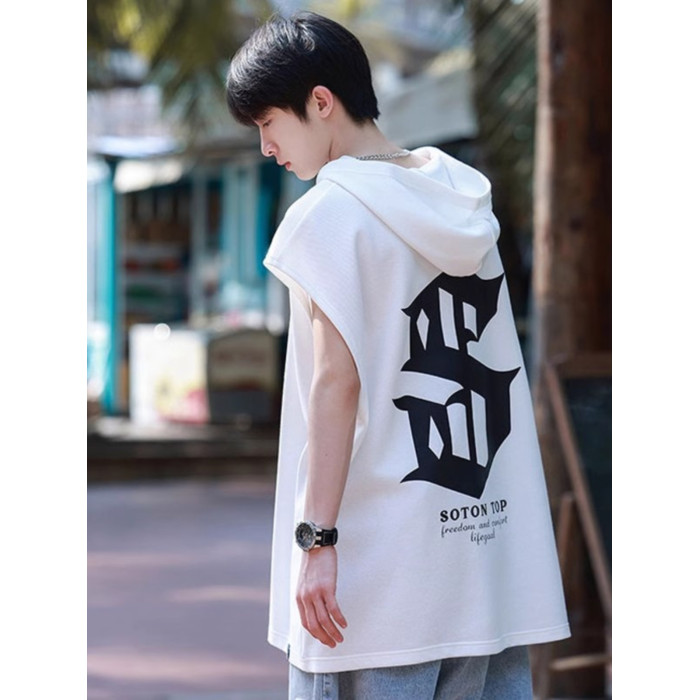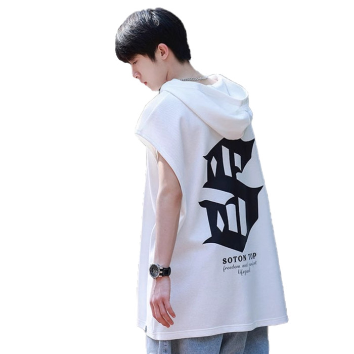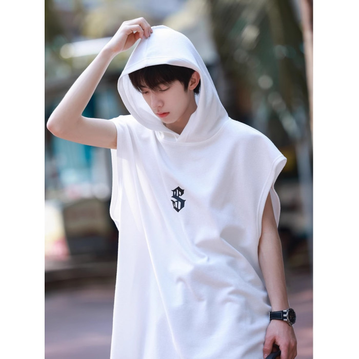倉石一樹白色坎肩無袖連帽背心夏季美式短袖衛衣青少年帶帽子T恤