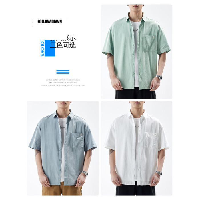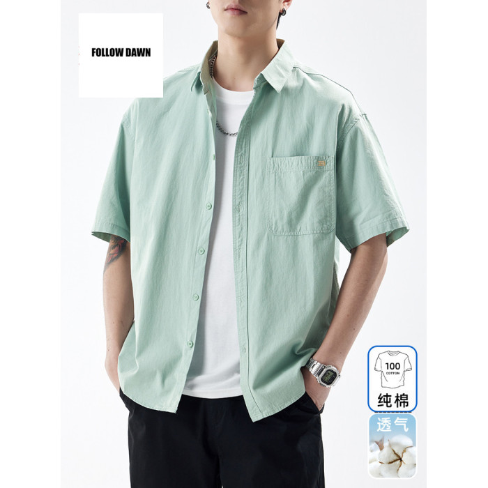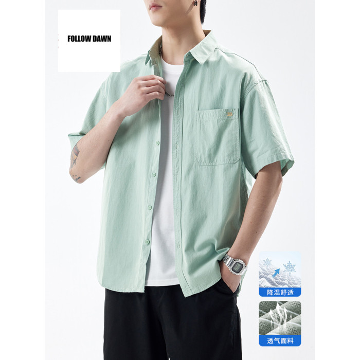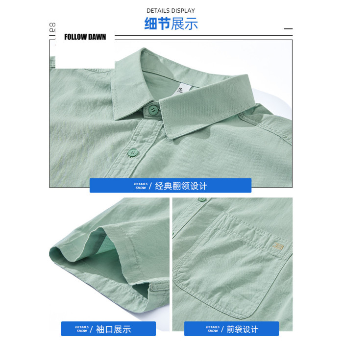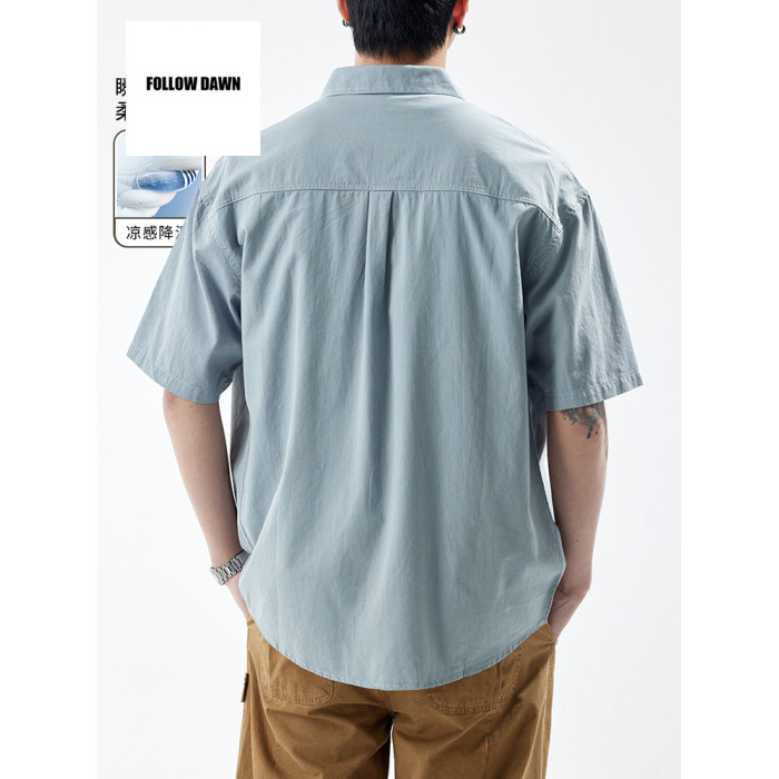 男士工裝純棉短袖襯衫商務休閒簡約外套純色設計感襯衣男
