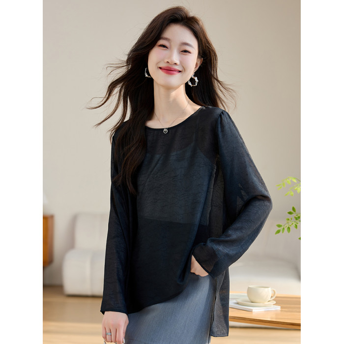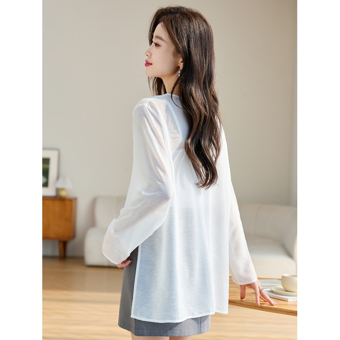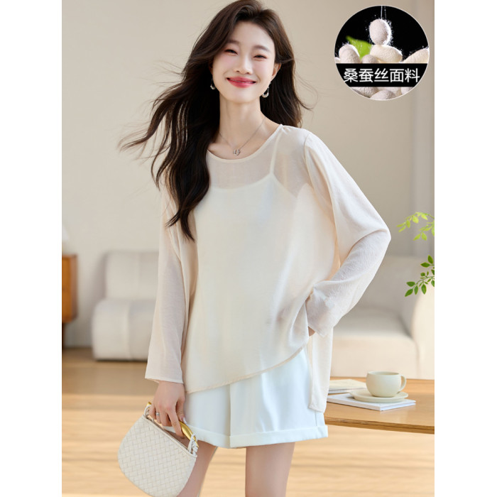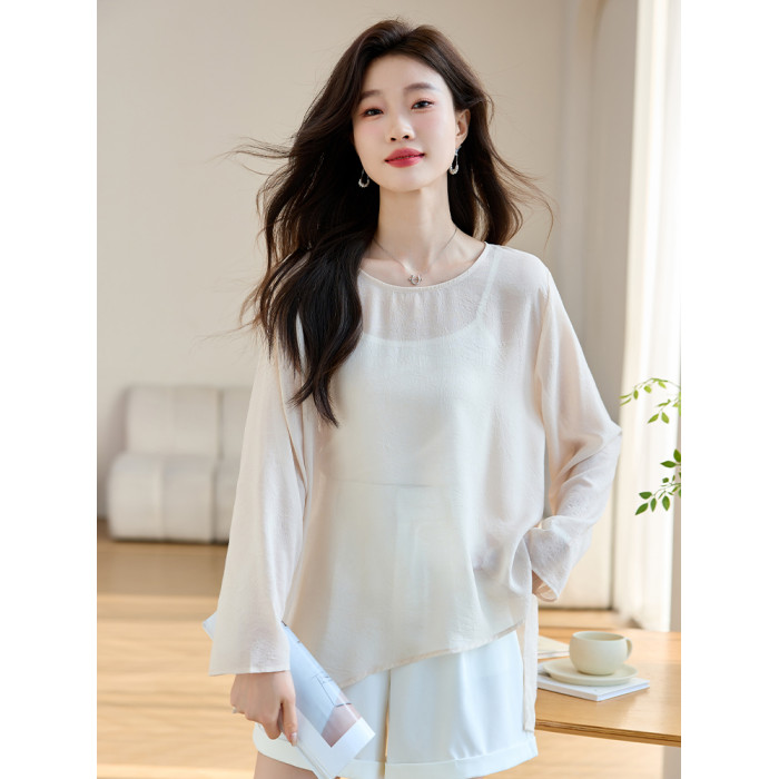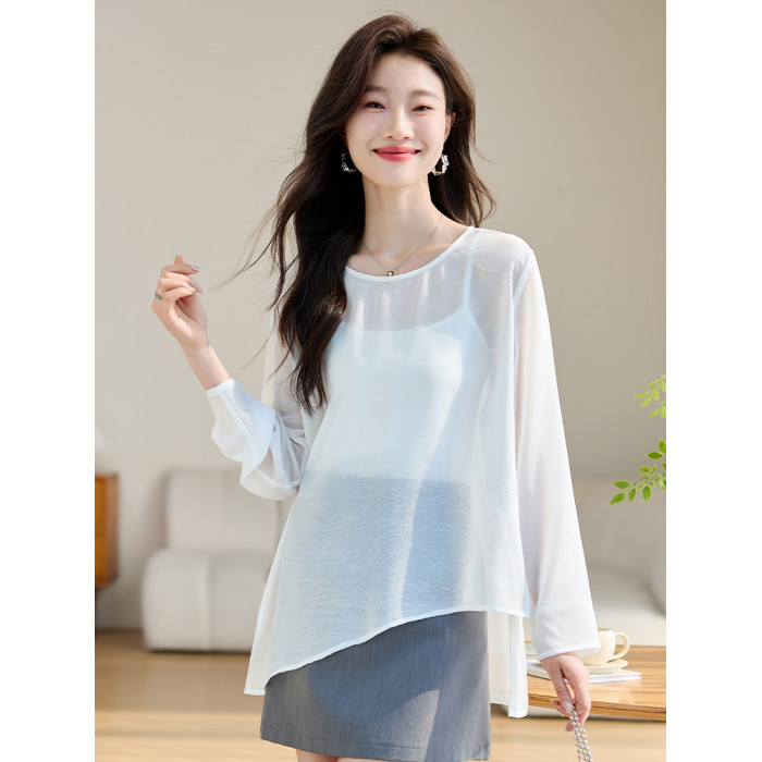 夏季高級輕薄微透圓領桑蠶絲防曬衣不對稱開叉設計長袖真絲罩衫潮
