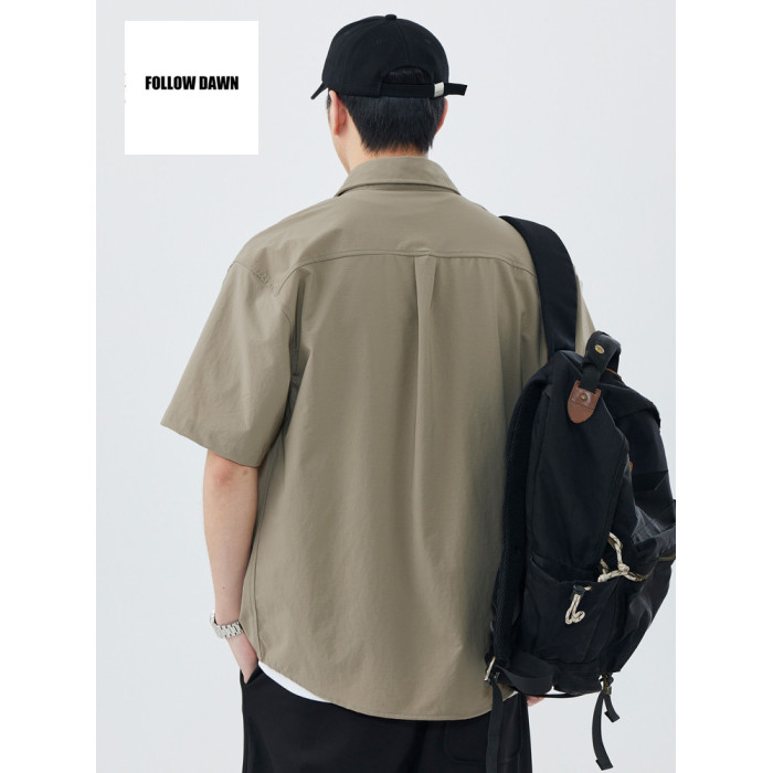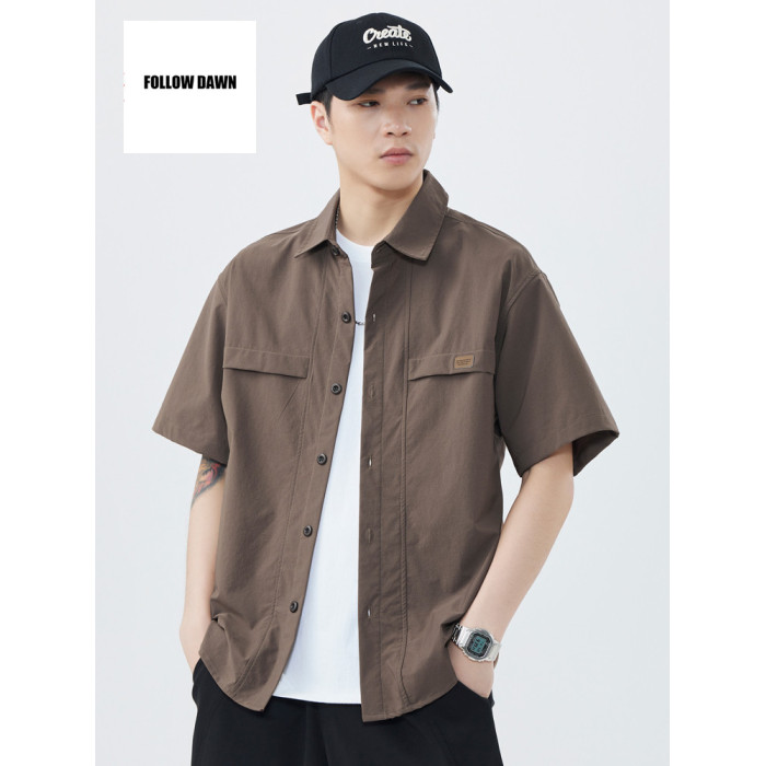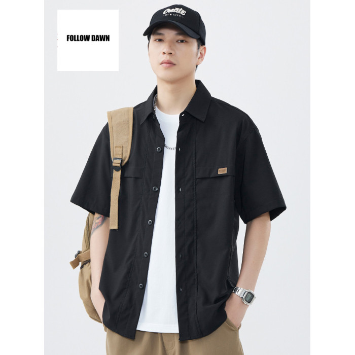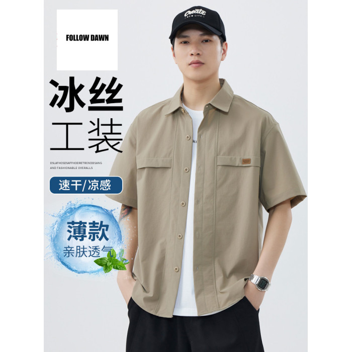 新款冰絲短袖襯衫男士夏季痞帥工裝薄款上衣潮流男生襯衣
