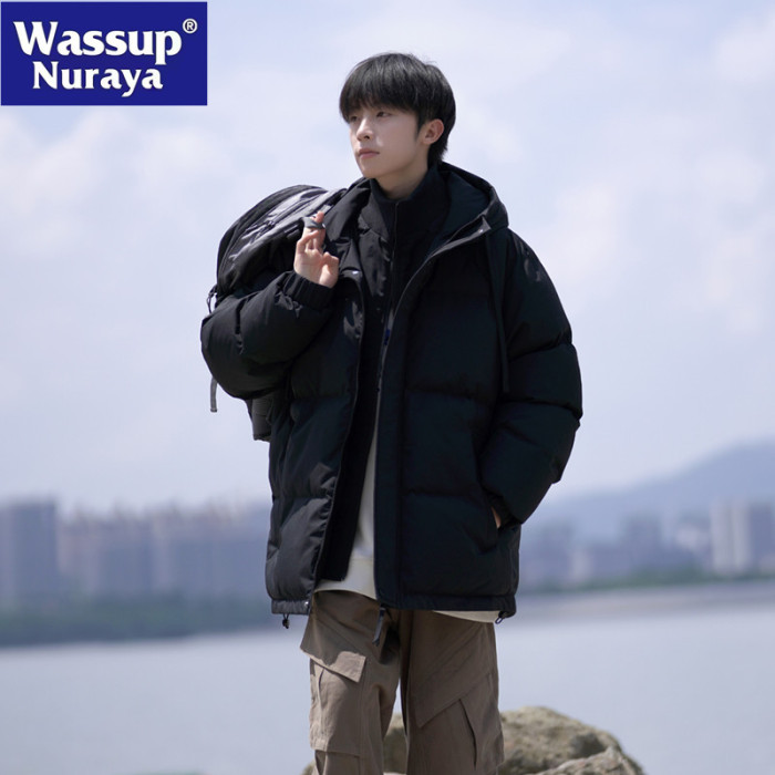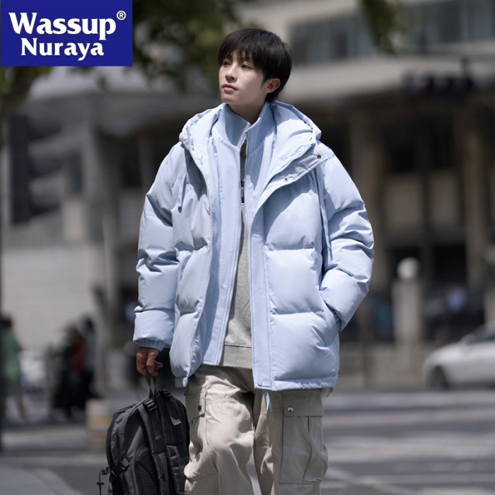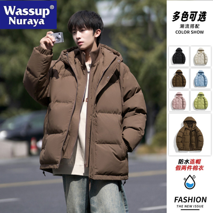 WASSUP NURAYA假兩件棉服男士冬季休閒加厚棉衣外套潮流連帽棉襖
