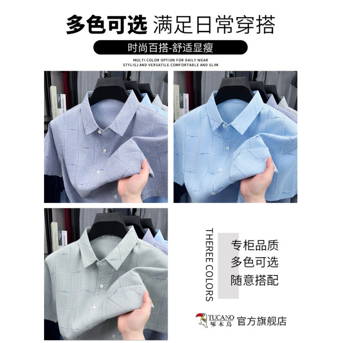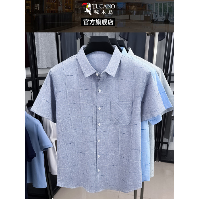 啄木鳥冰絲短袖襯衫休閒口袋款翻領格子襯衣男夏季爸爸薄款上衣C