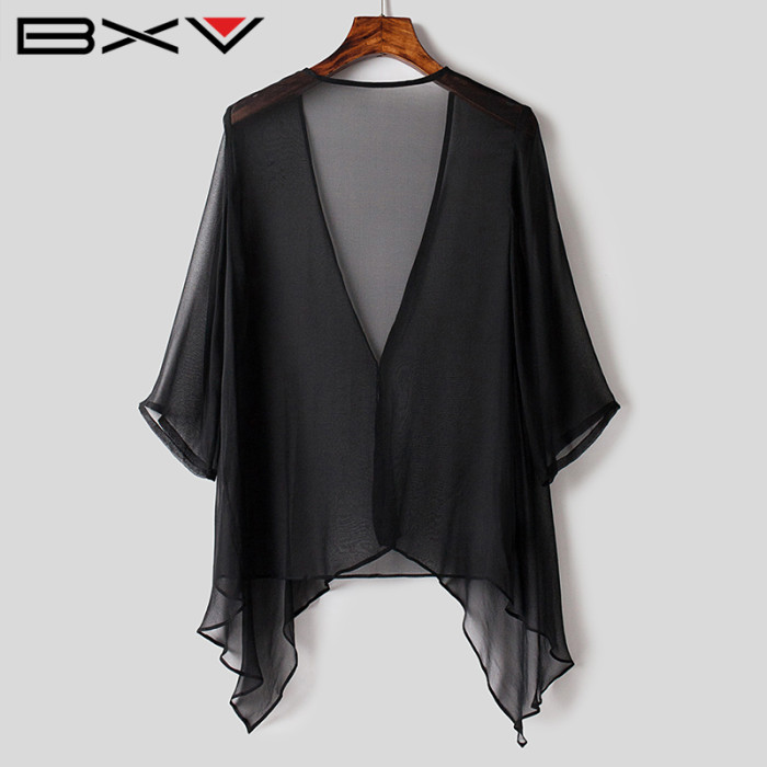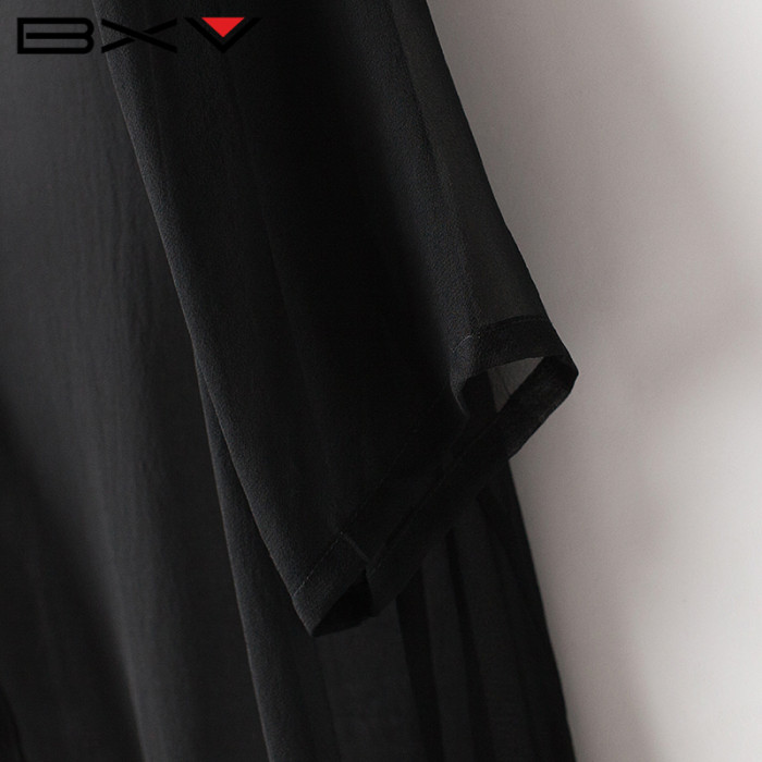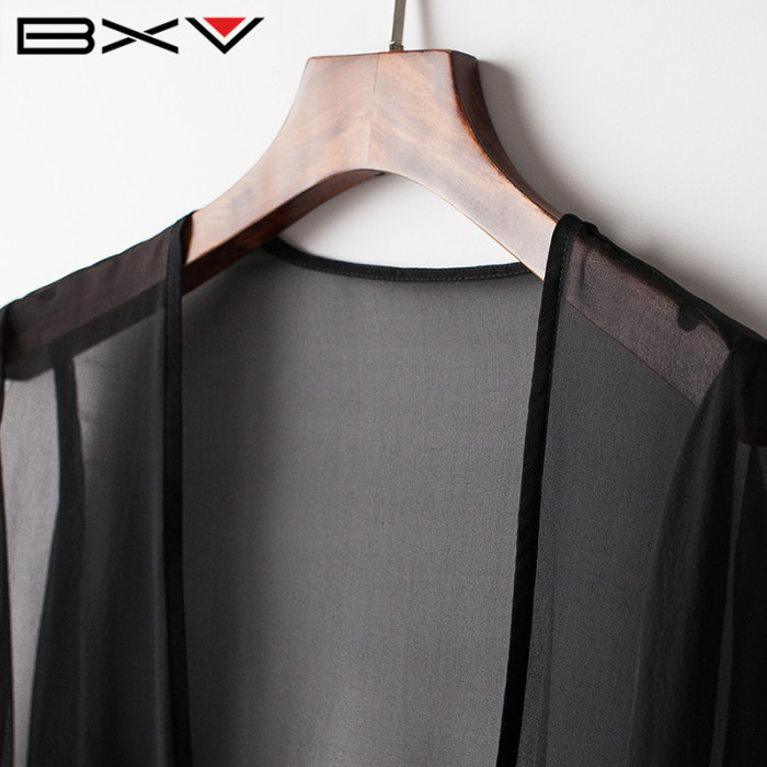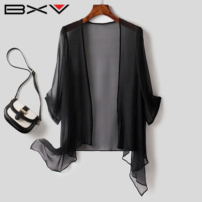 BXV黑色真絲上裝女2025夏季新款桑蠶絲防曬衣飄逸開衫高級感外披