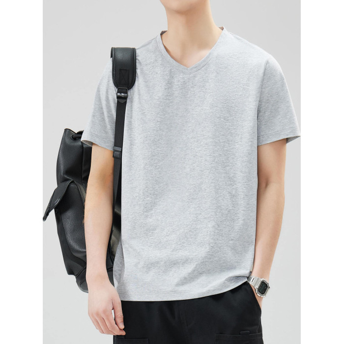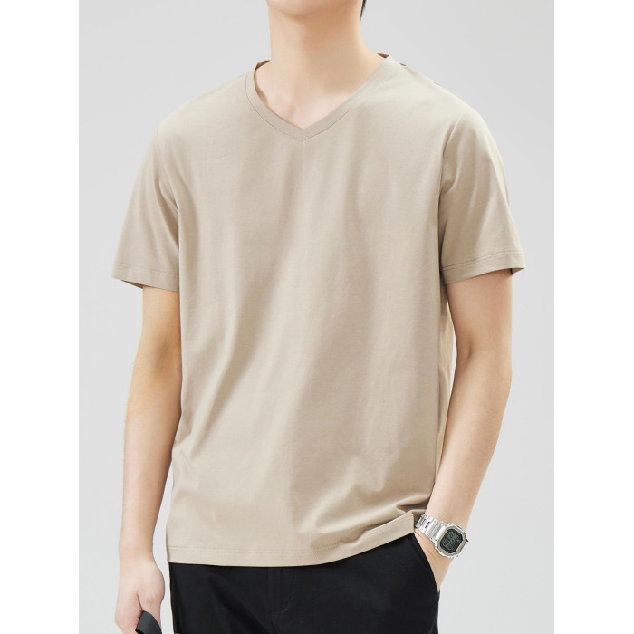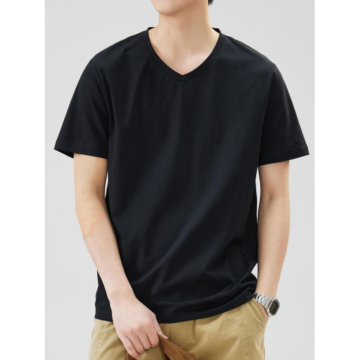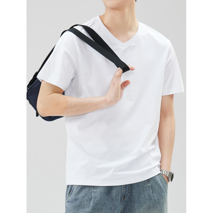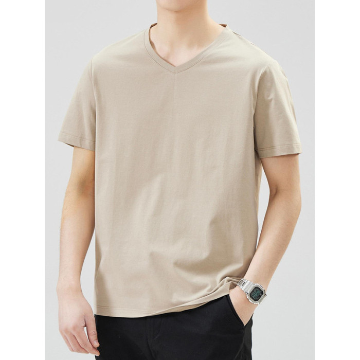 夏季潮牌V領短袖t恤男休閒寬松純色簡約百搭透氣半袖體恤衫
