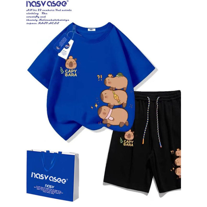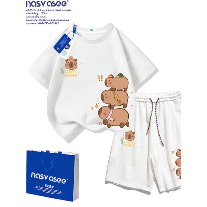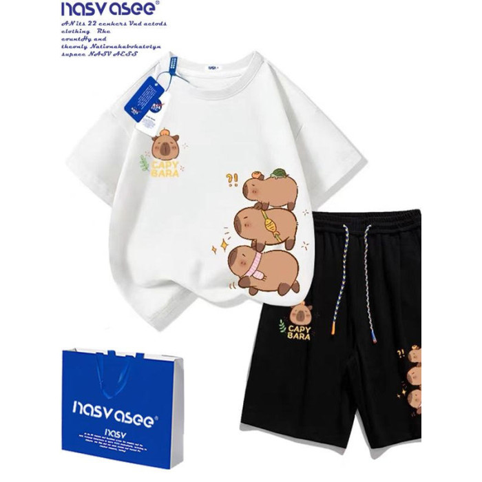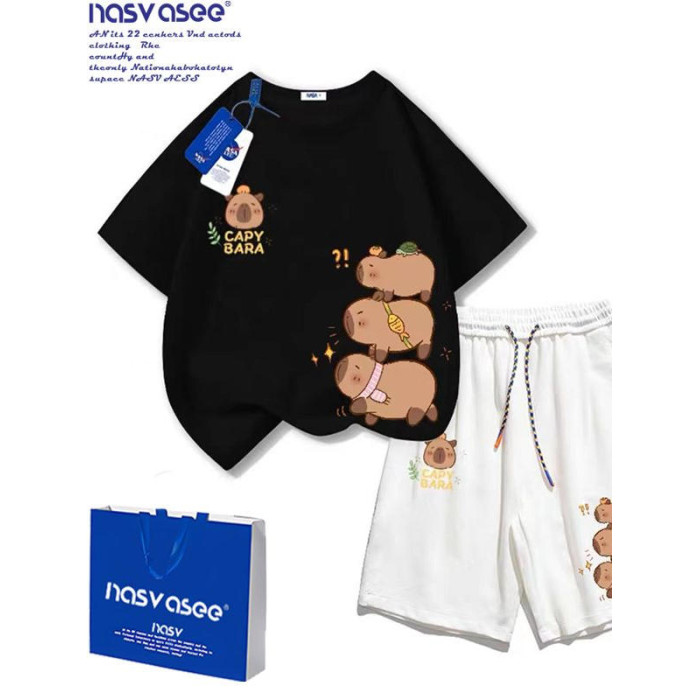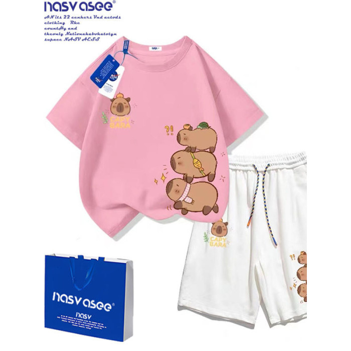 夏季卡通新款卡皮巴拉純棉短袖T恤短褲兩件套男女中大童洋氣套裝