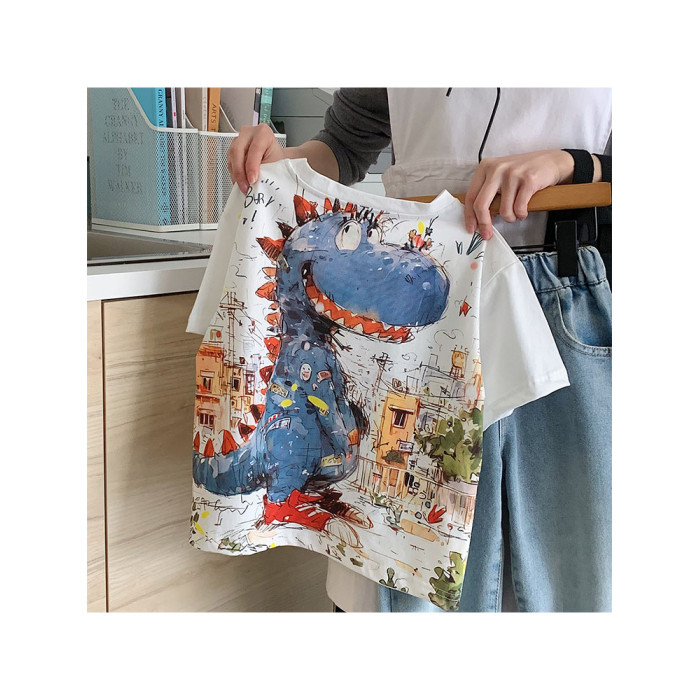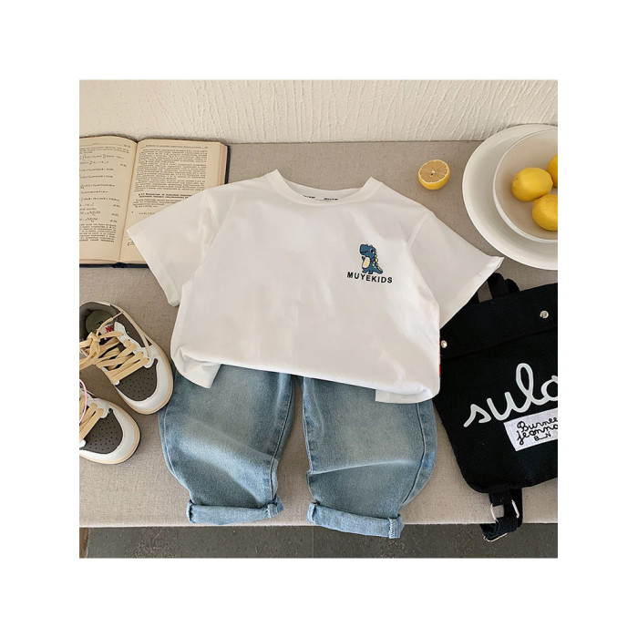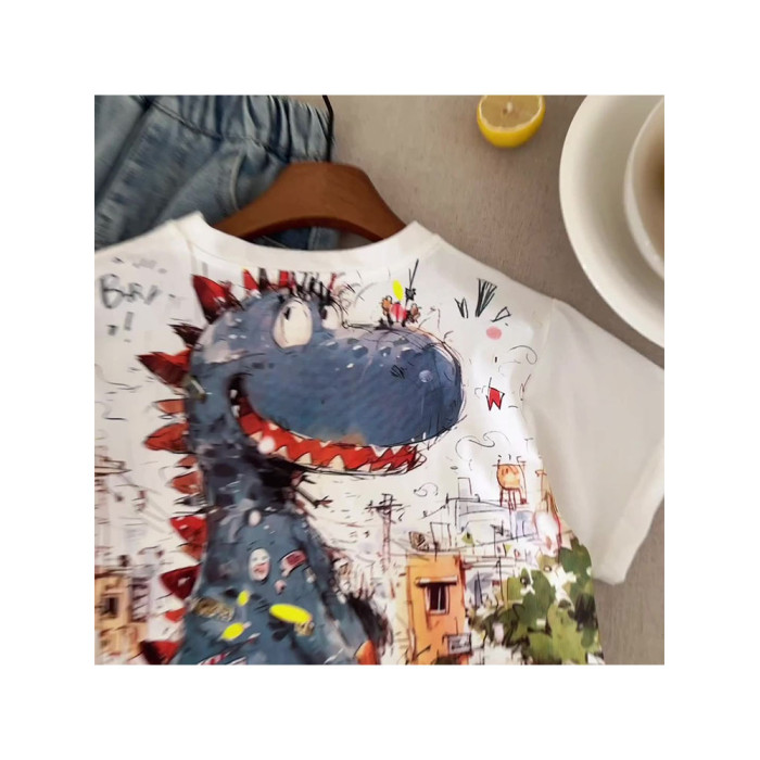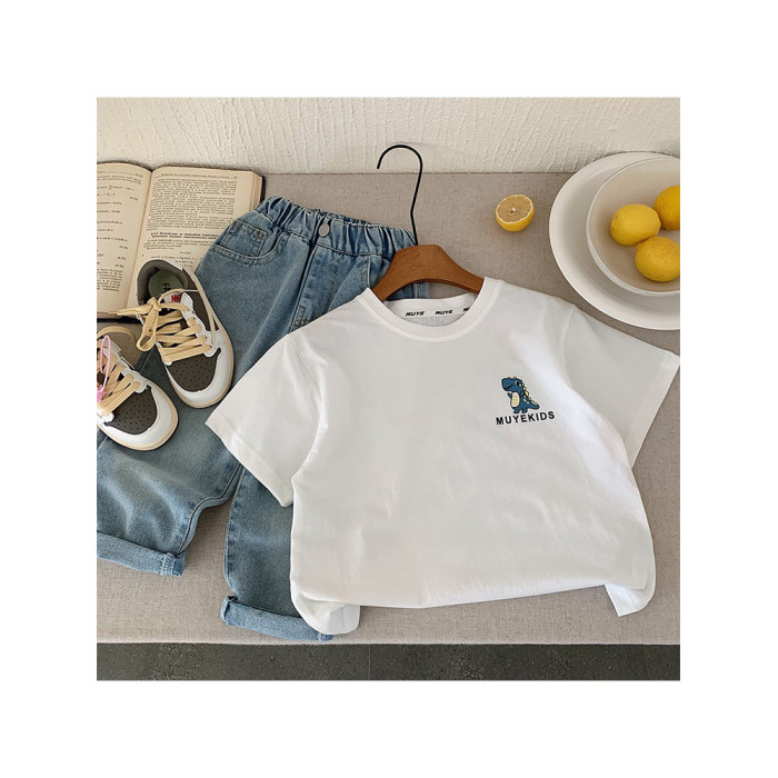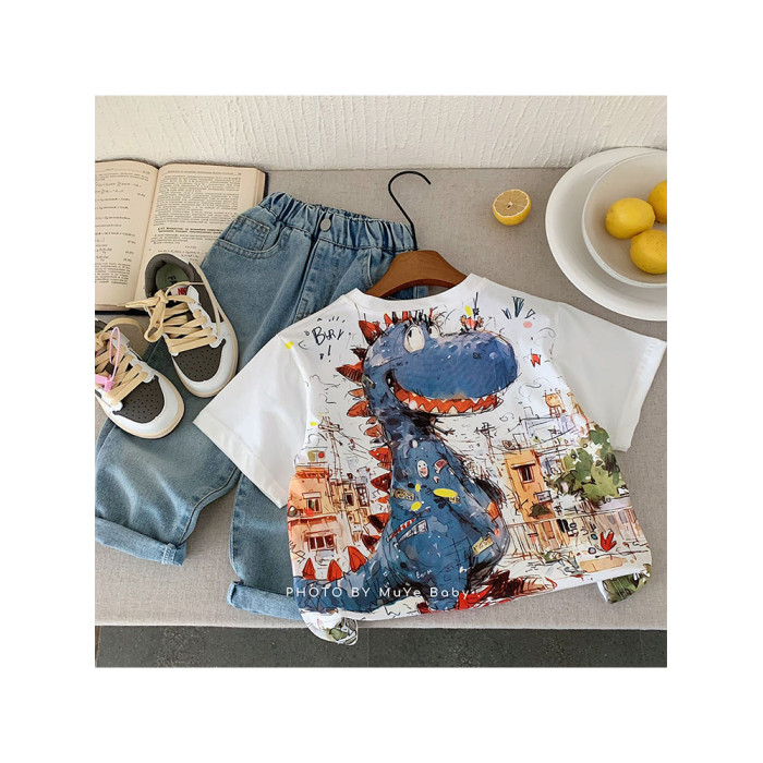 兒童短袖T恤夏季新款韓版純棉男童卡通恐龍印花圓領上衣寶寶體恤