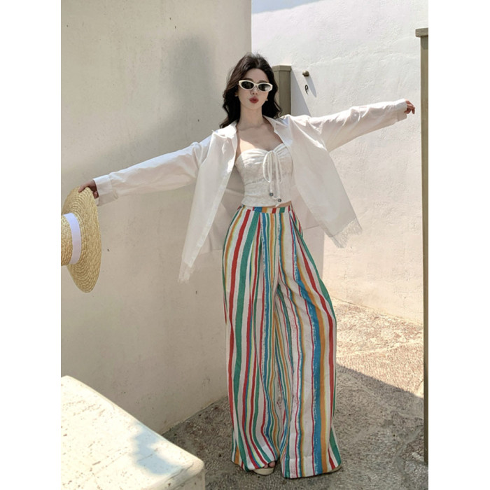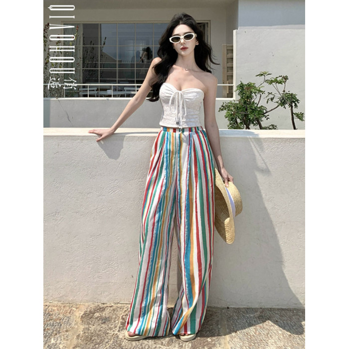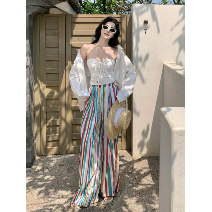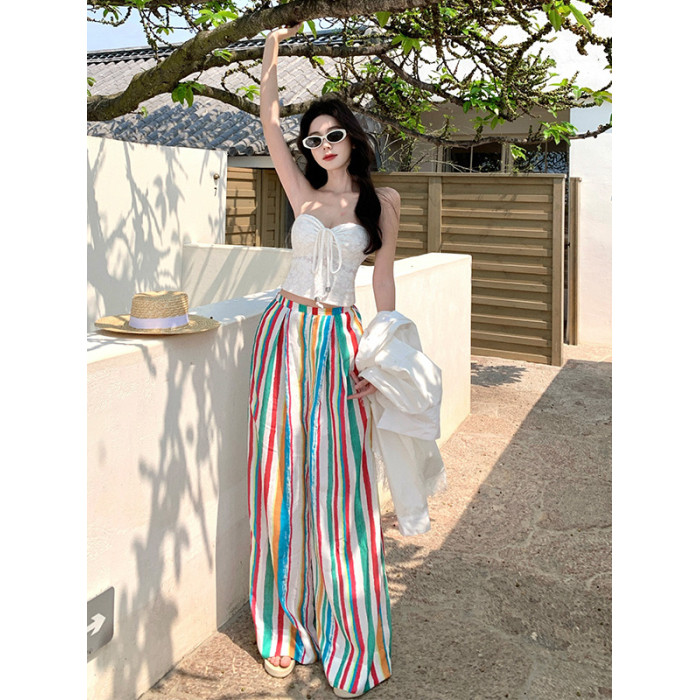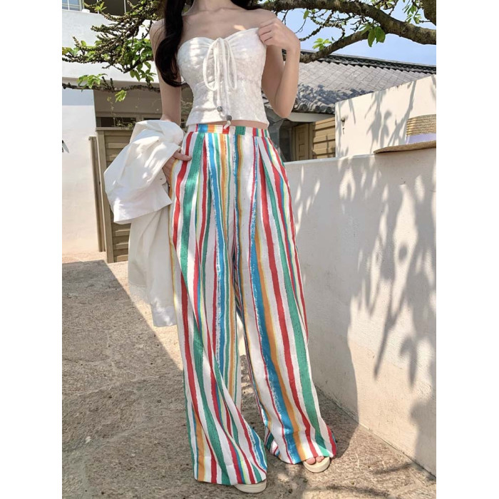 颯擼/多巴胺濶腿褲女夏季長褲彩色條紋高腰顯瘦褲子慵懶風沙灘褲