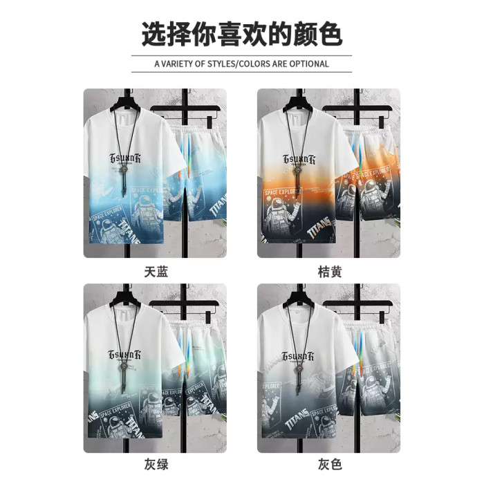 啄木鳥短袖套裝男2025夏季新款短褲漸變色休閒運動冰絲兩件套T恤